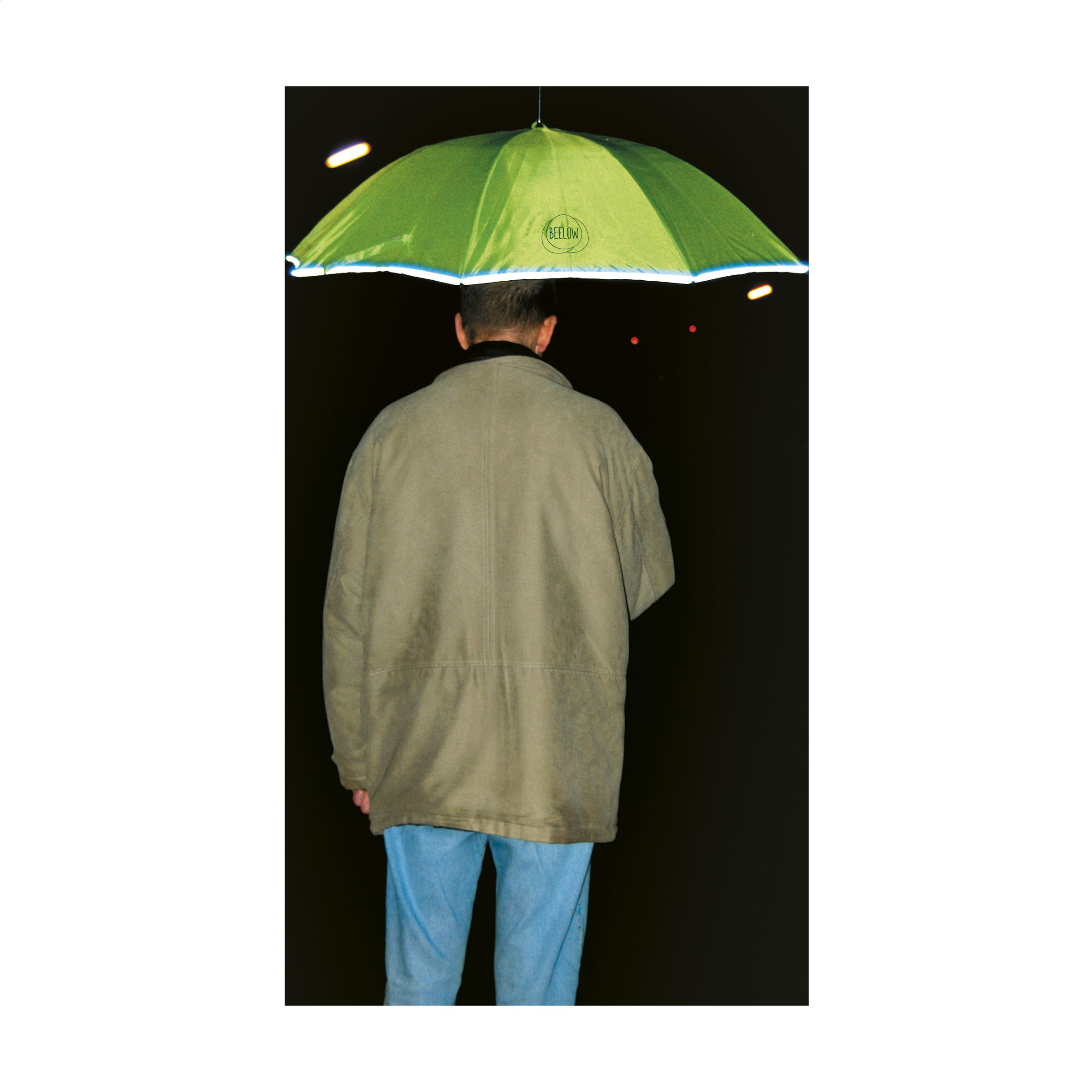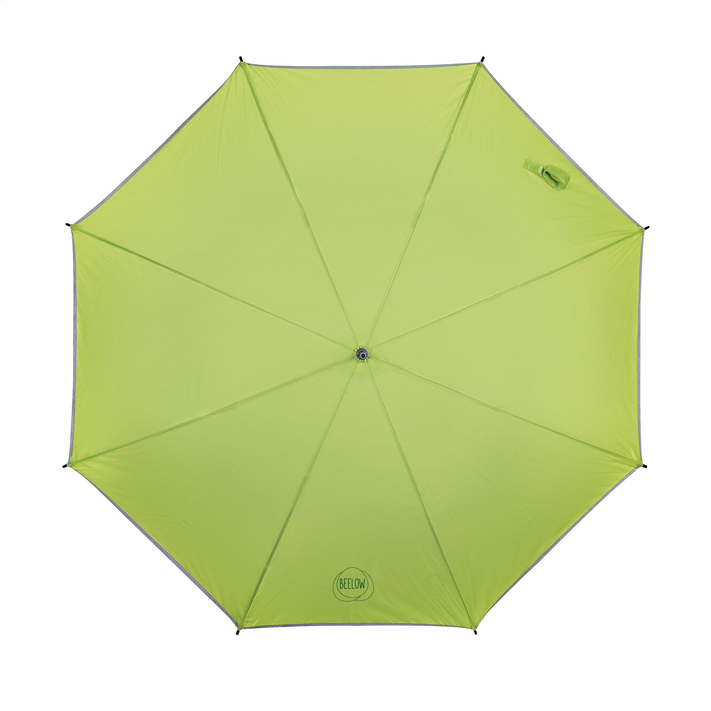 Lightweight storm proof umbrella with reflective trim, 190T polyester canopy, fibreglass frame, metal shaft, soft handle and velcro fastener.