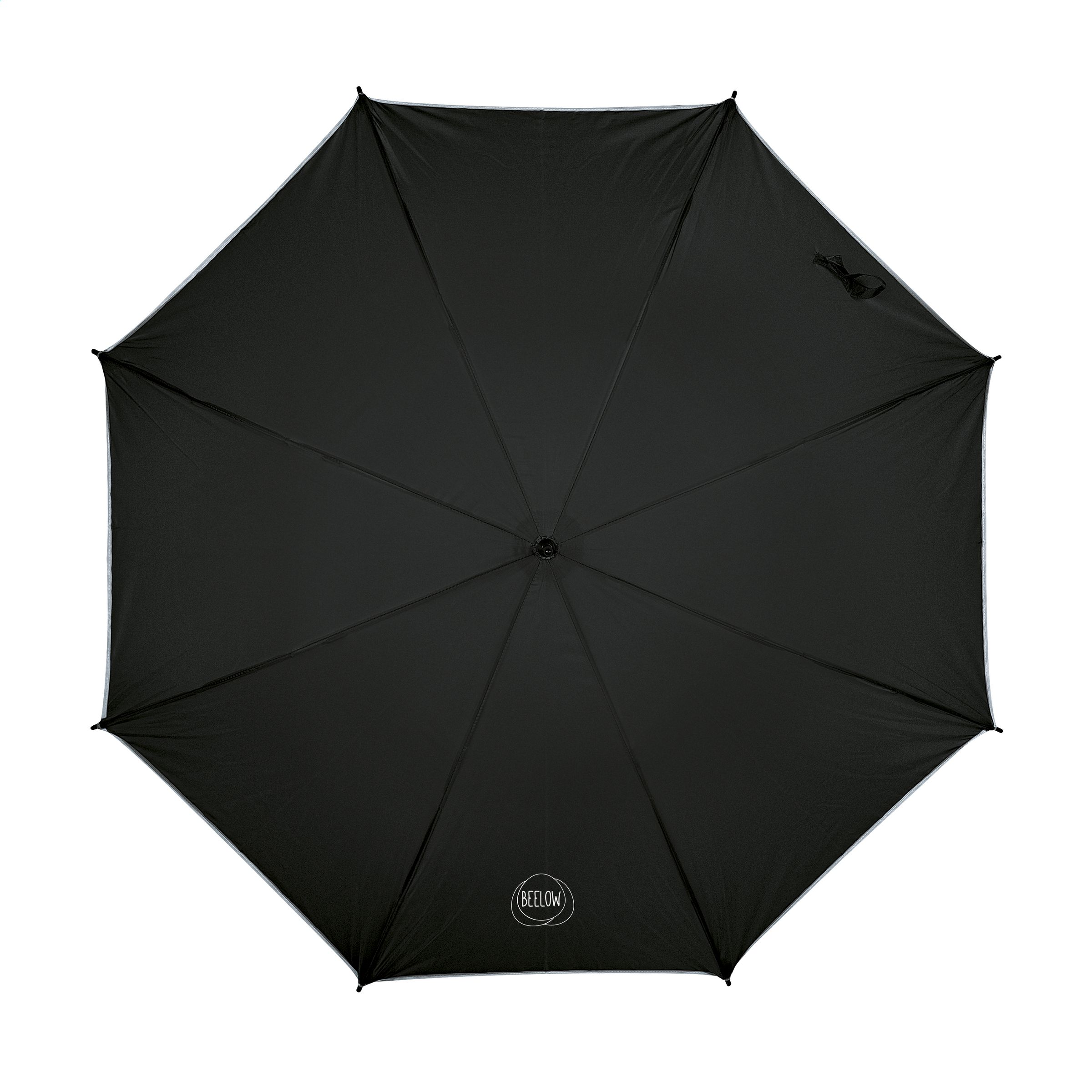 Lightweight storm proof umbrella with reflective trim, 190T polyester canopy, fibreglass frame, metal shaft, soft handle and velcro fastener.