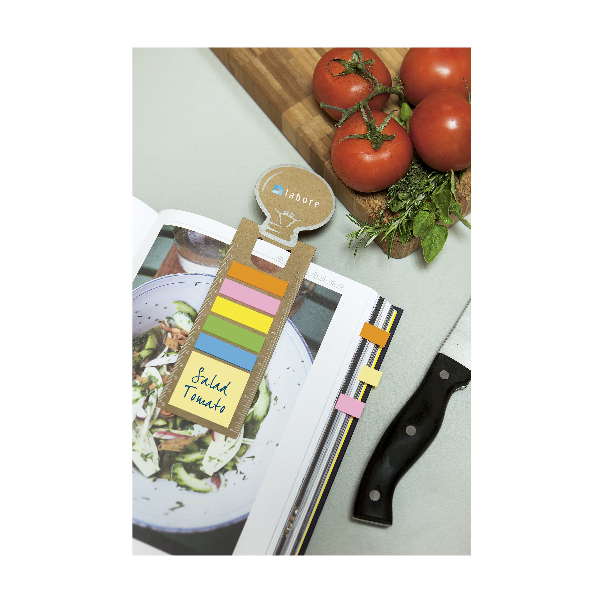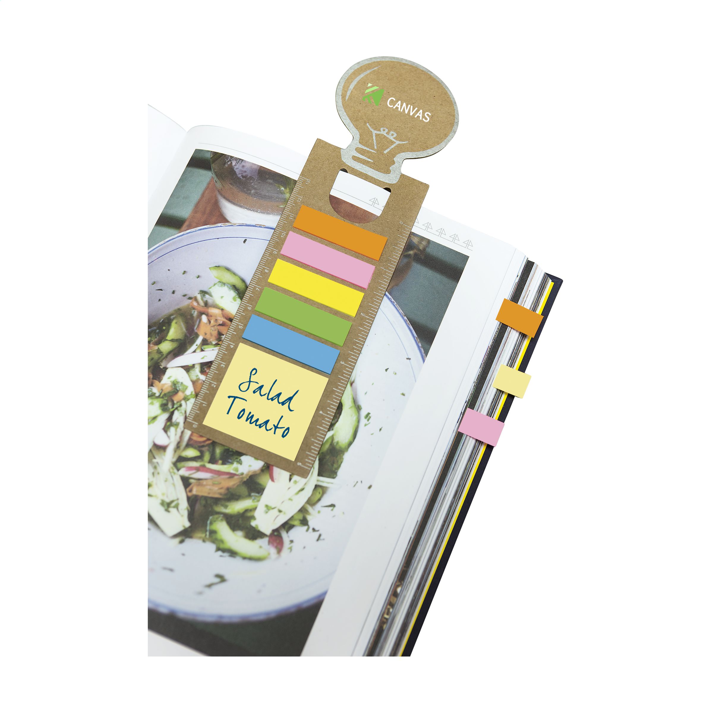 Bookmarker made of sturdy cardboard with 15 sticky sheets, 75 writable marking stickers and ruler (length 13 cm/5 inches).