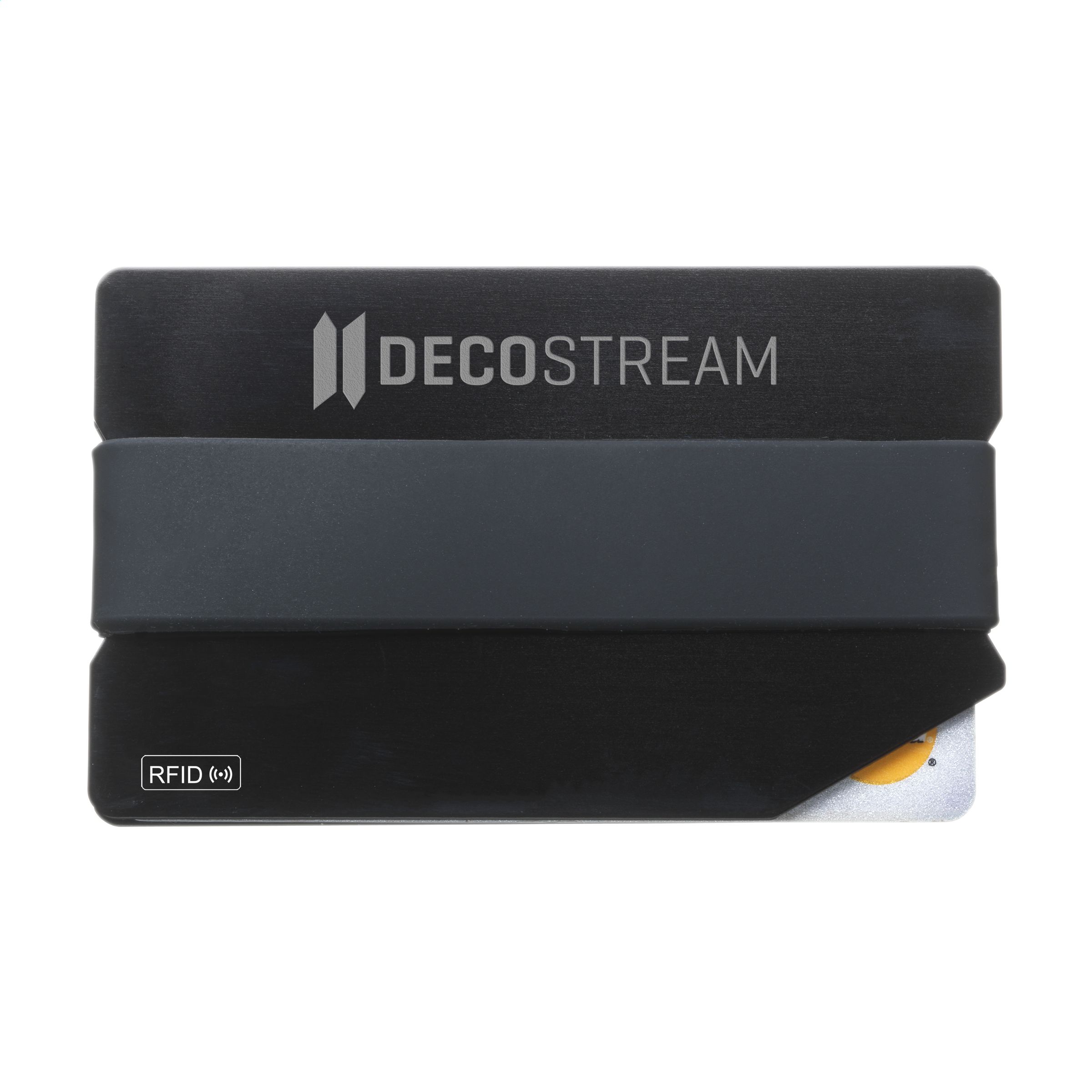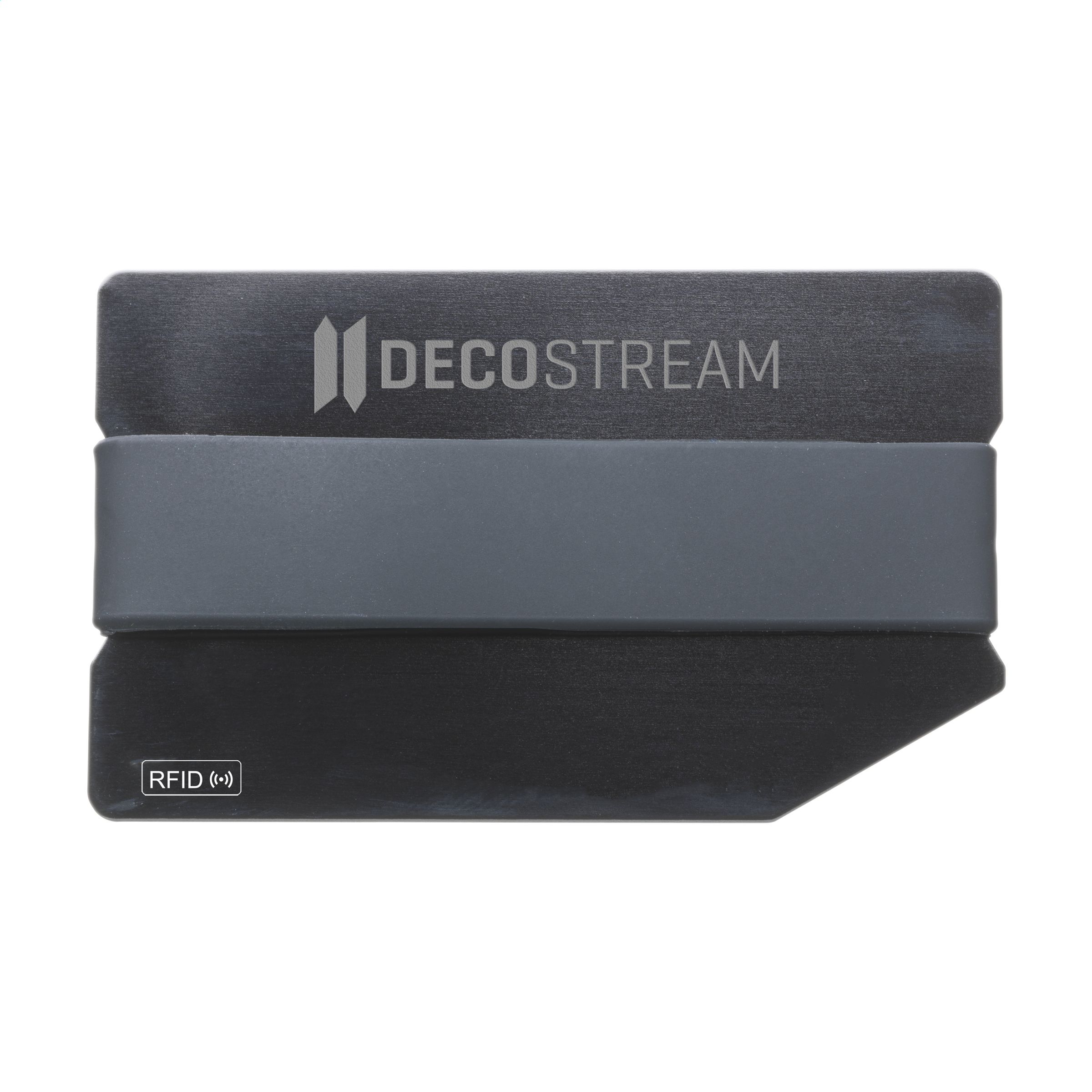 Trendy aluminium card holder with shiny finish and silicone elastic band. RFID protection technology to protect cards from identity theft, breaking or damage.