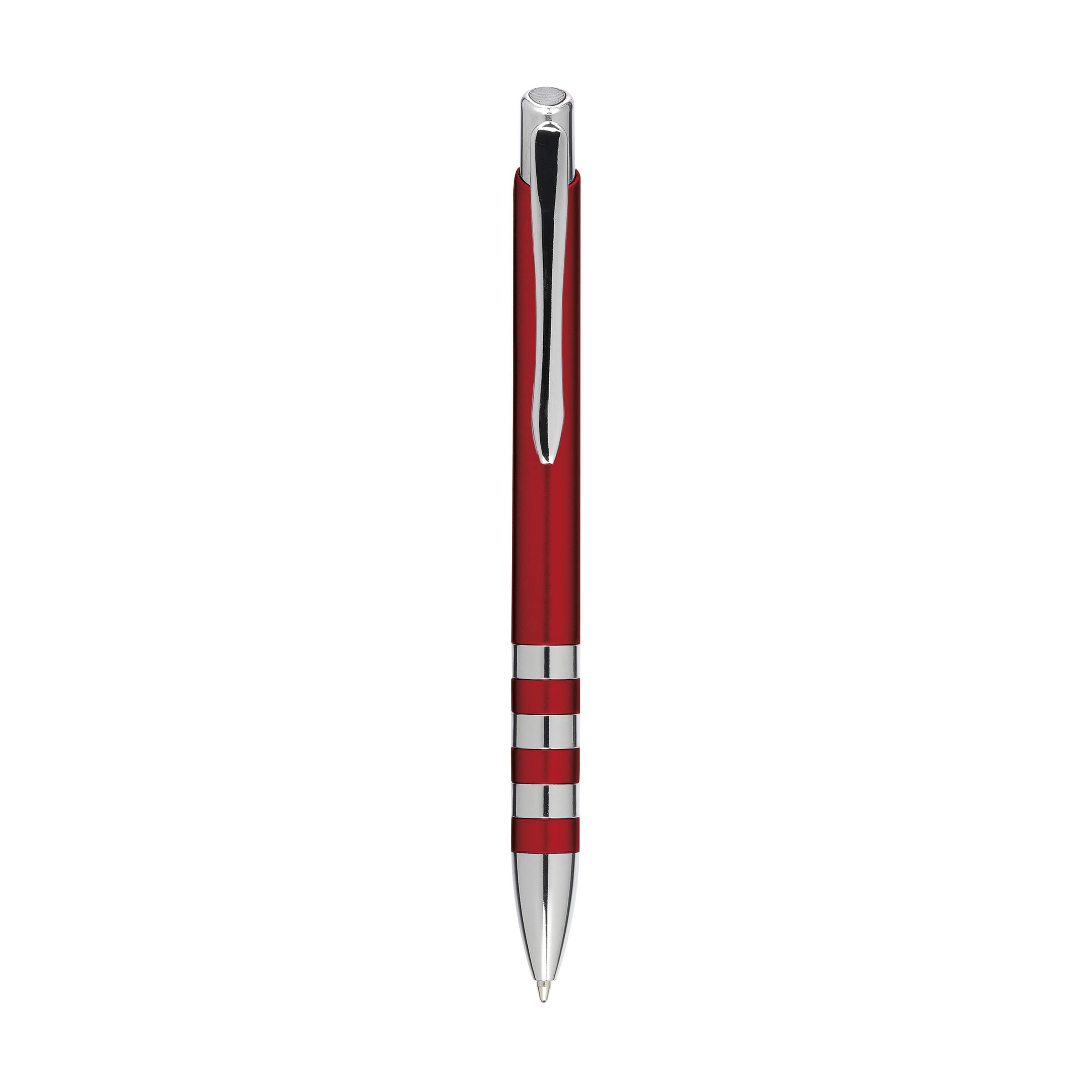 Blue ink ballpoint pen with metallic look barrel, metal clip, push button and shiny barrel rings.