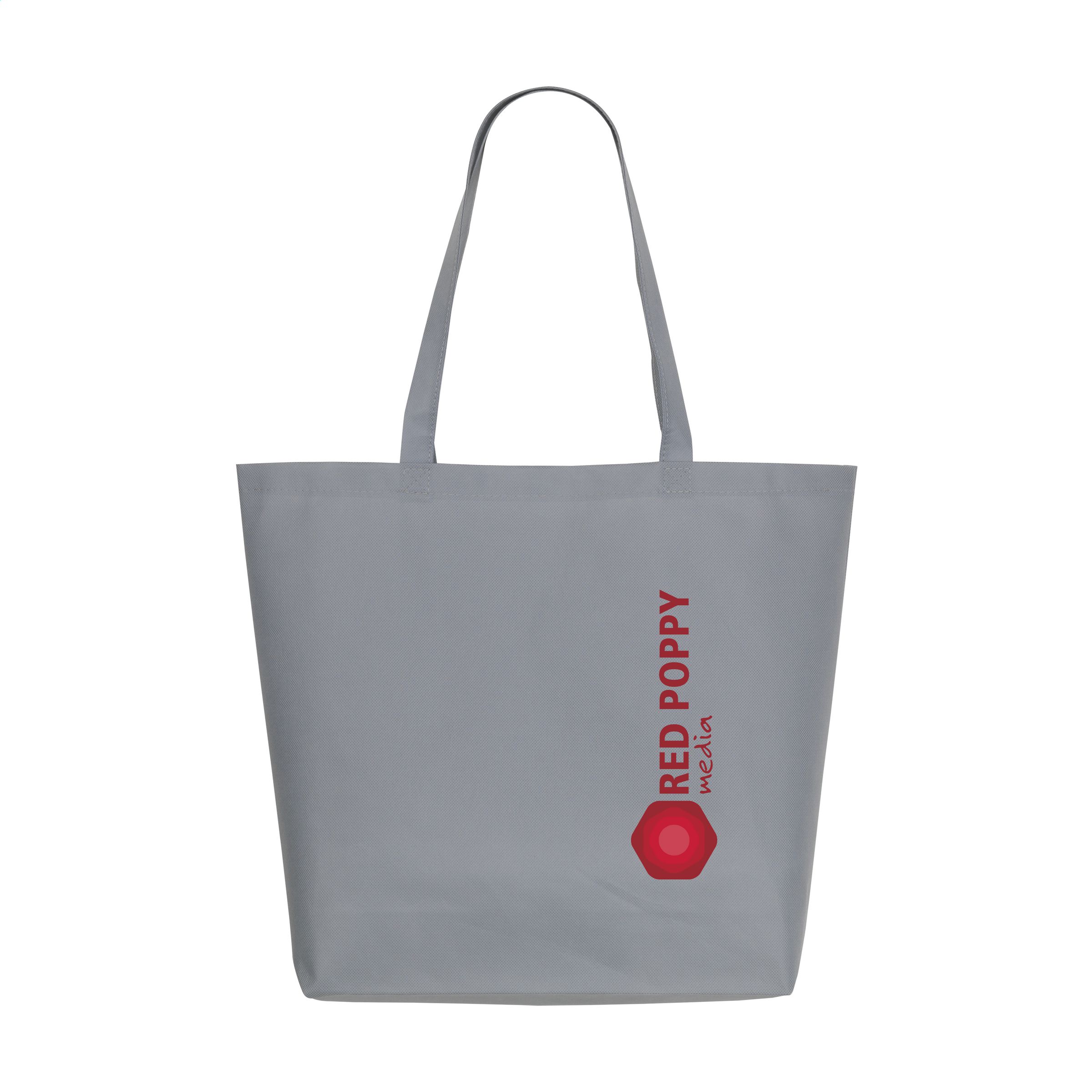 Large, non-woven shopping and beach bag (80 g/m²) with long handles. Broad model. Strong and light.