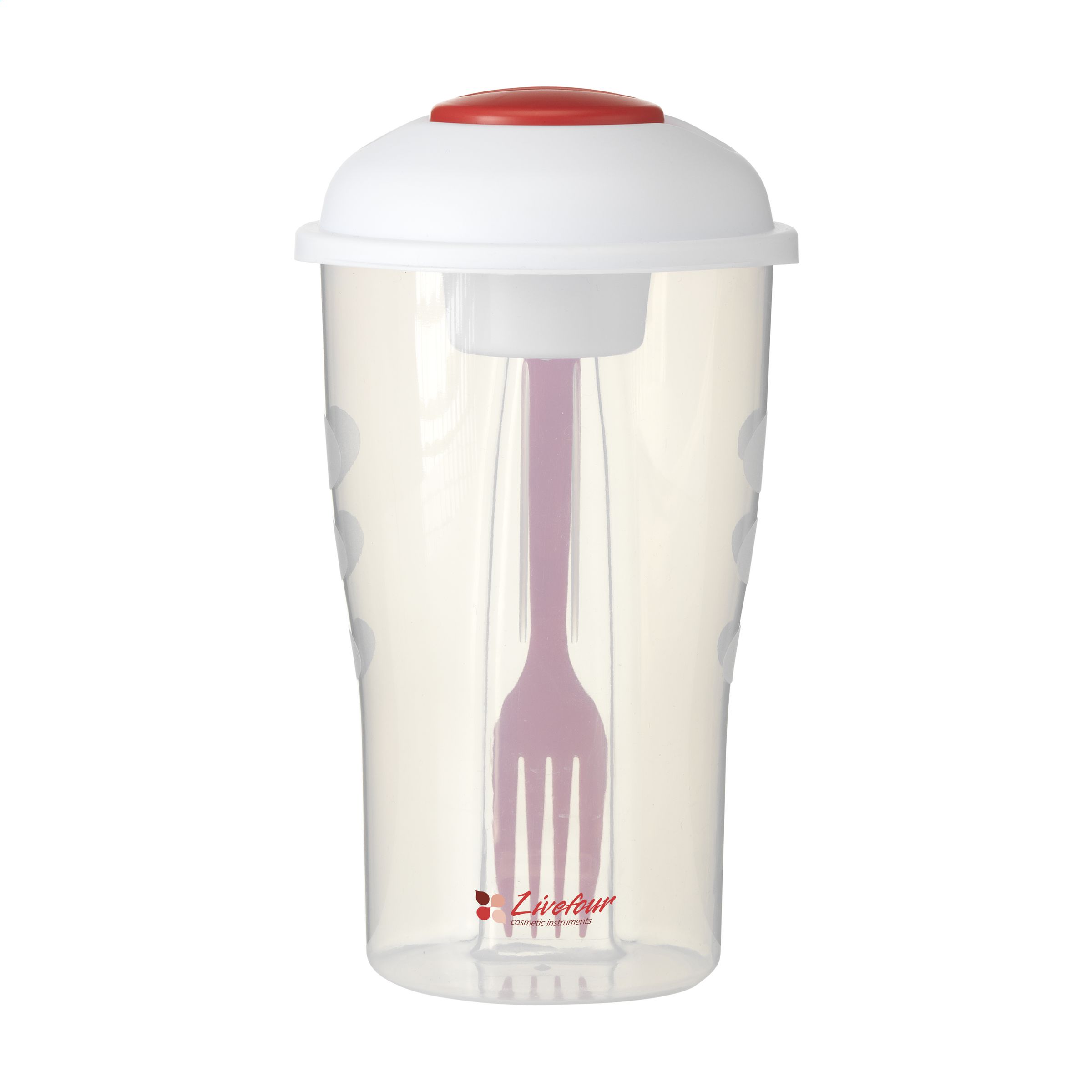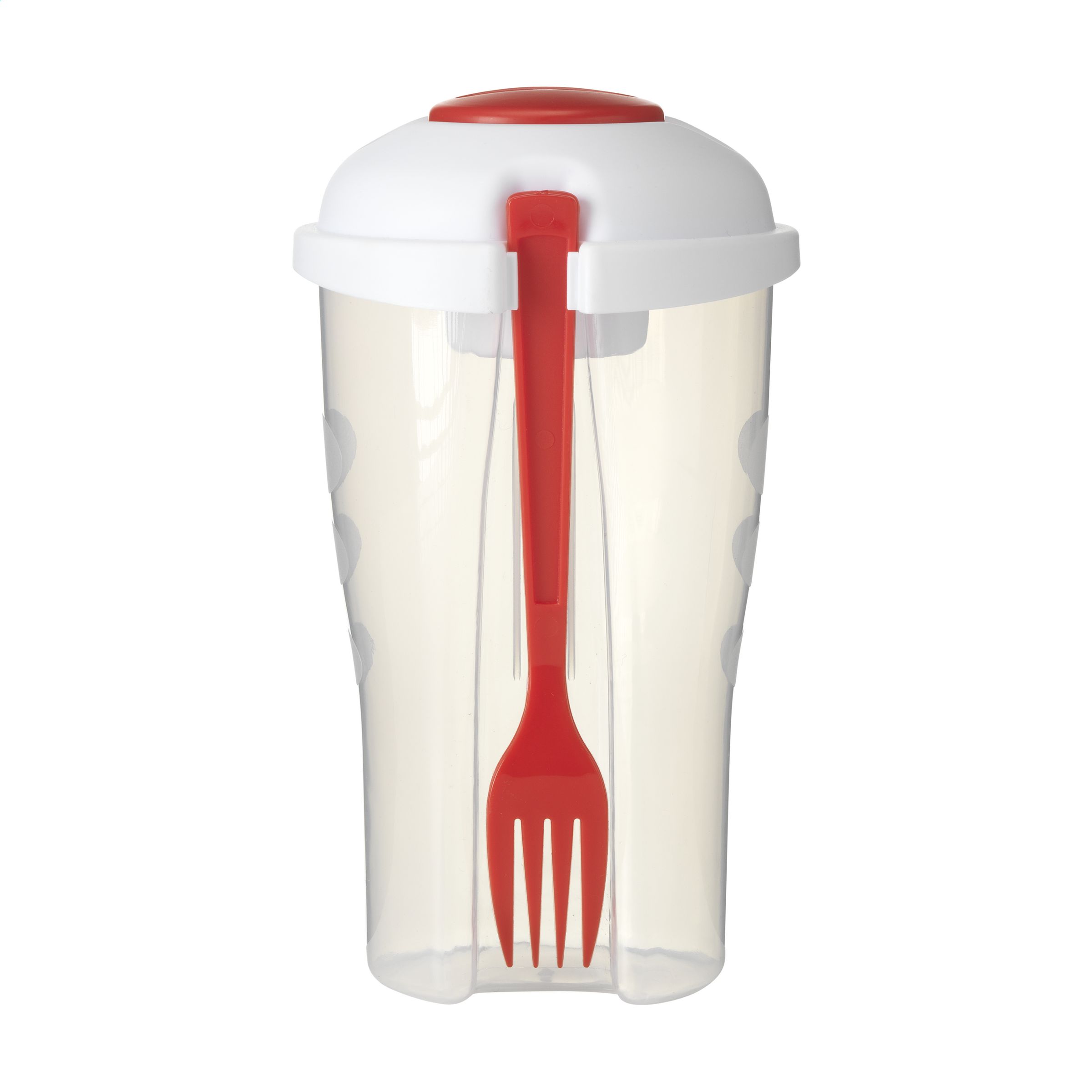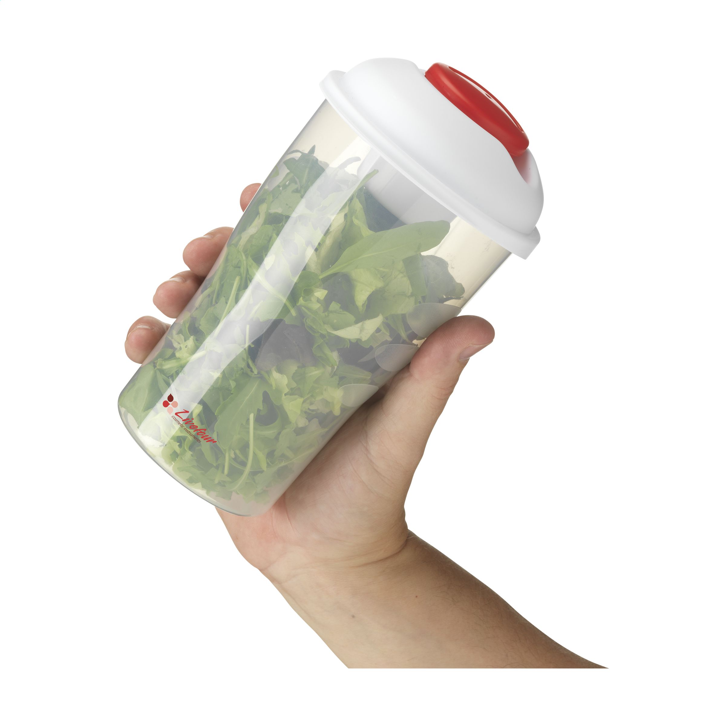 Salad shaker made of sturdy plastic. With removable lid, tray for dressing and fork. Also suitable for vegetable salads and pasta salads. Capacity 900 ml.