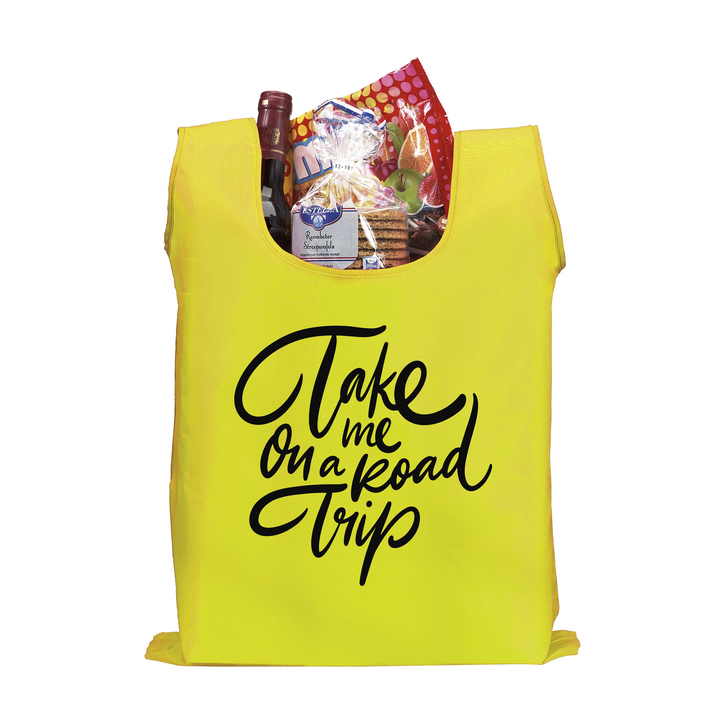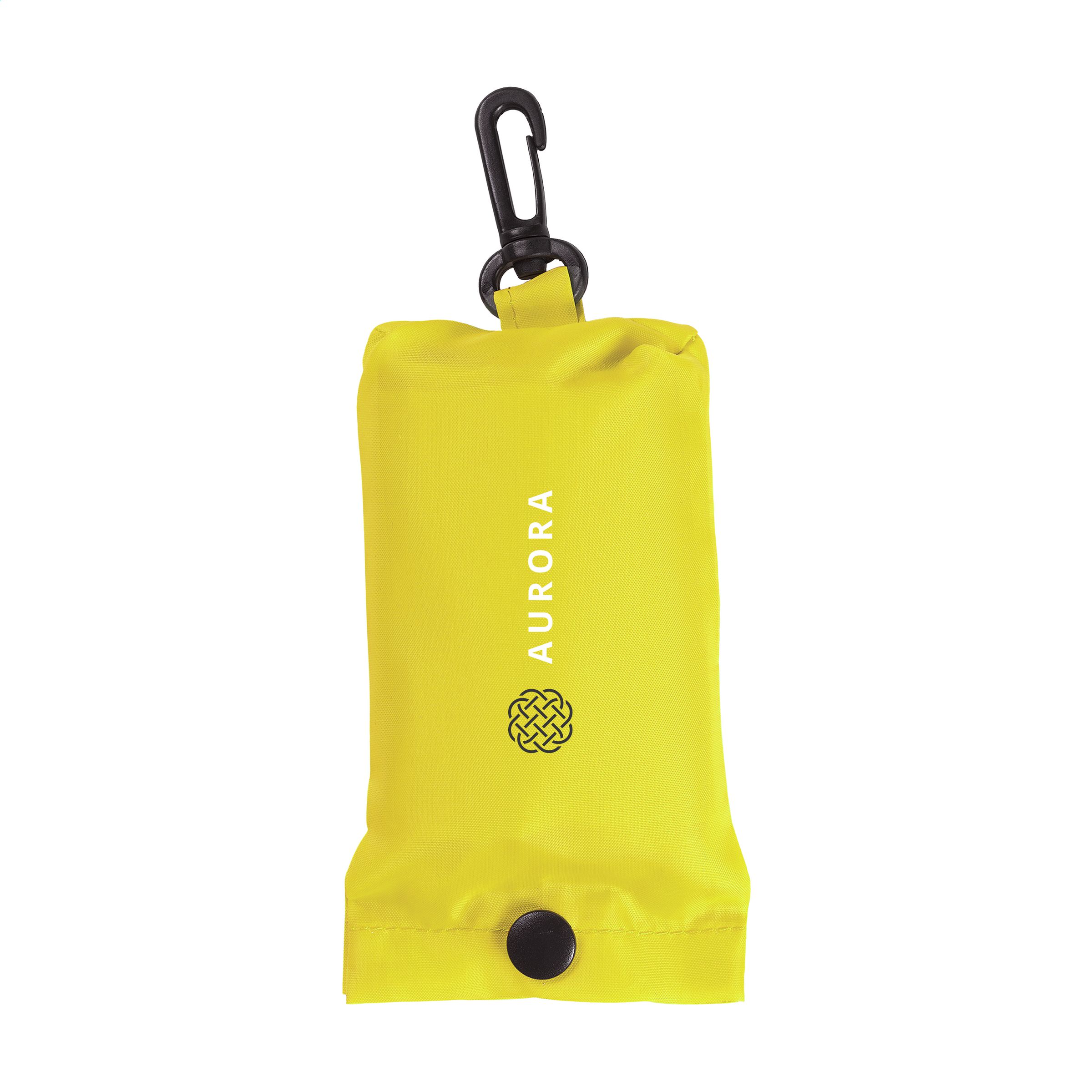 Foldable shopping bag made of 190T polyester. In a pouch with popper and carabiner hook. Meas. unfolded 53 x 38 cm.