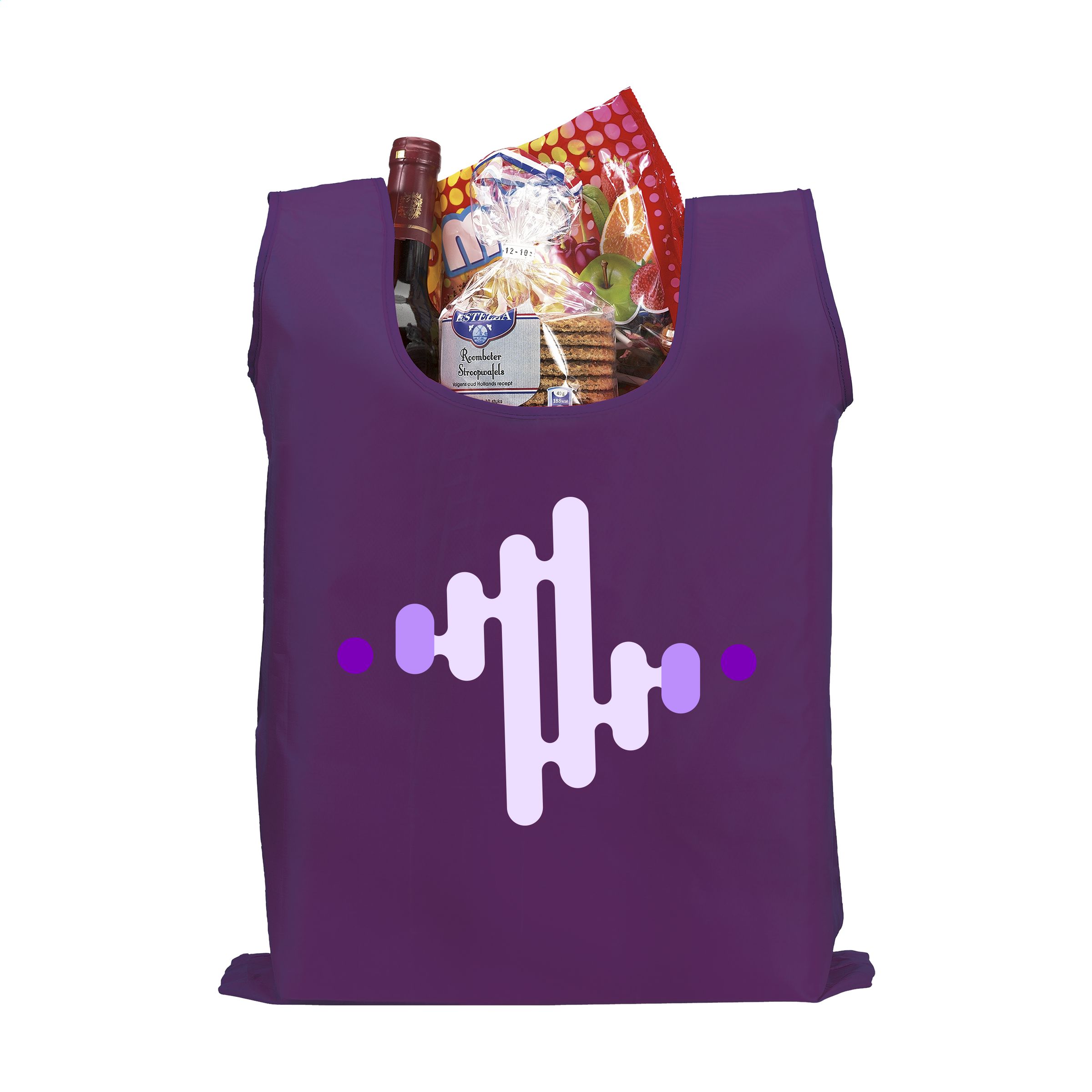Foldable shopping bag made of 190T polyester. In a pouch with popper and carabiner hook. Meas. unfolded 53 x 38 cm.
