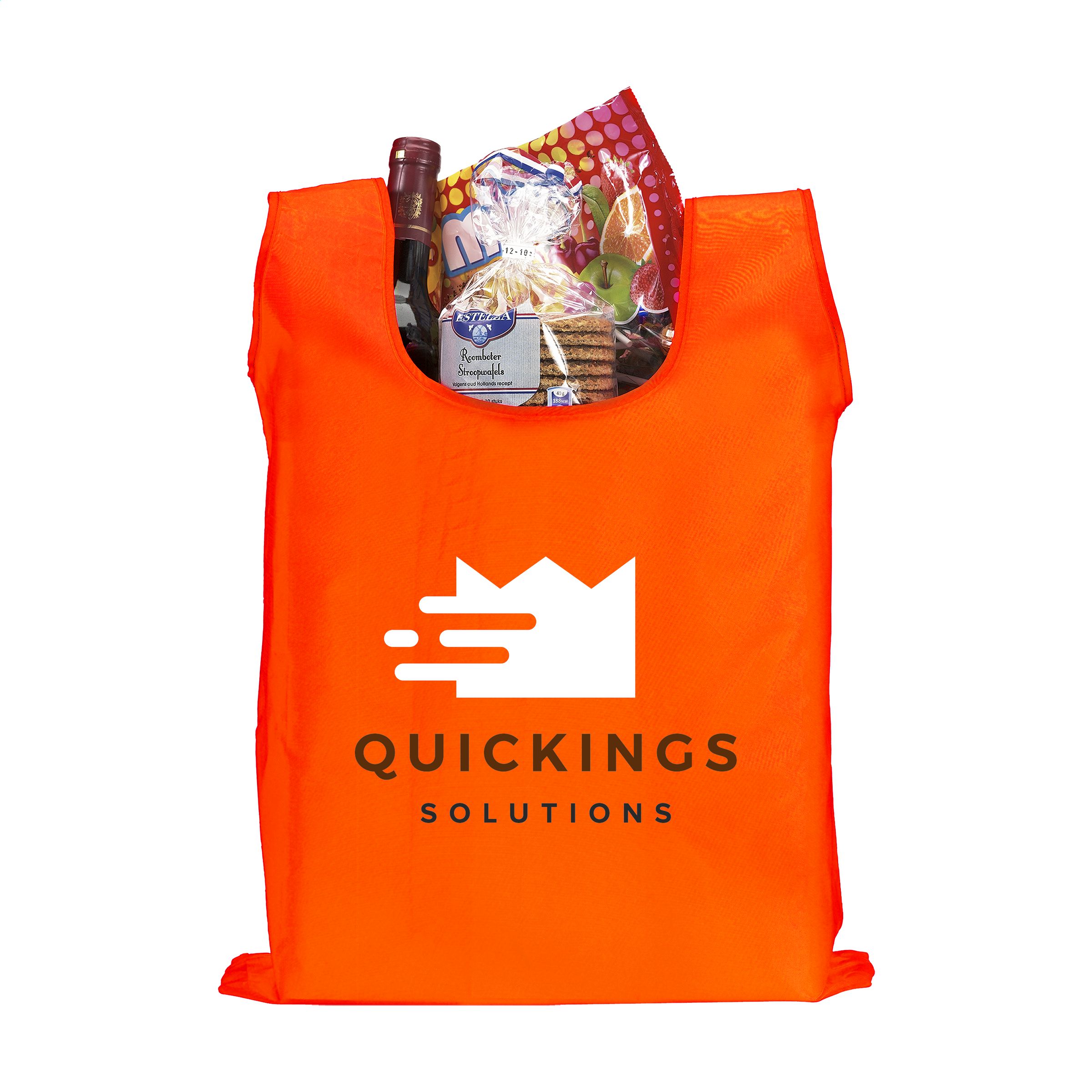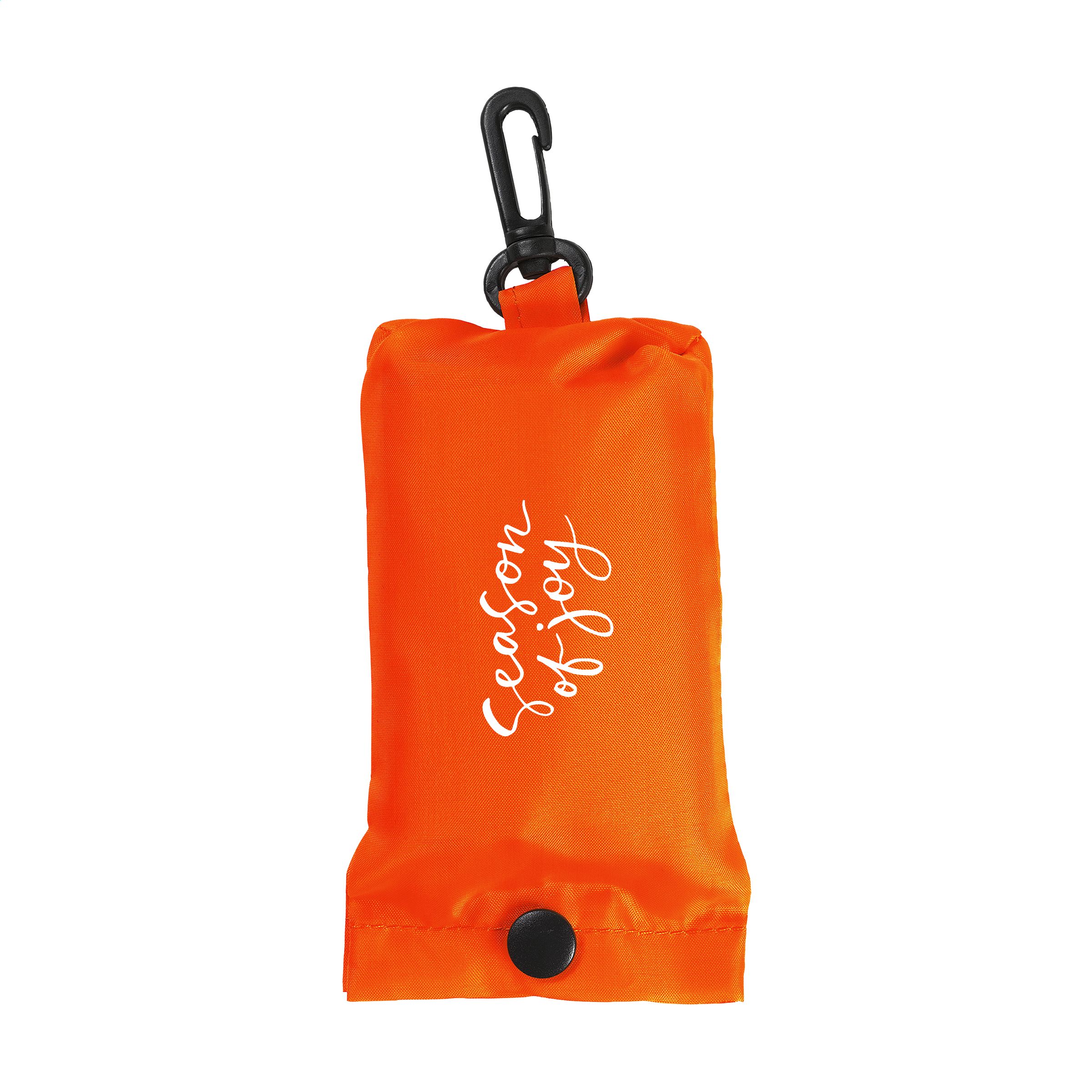 Foldable shopping bag made of 190T polyester. In a pouch with popper and carabiner hook. Meas. unfolded 53 x 38 cm.