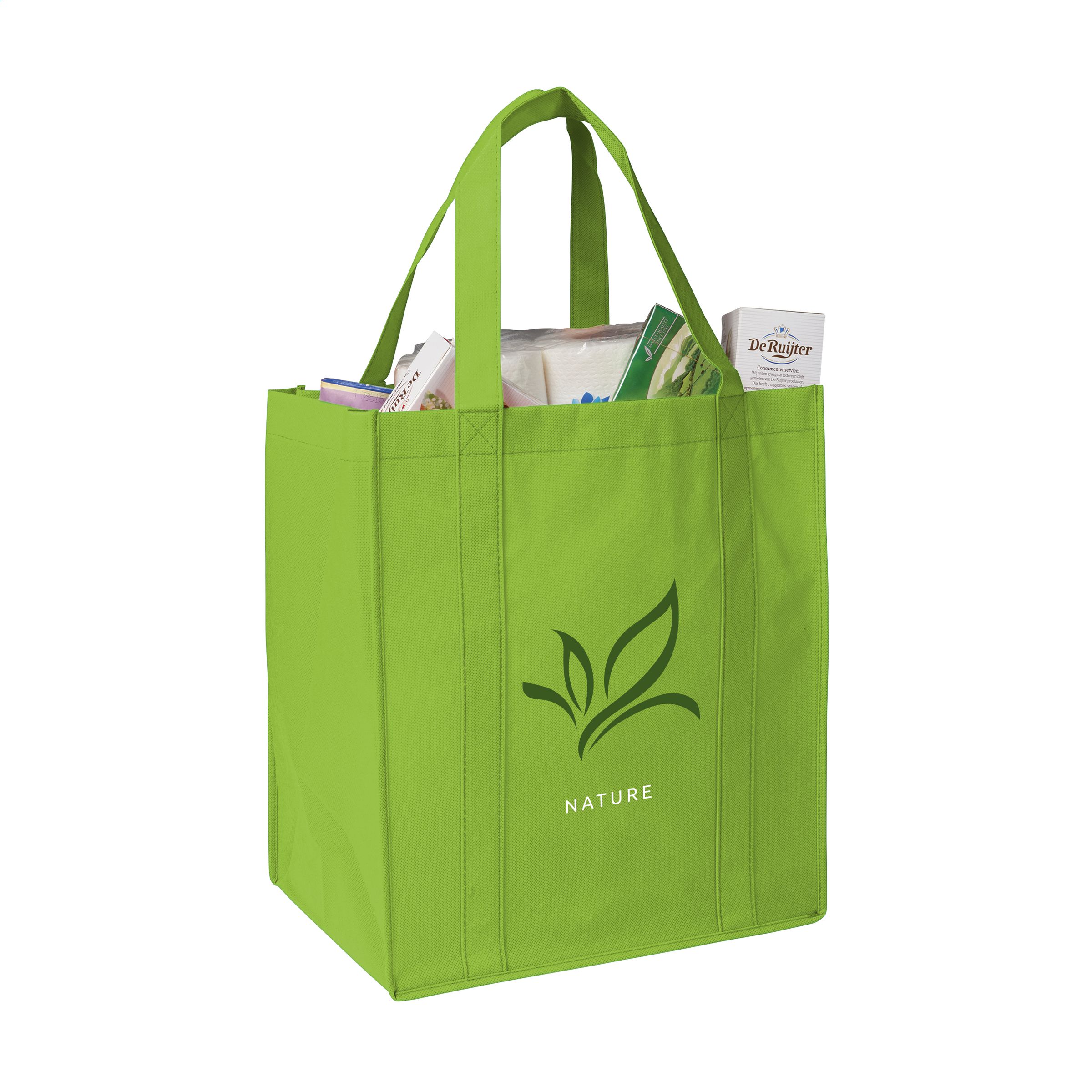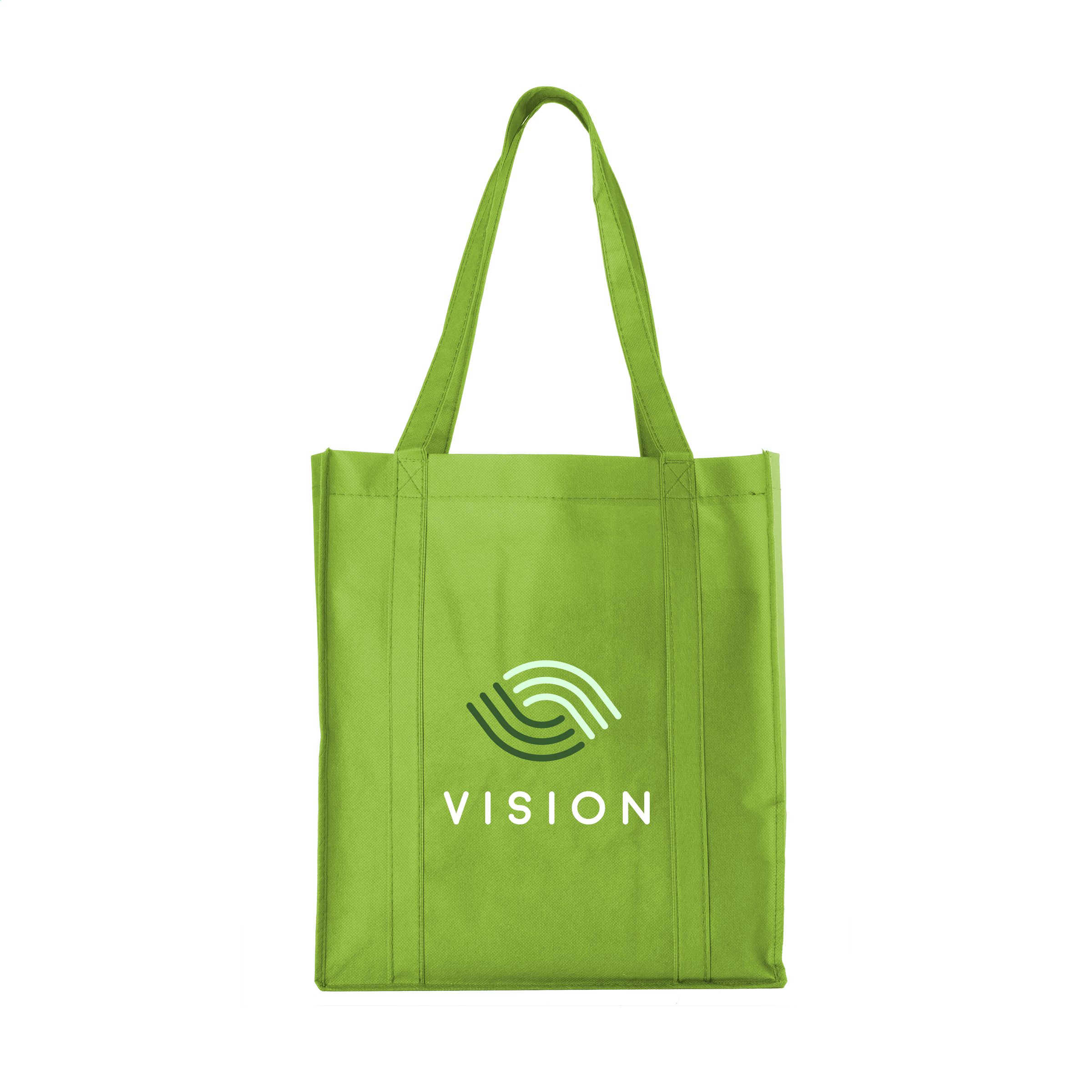 Practical, extra large shopping bag made of non-woven material (80 g/m²): a super light and strong synthetic material. Reinforced bottom, carrying straps and extra loop on the inside.
