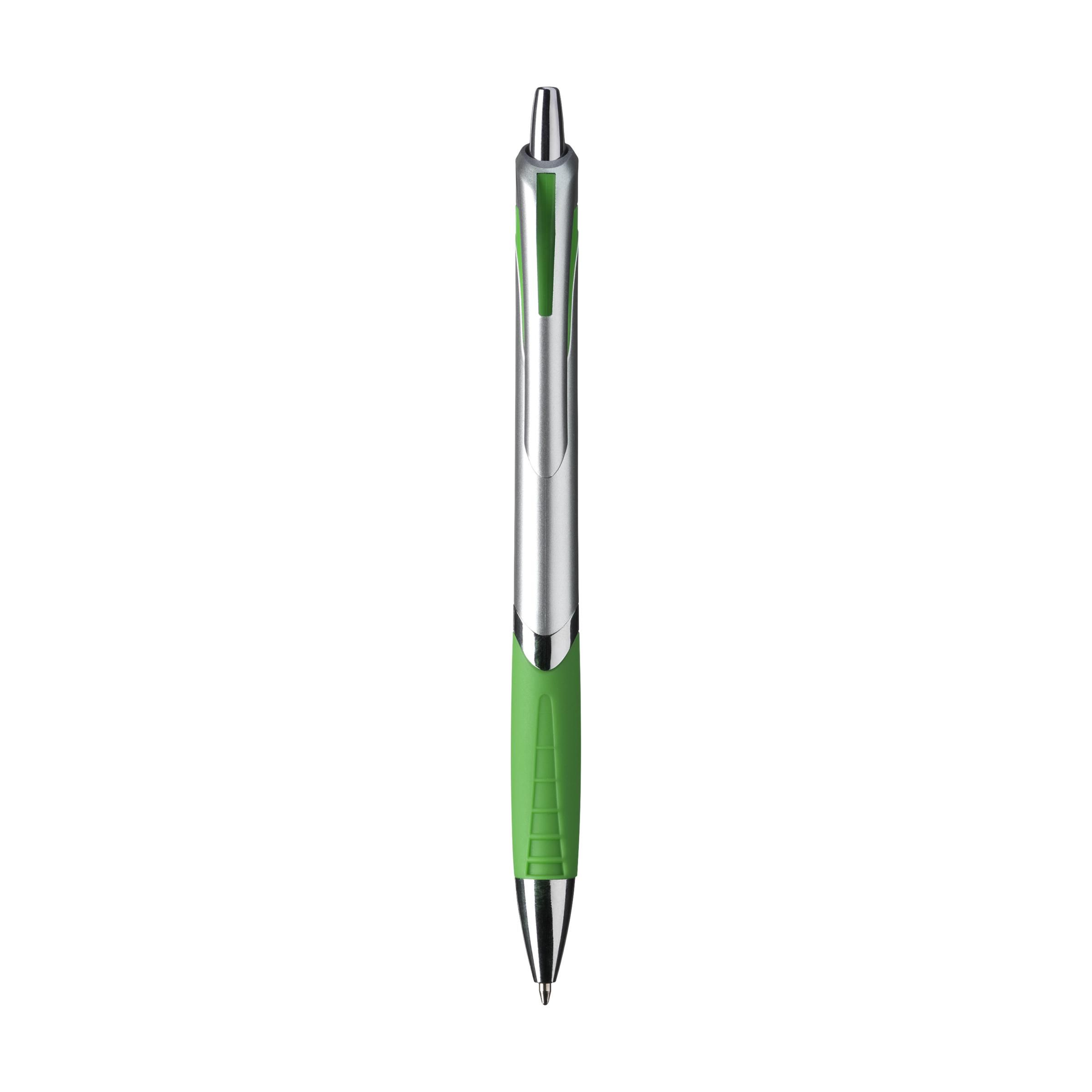 Blue ink ballpoint pen with a silver barrel, rubber grip, modern clip with colour accent.