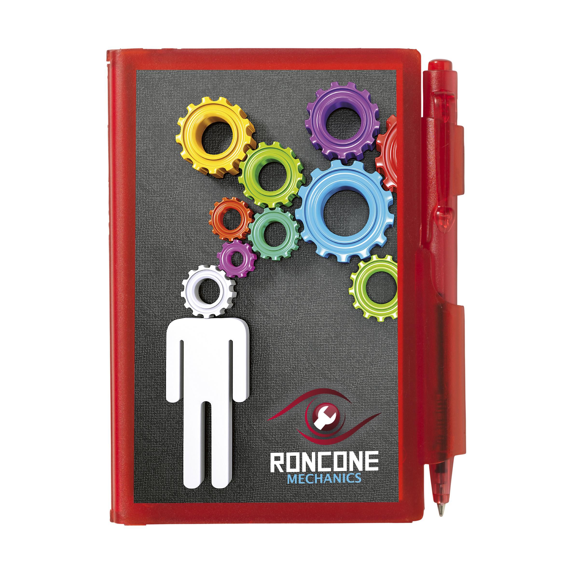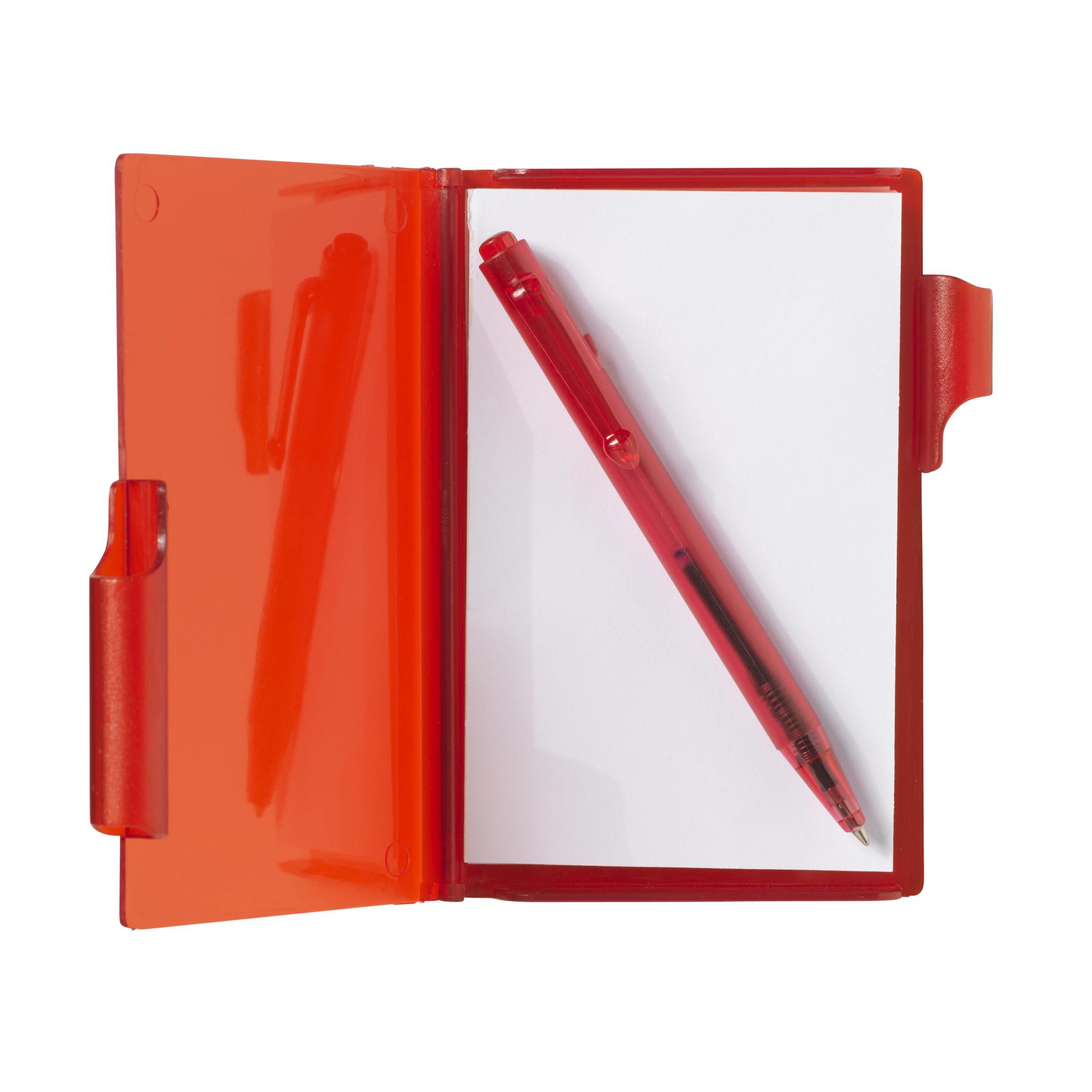 Plastic case with notepad (60 sheets) and blue ink ballpoint pen.