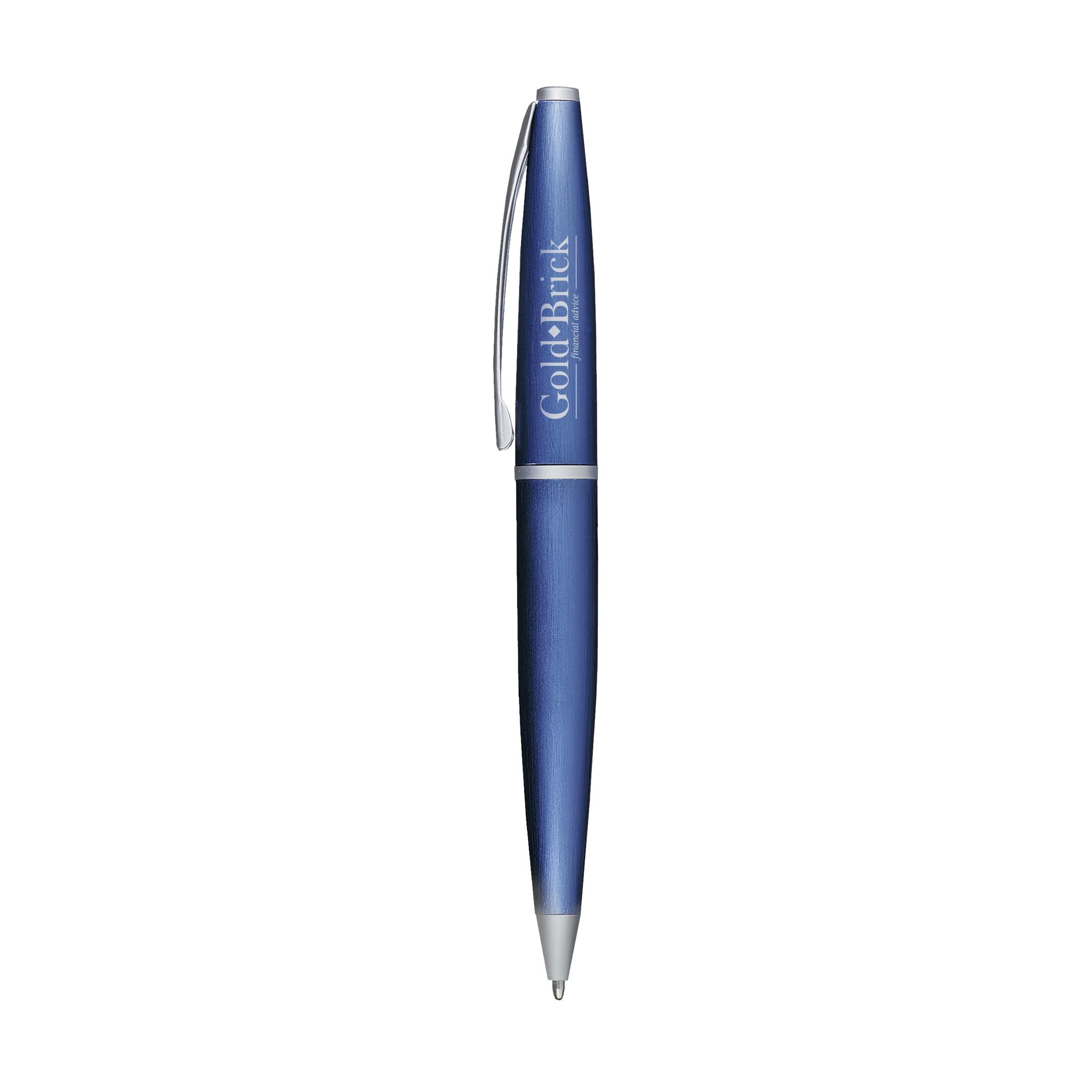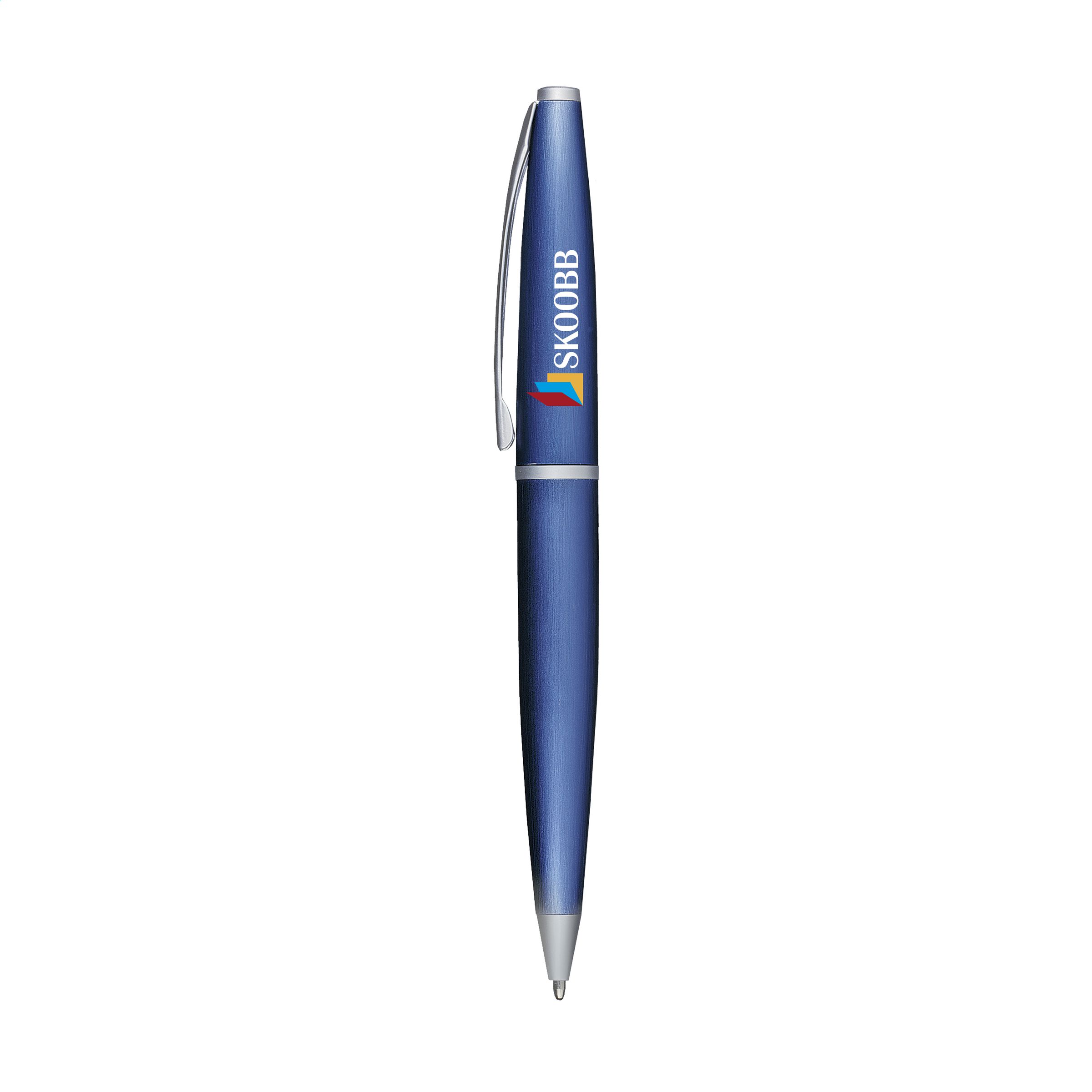 Blue ink, metal ballpoint pen with vibrant coloured barrel and twist-action tip.