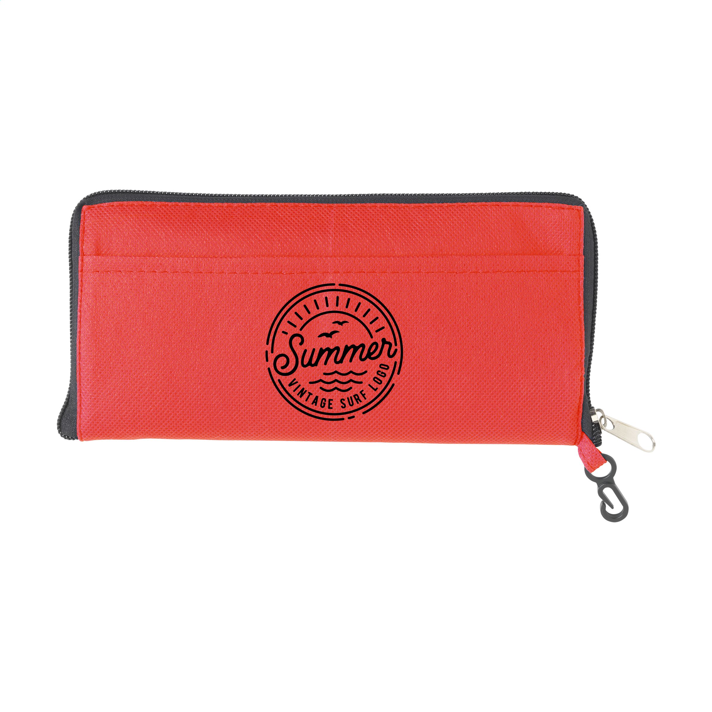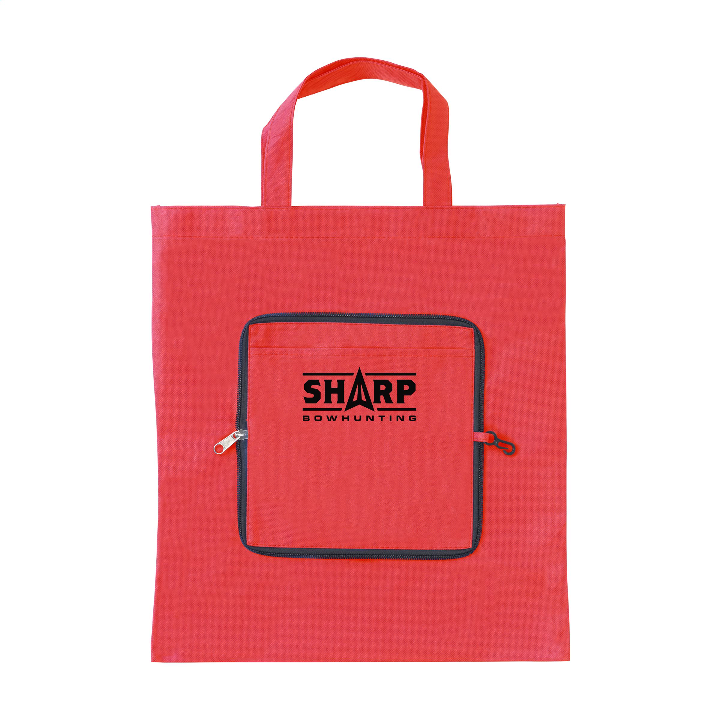 Foldable, non-woven (80g/m²) shopping bag with compartment. In a compact pouch with zip and carabiner. Meas. unfolded 37 x 40 cm.