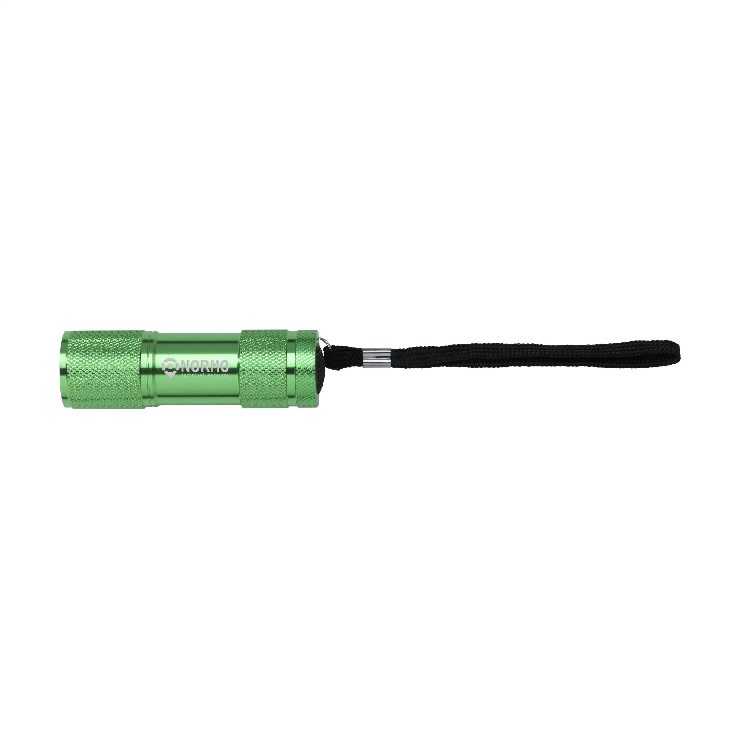 Aluminium torch with 9 energy efficient LED lights, which give a bright white beam. With detachable strap. Meas. Ø 2.7 x 9 cm. Batteries incl. Each piece in a box.