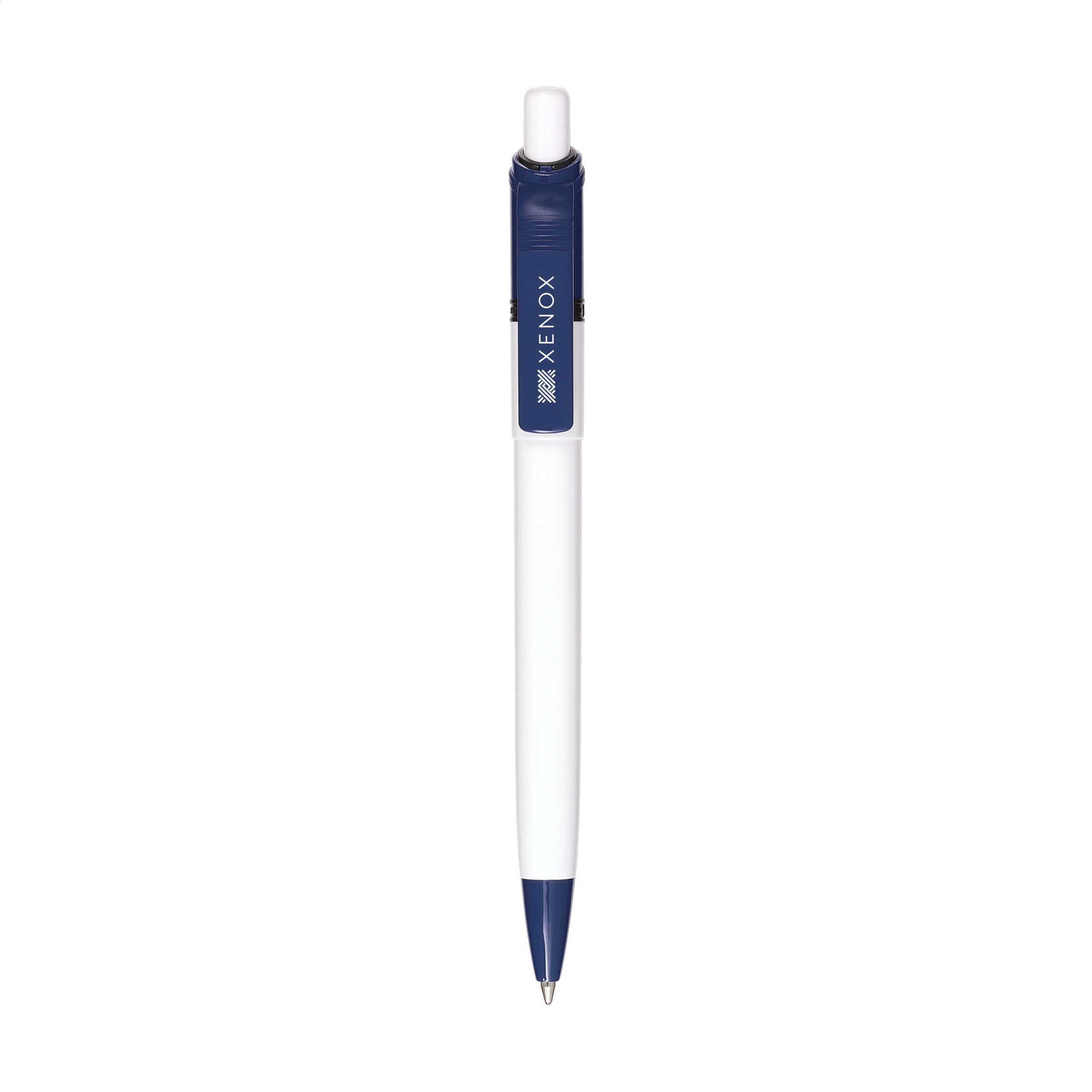 Blue ink ballpoint pen with coloured clip and point. Made in Italy.