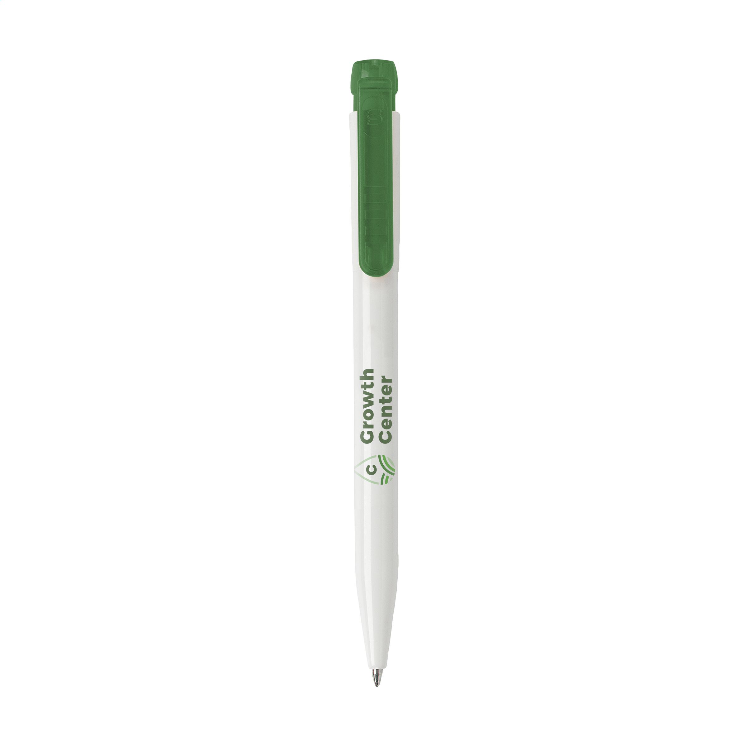Blue ink ballpoint pen with translucent coloured clip and push button. Made in Italy.