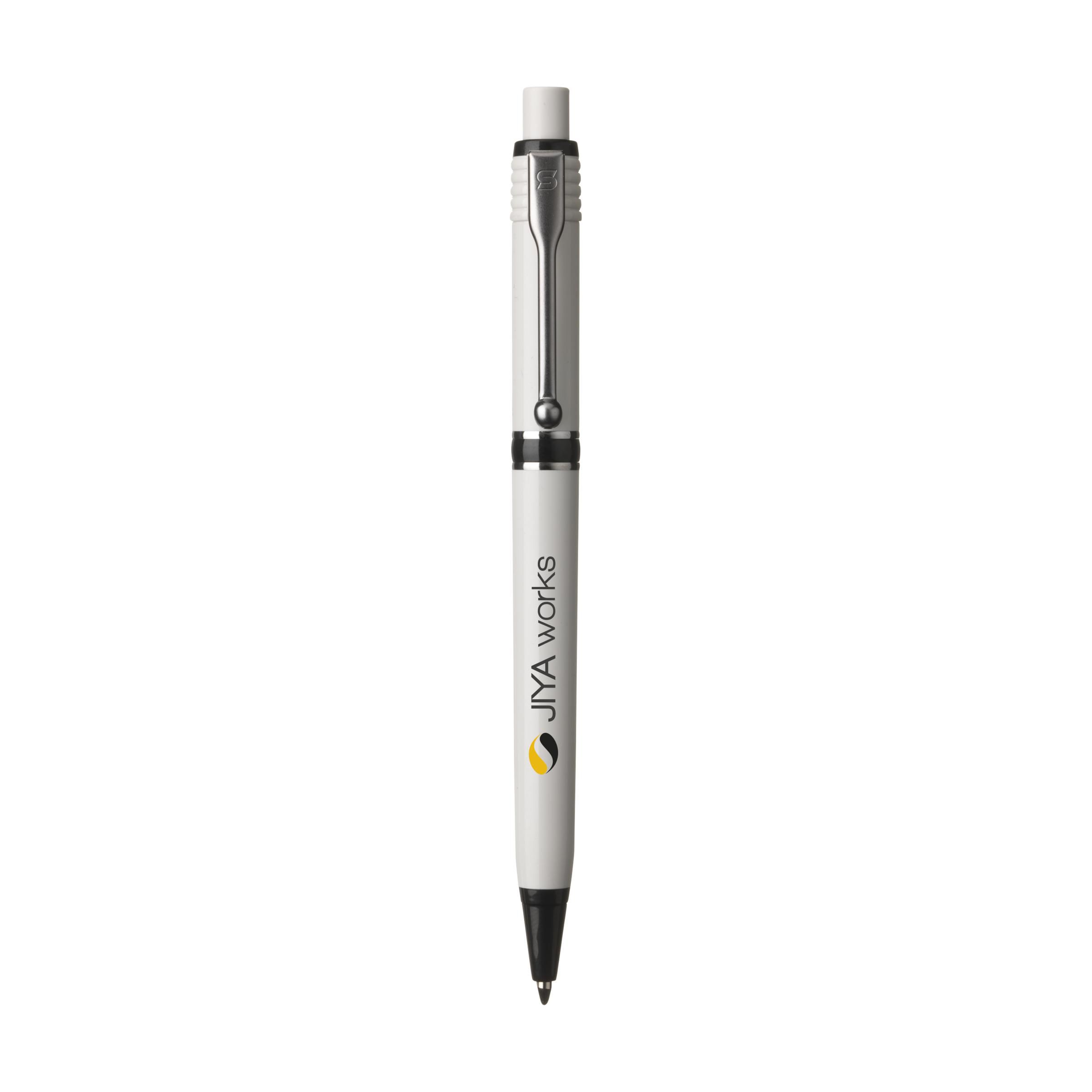 Blue ink Stilolinea ballpoint pen with coloured tip, metal clip and trims. Made in Italy.