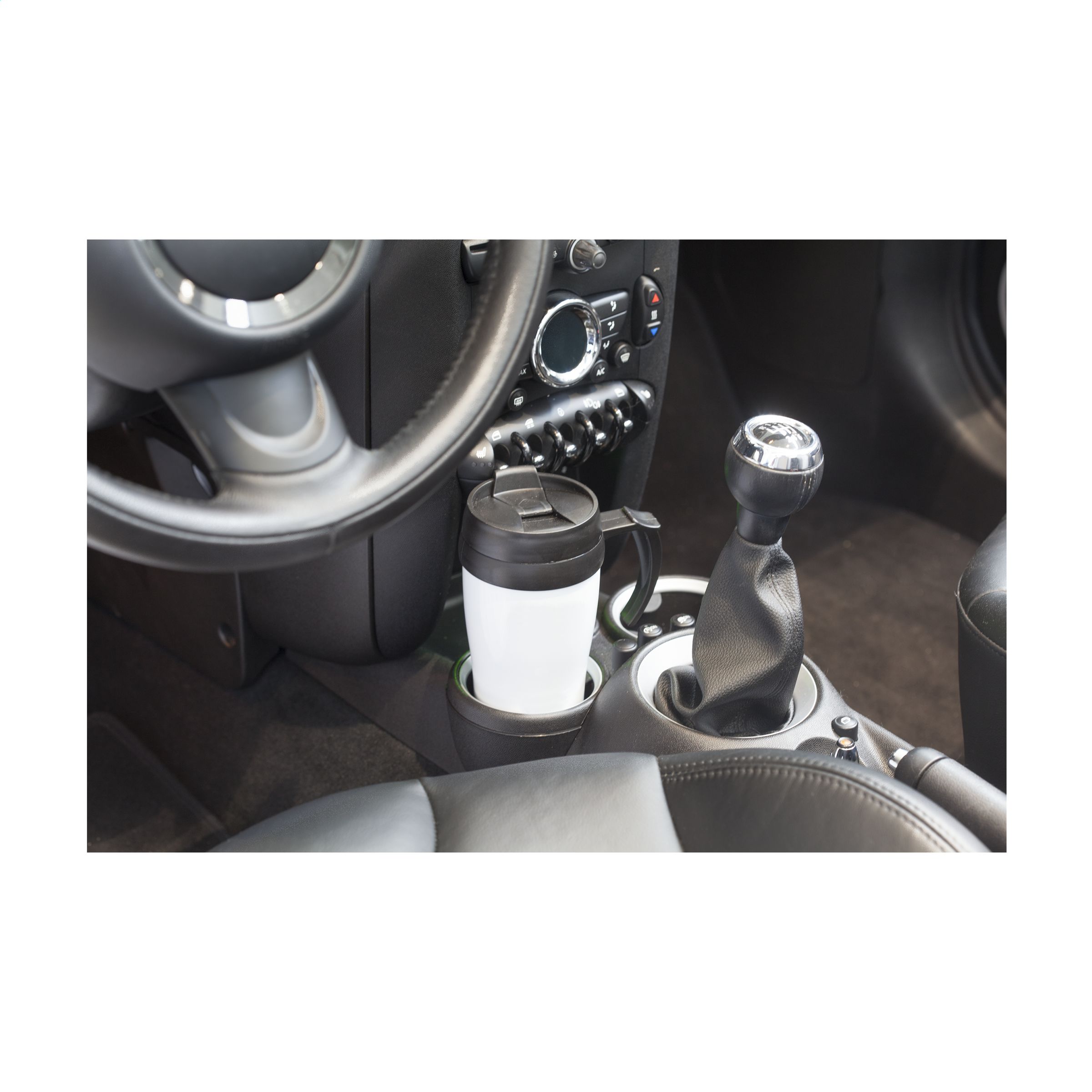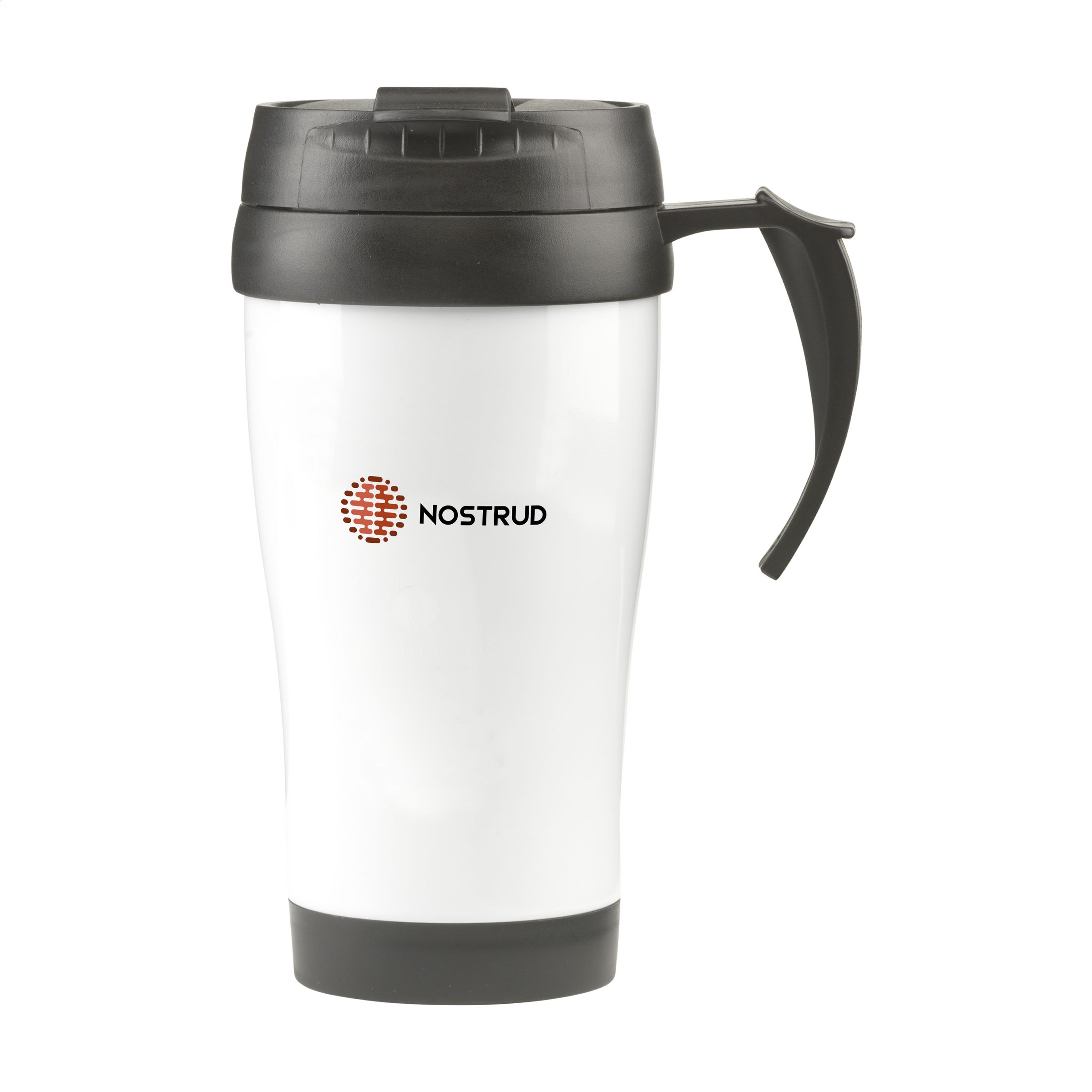Double-walled stainless steel/plastic thermo mug with screw cap and click opening. Leak-free. Capacity 400 ml. Each piece in a box.