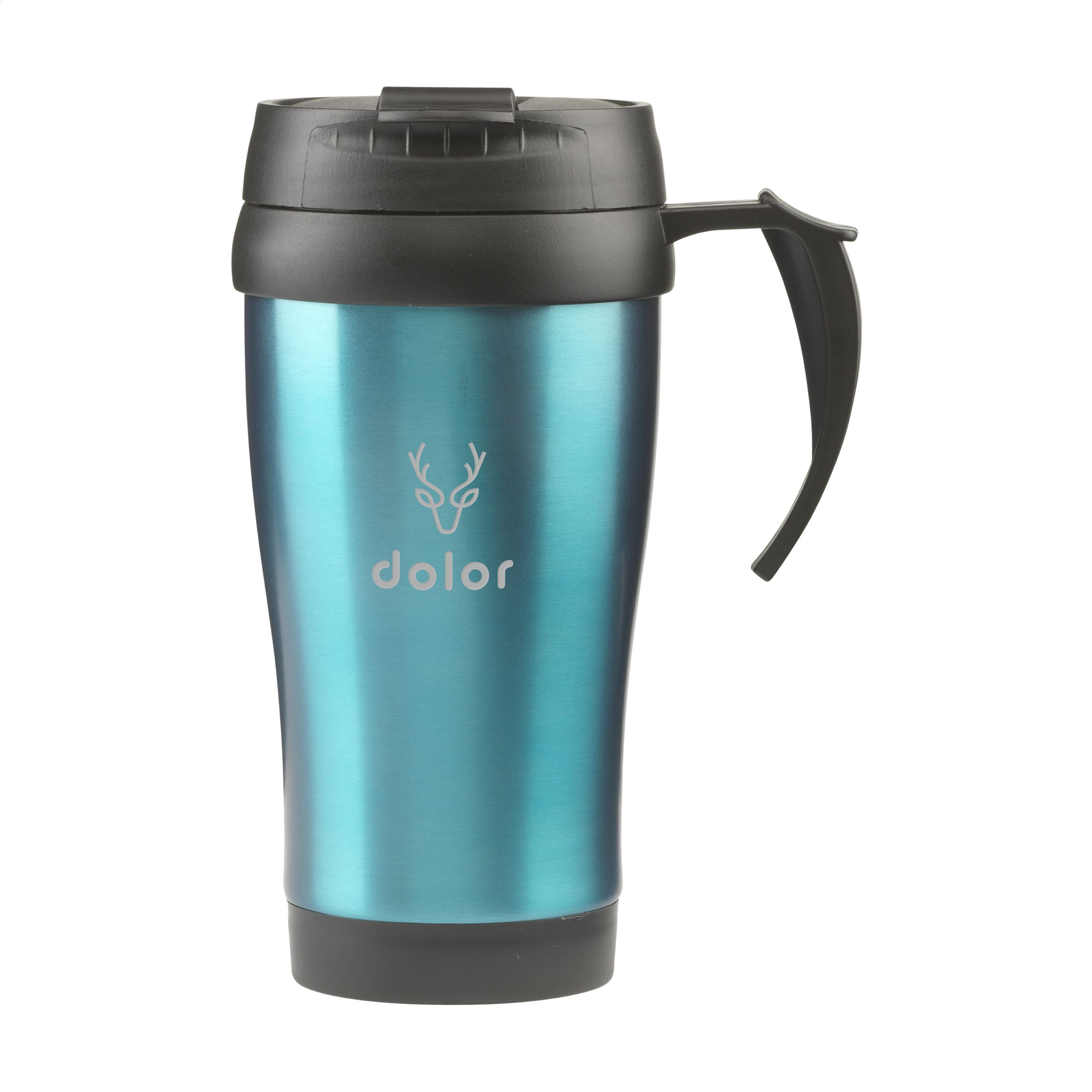 Double-walled stainless steel/plastic thermo mug with screw cap and click opening. Leak-free. Capacity 400 ml. Each piece in a box.