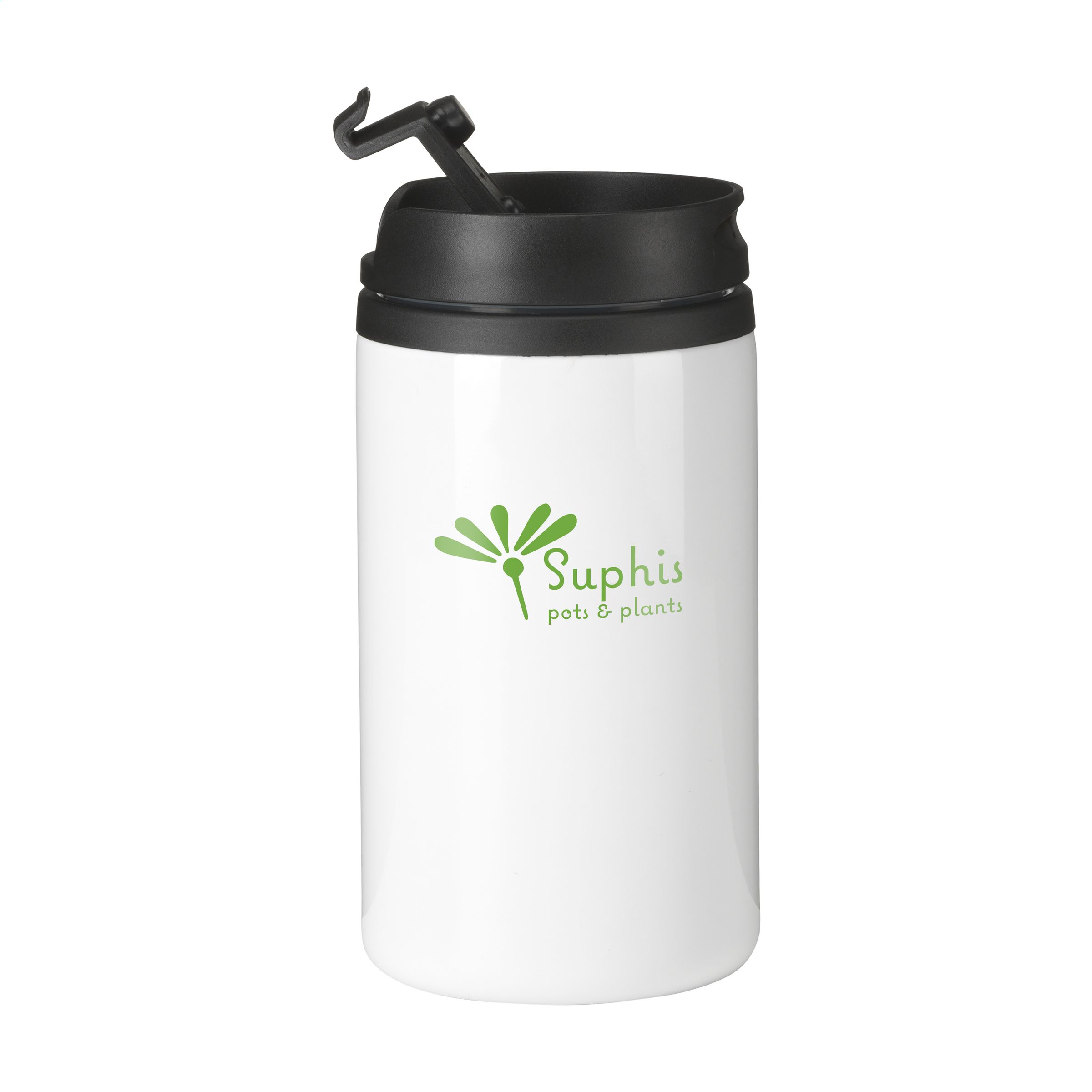 Double-walled thermo cup with stainless steel exterior and plastic interior, screw cap with click opening and antislip holder. Leak-free. Capacity 300 ml. Each piece in a box.
