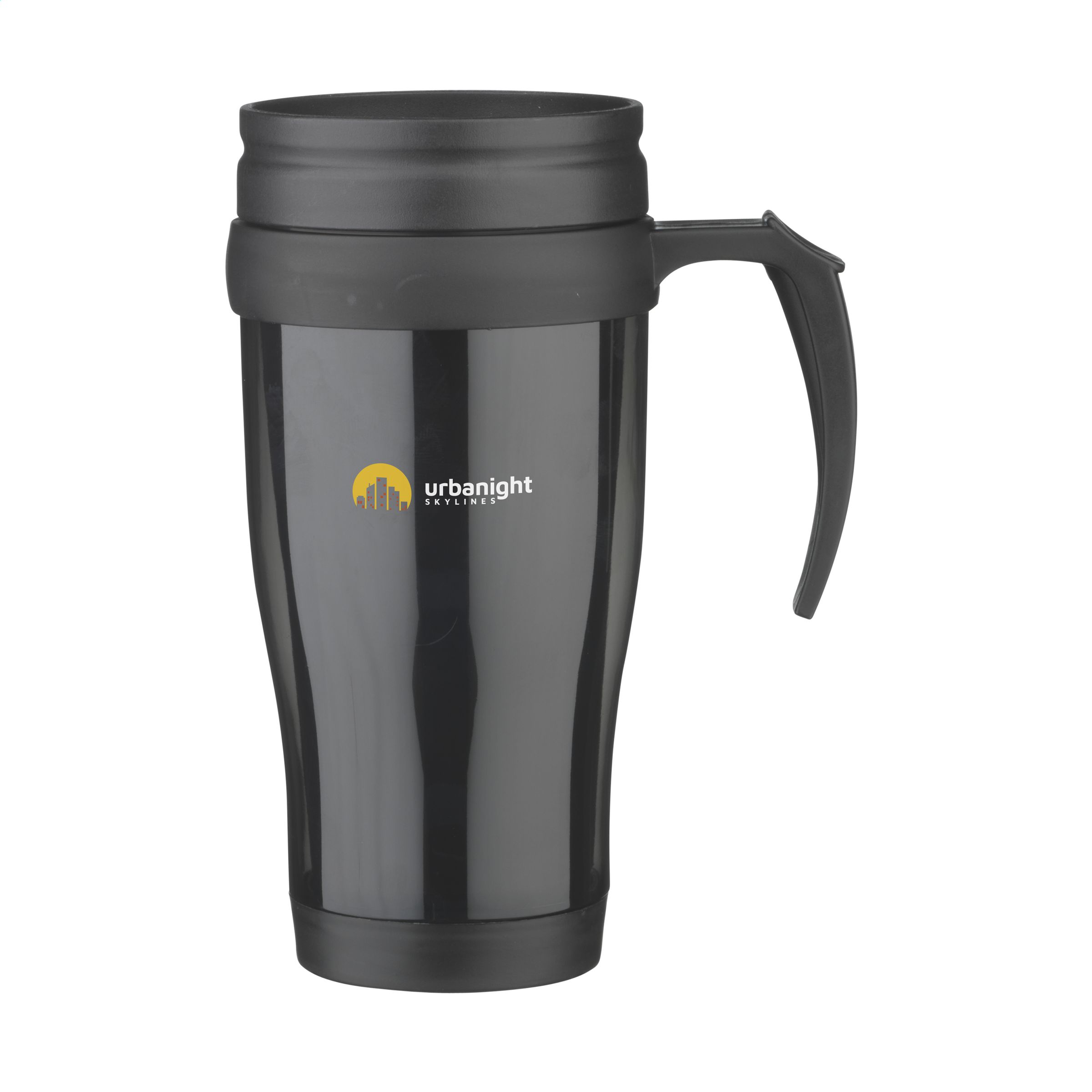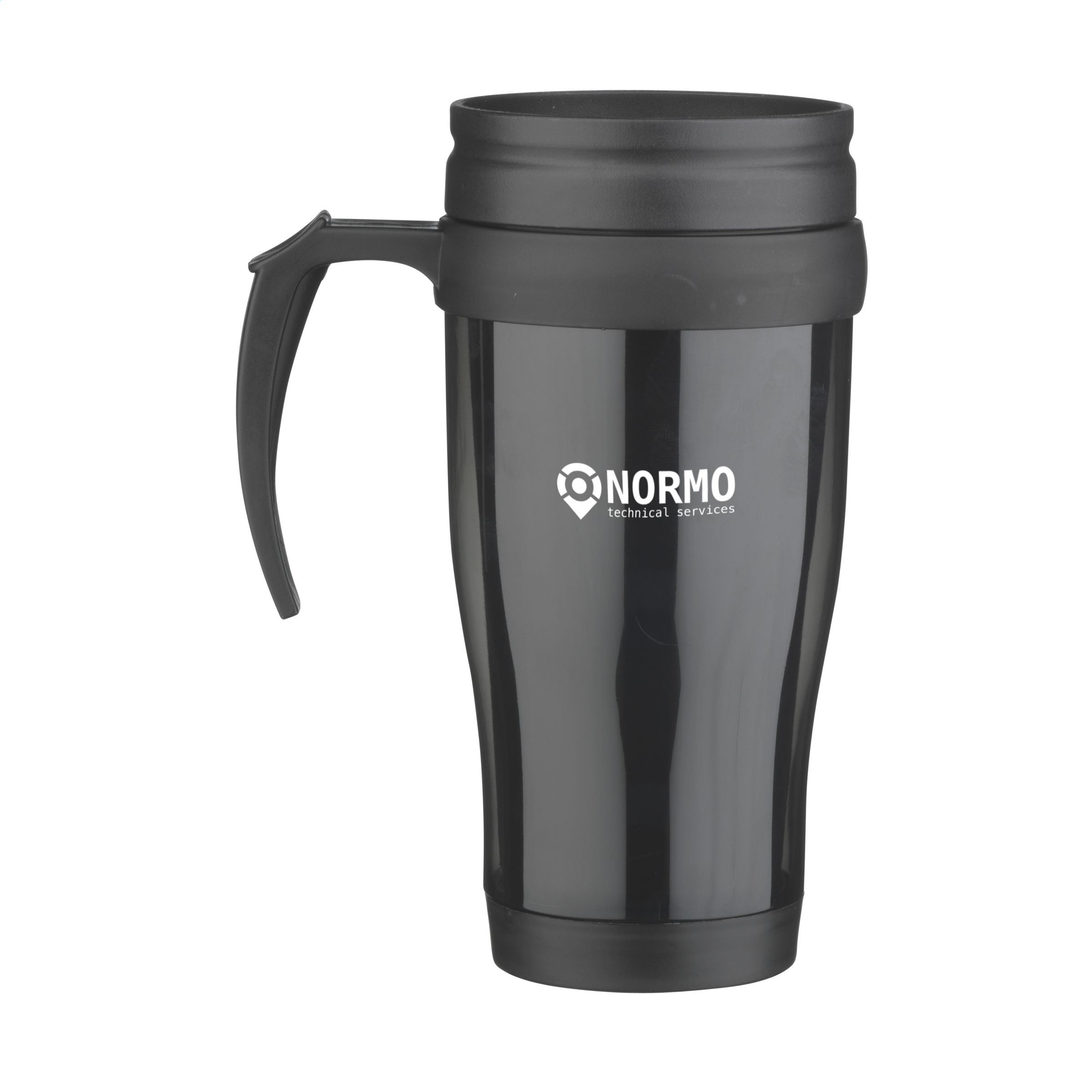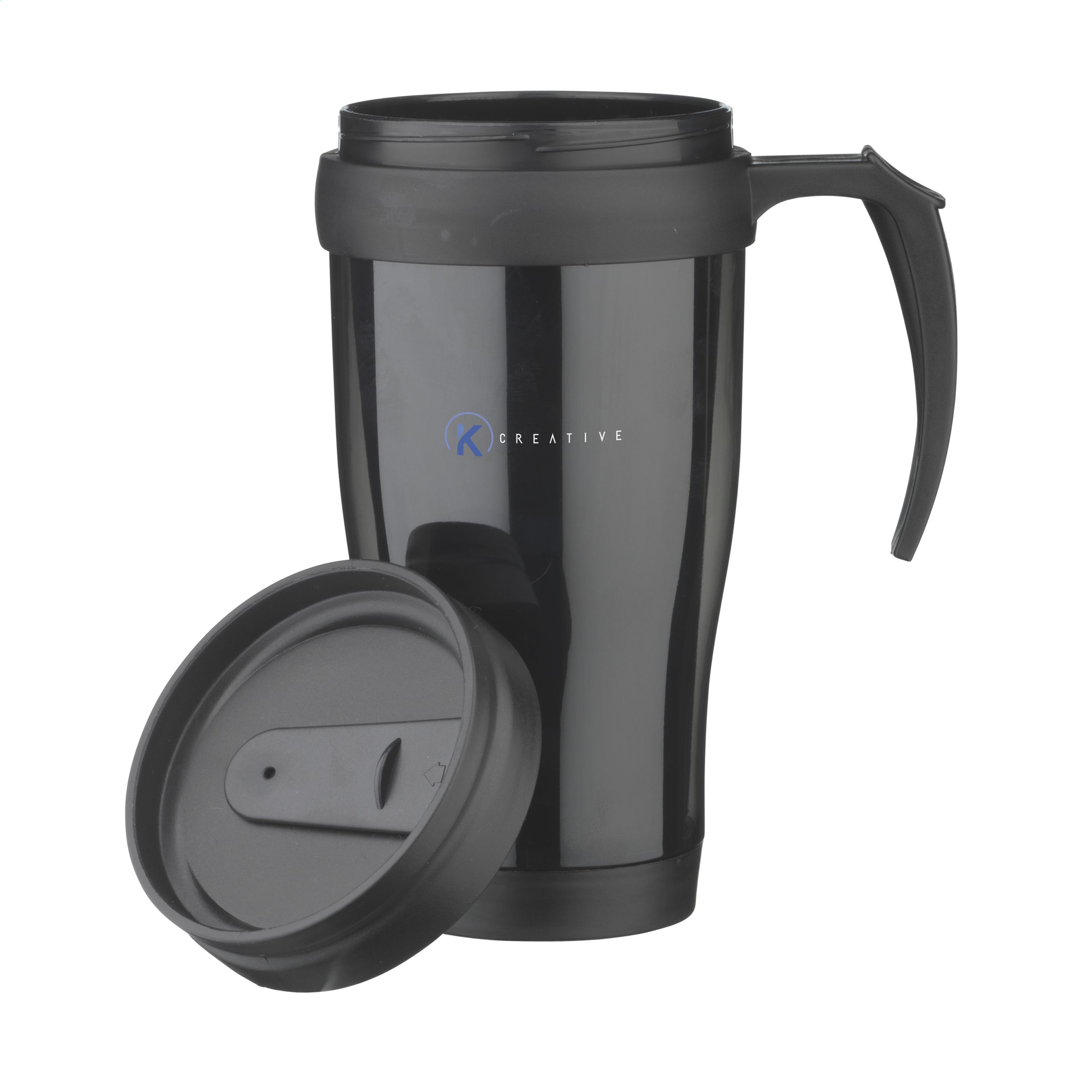 Double-walled plastic thermo cup with screw top and slide/click opening. Capacity 450 ml. Each piece in a box.