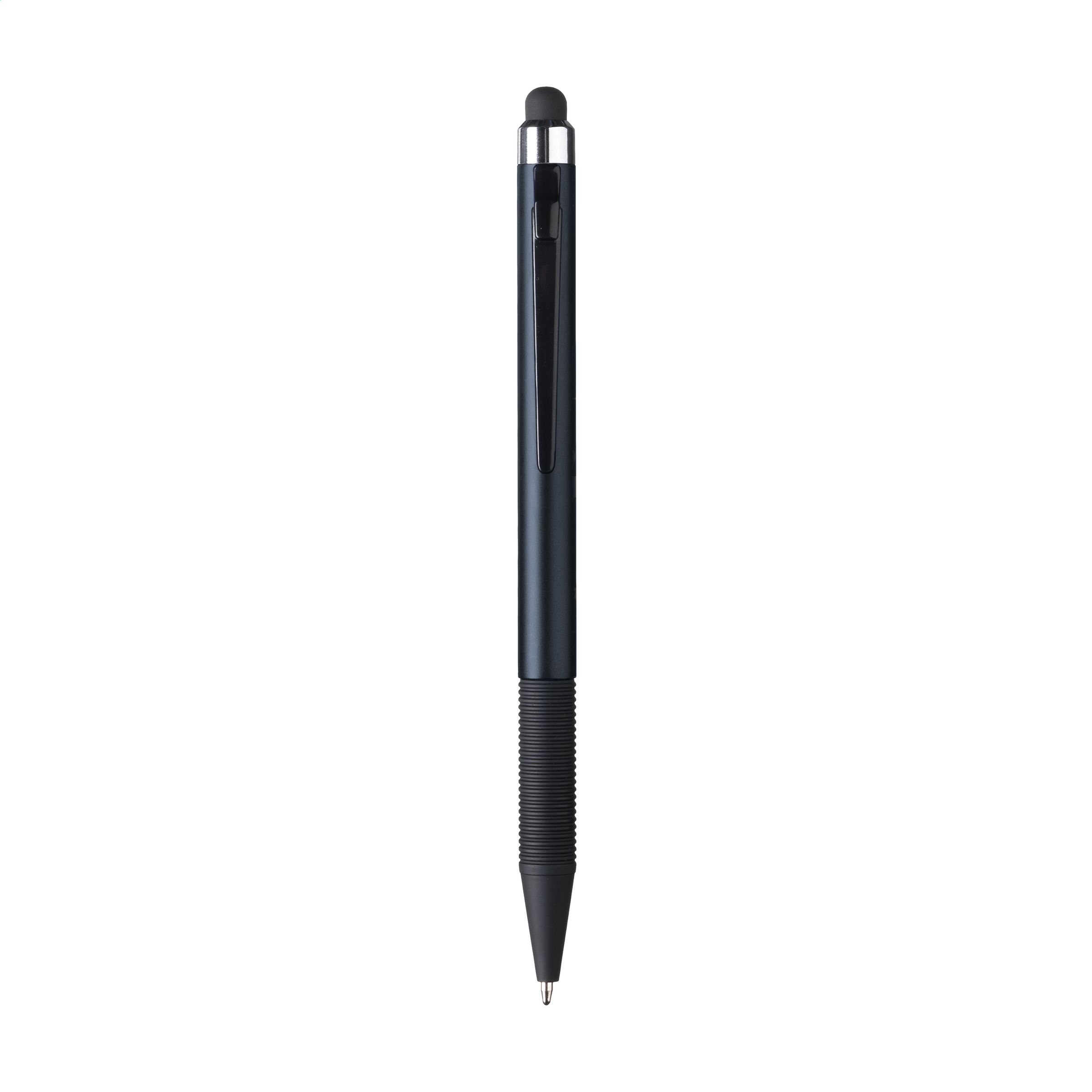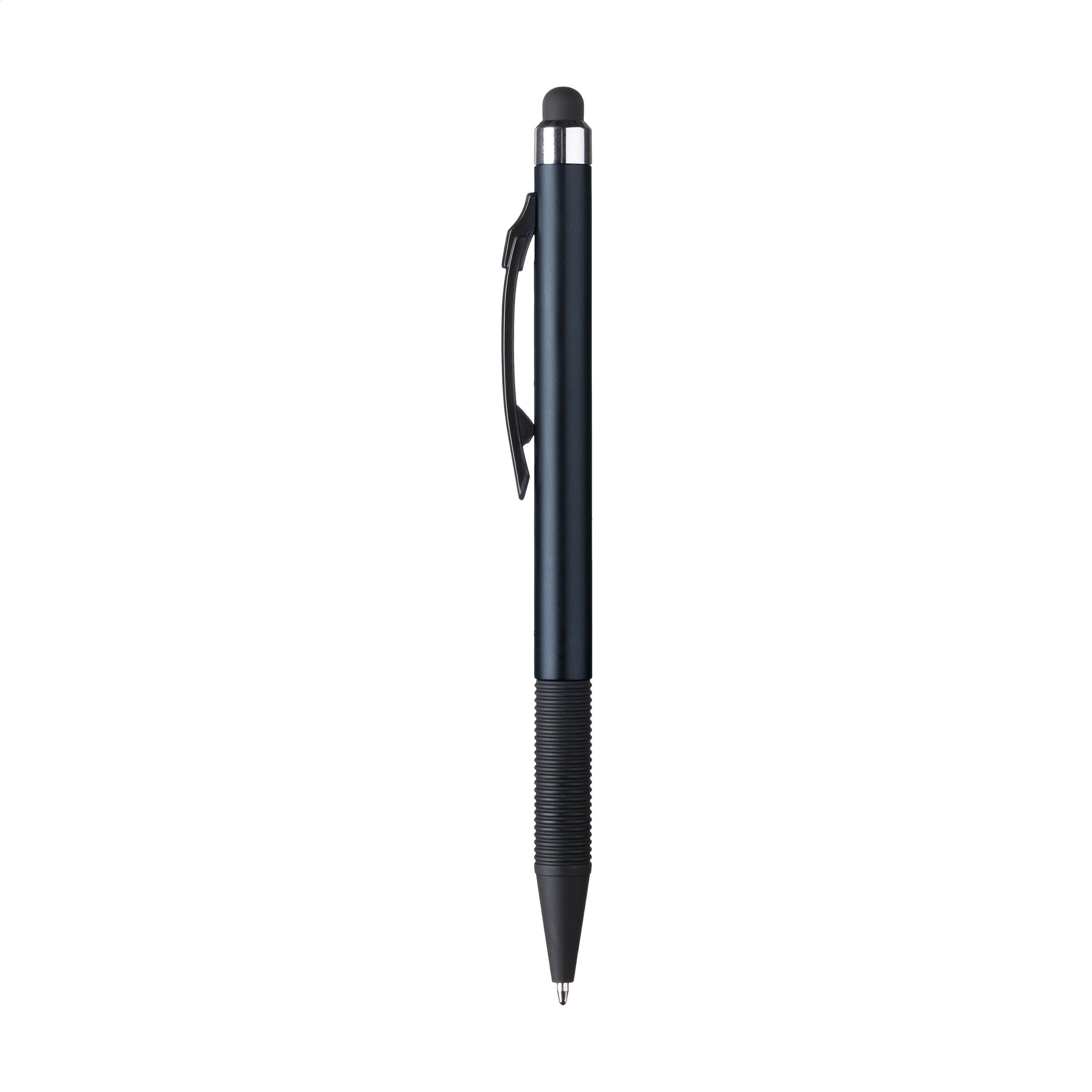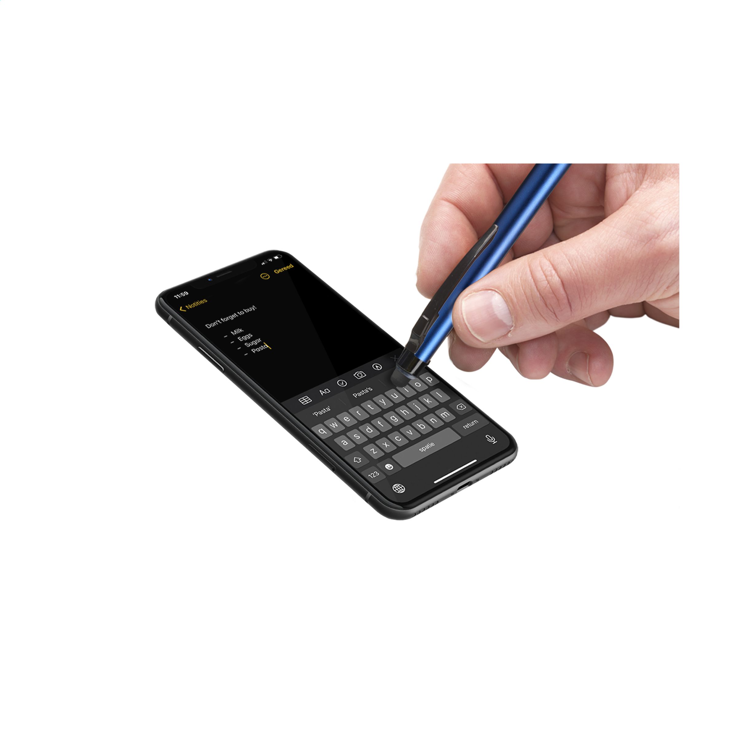 Blue ink, lightweight pen with top/pointer to operate touch screens (eg iPhone/iPad). Slim barrel with metallic look and clip, which is also on/off button and rubber grip.