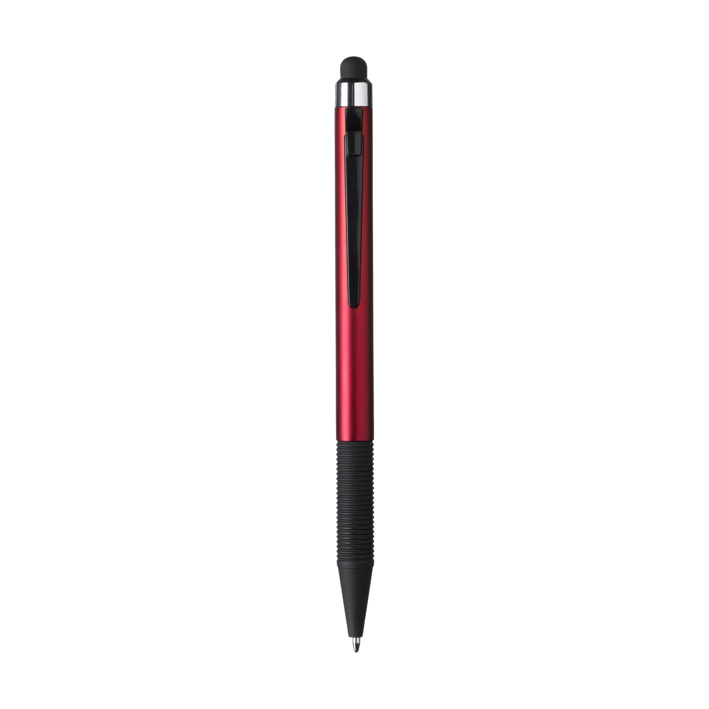 Blue ink, lightweight pen with top/pointer to operate touch screens (eg iPhone/iPad). Slim barrel with metallic look and clip, which is also on/off button and rubber grip.