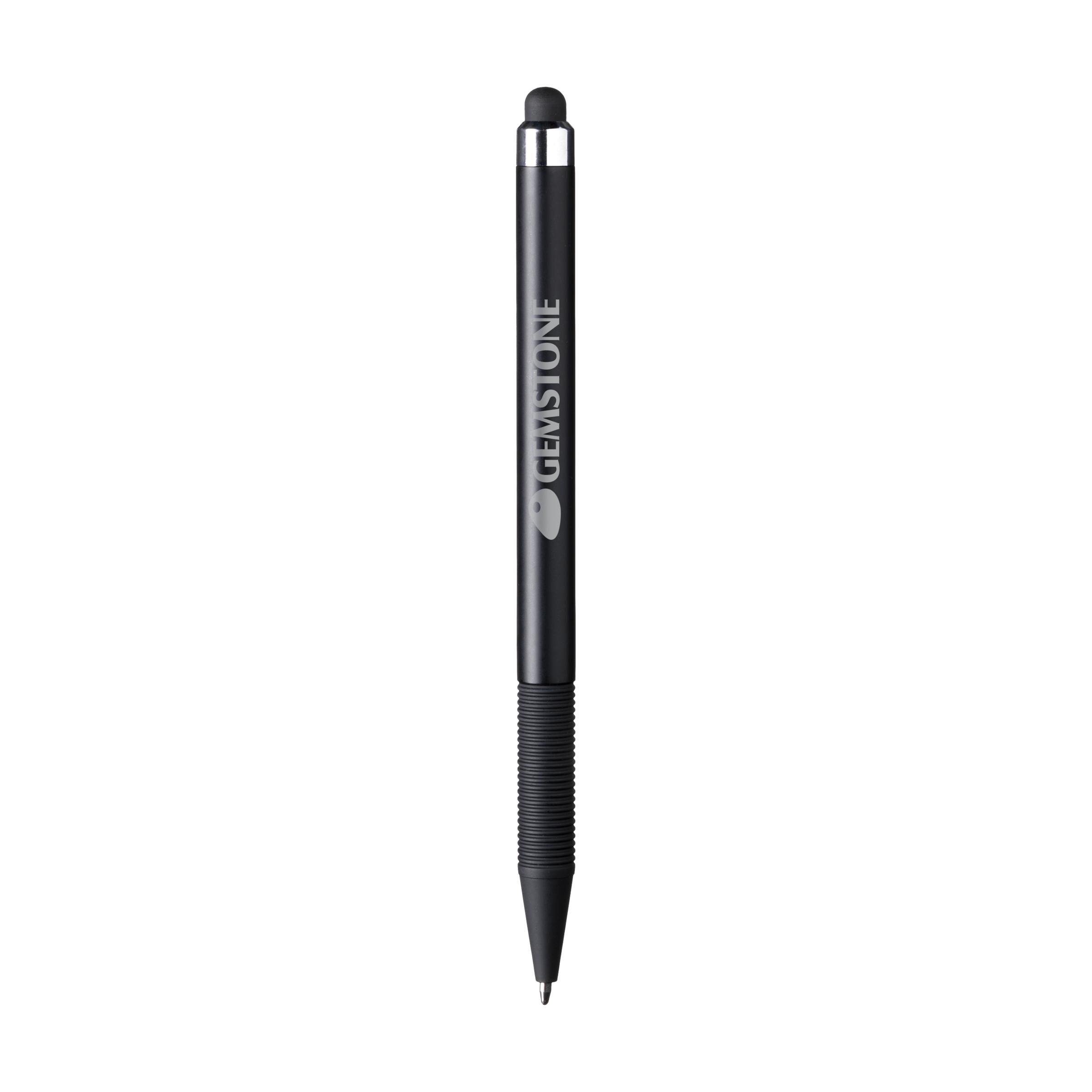 Blue ink, lightweight pen with top/pointer to operate touch screens (eg iPhone/iPad). Slim barrel with metallic look and clip, which is also on/off button and rubber grip.