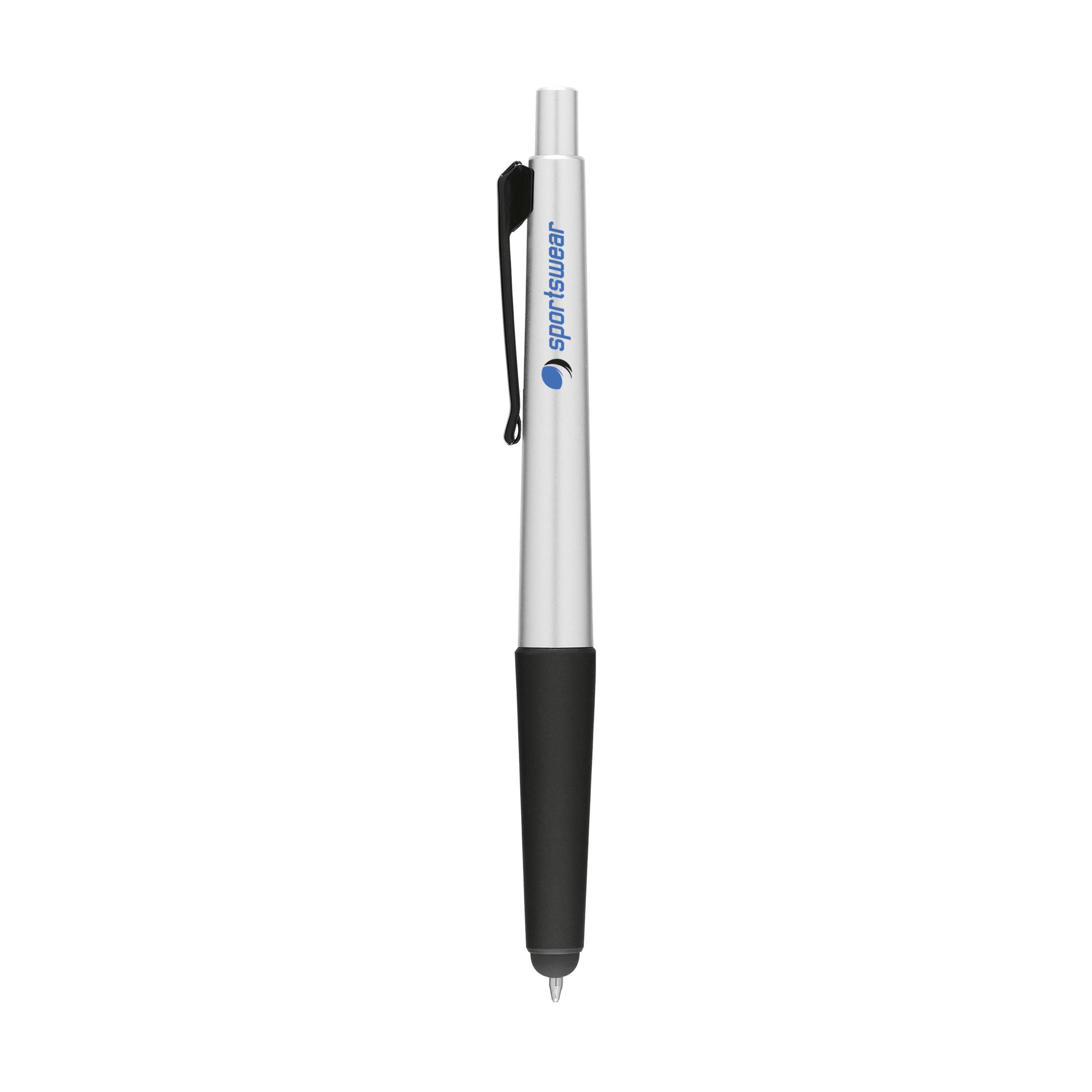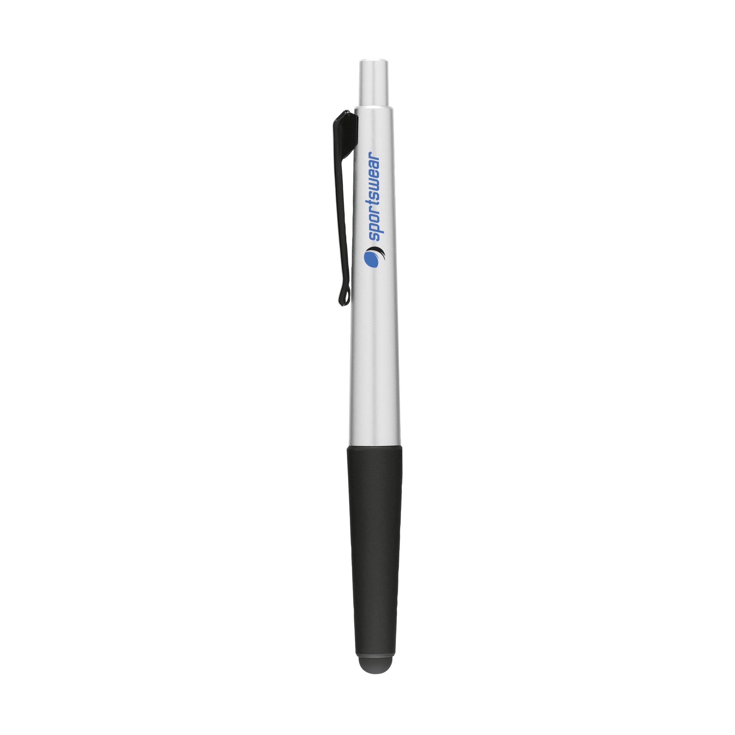Blue ink ballpoint pen in metalic finish, non-slip grip, push button and rubber top/pointer to operate touch screens (eg iPhone/iPad).