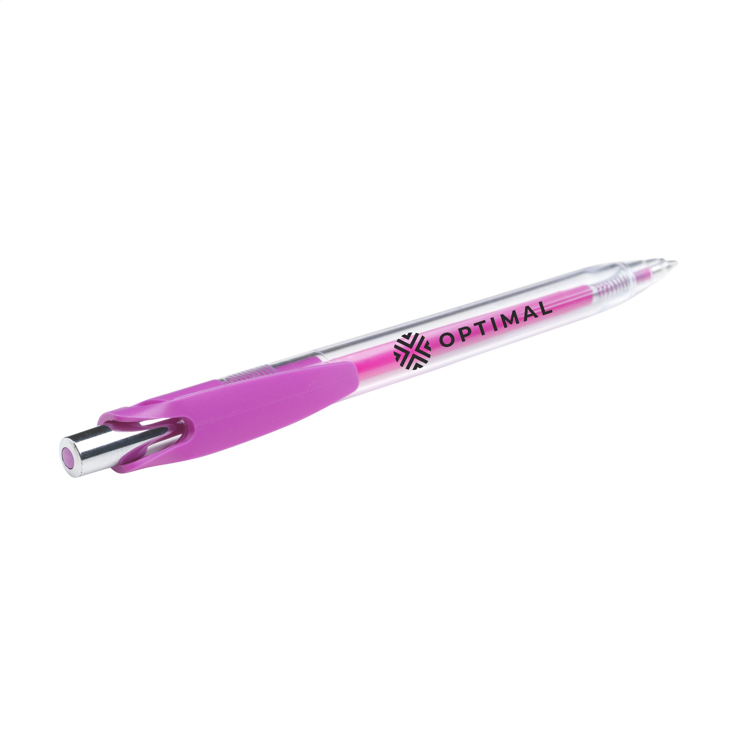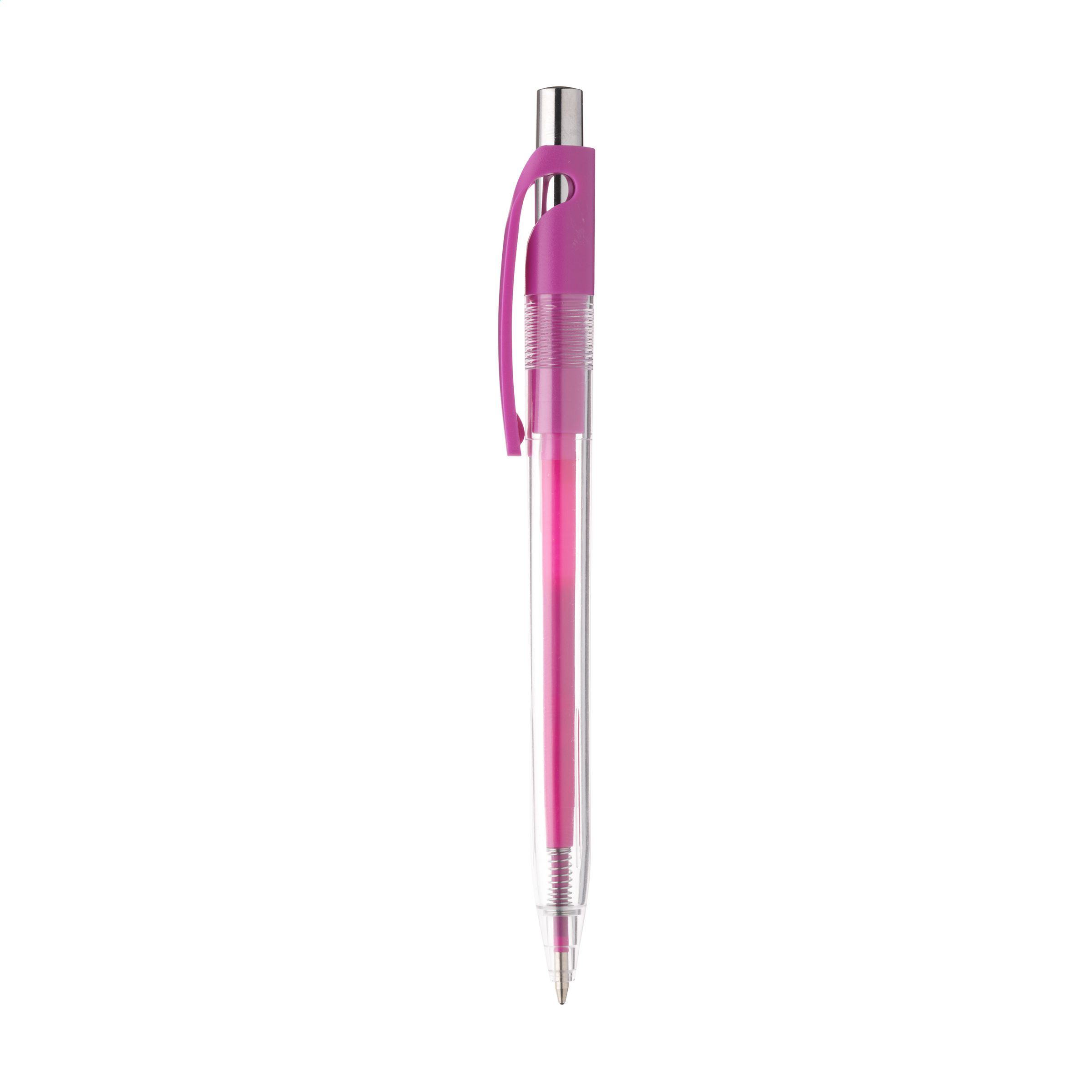 Blue ink ballpoint pen with transparent barrel, striking clip and colour accent in the push button.