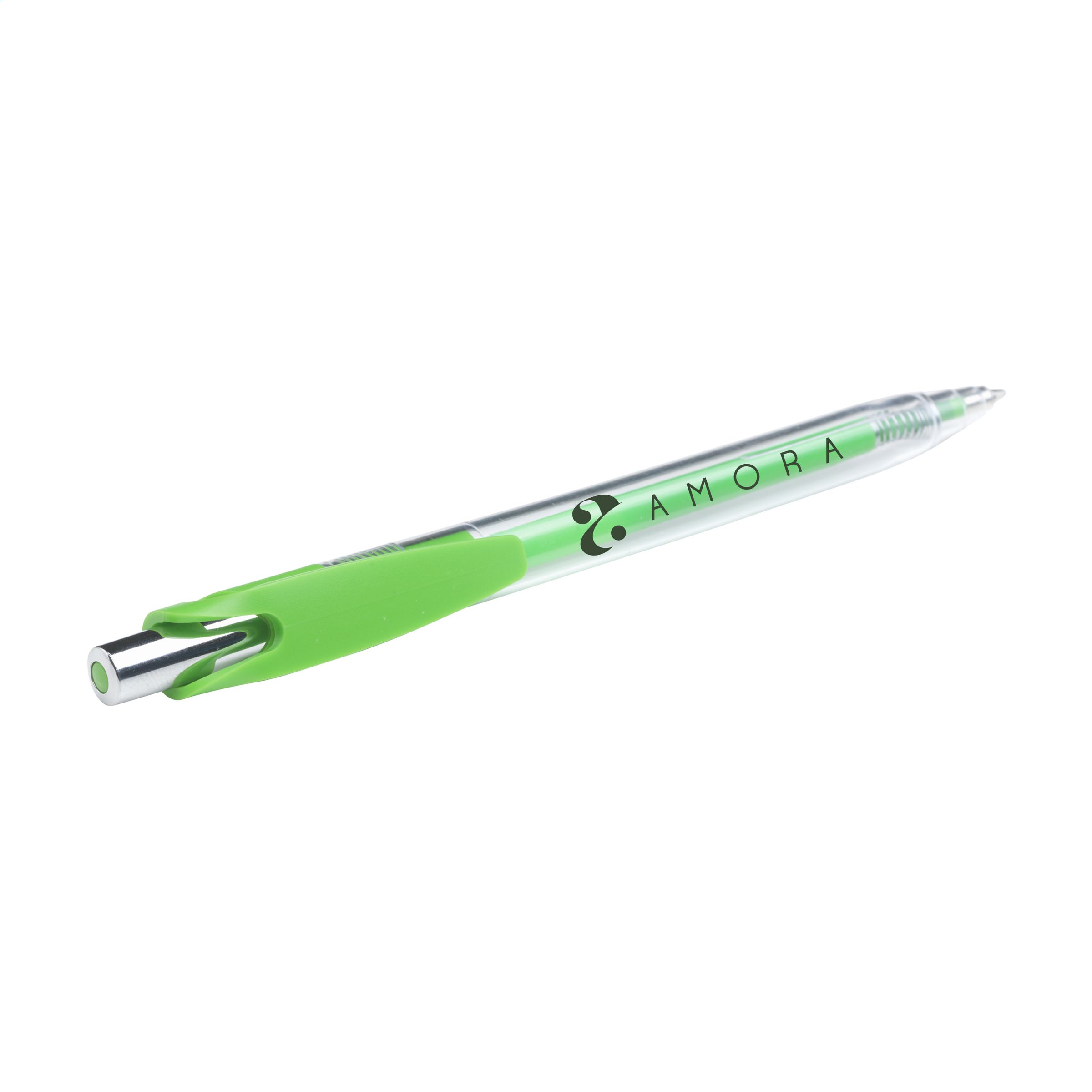 Blue ink ballpoint pen with transparent barrel, striking clip and colour accent in the push button.