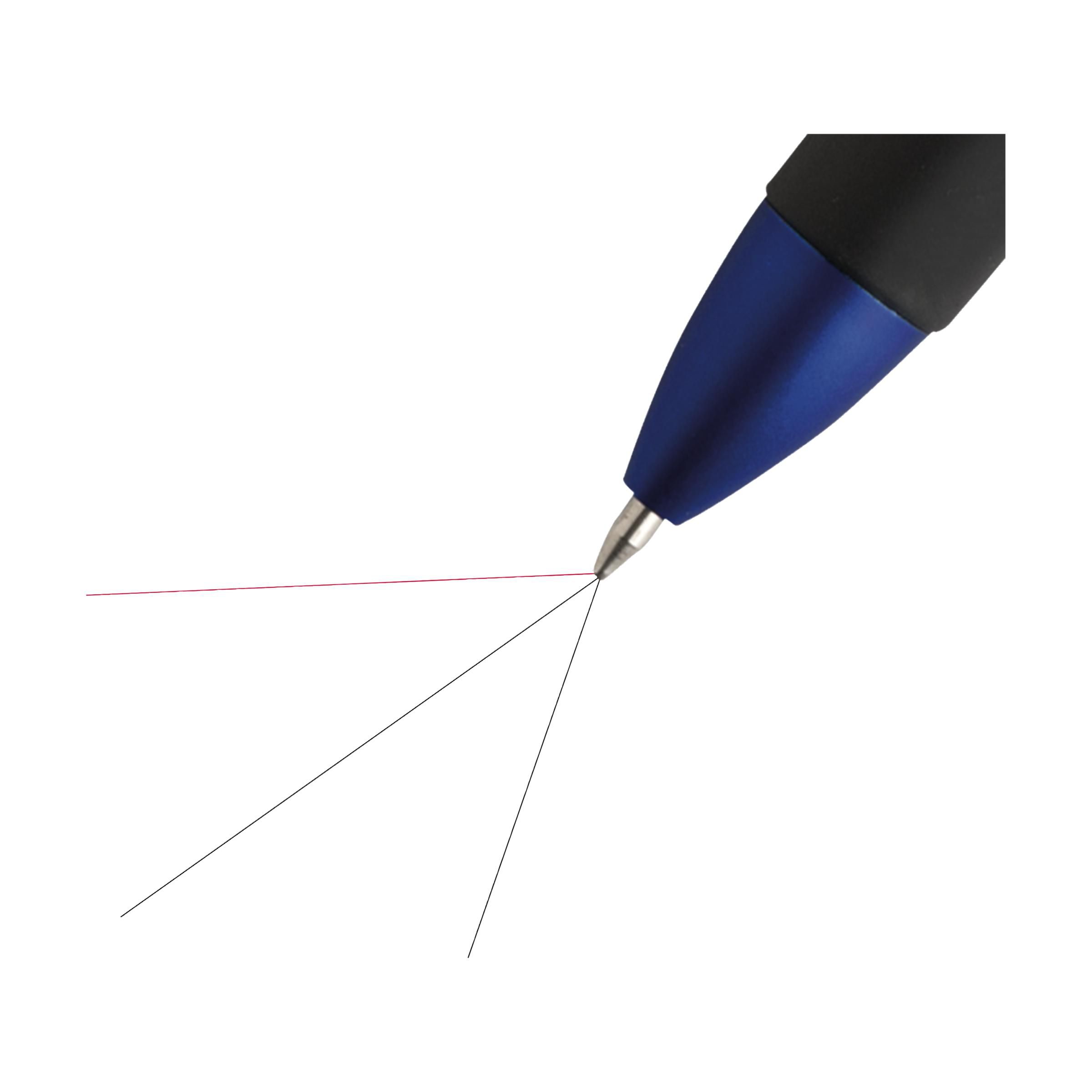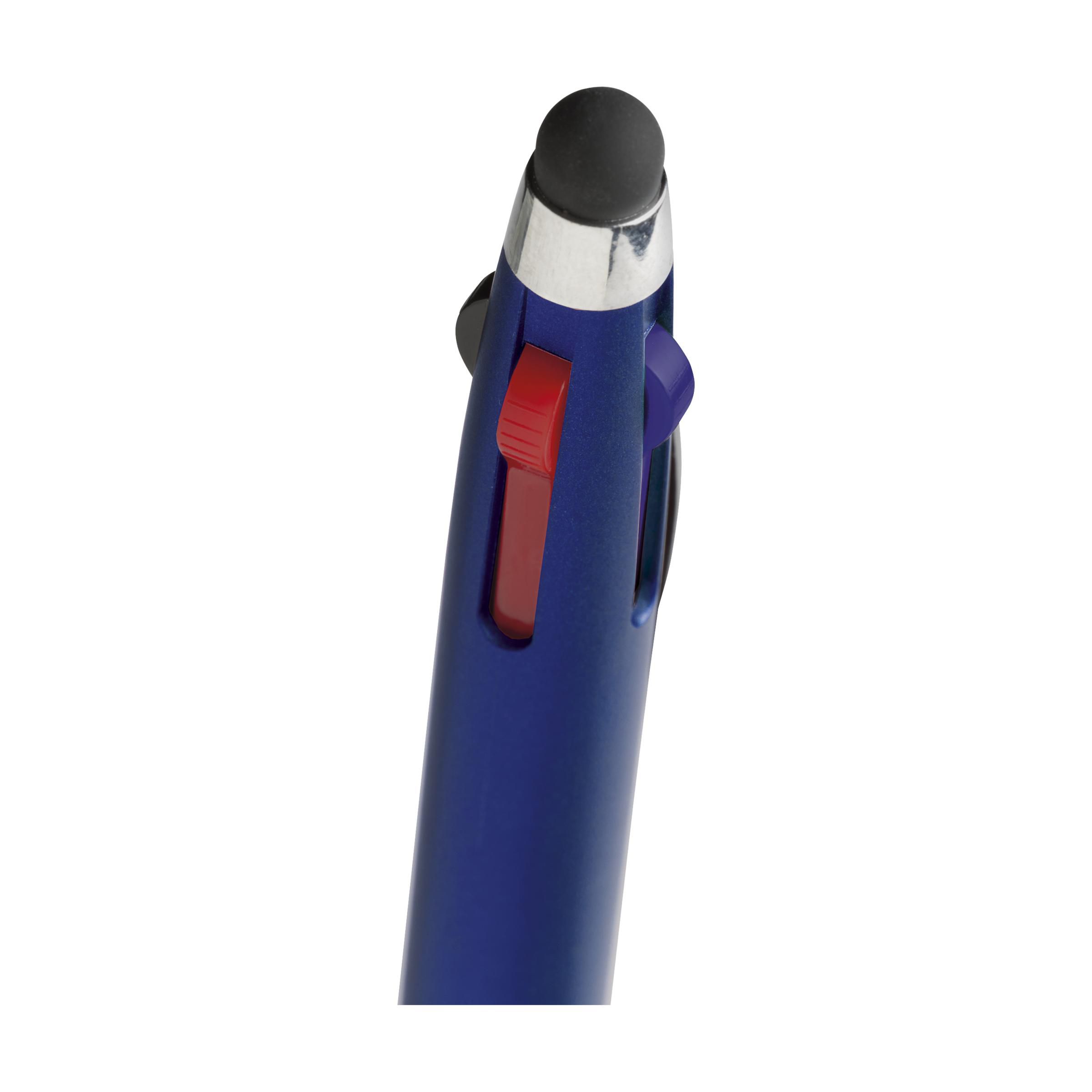 3-colour ballpoint pen with rubber top/pointer to operate touch screens (eg iPhone/iPad), metallic look holder, silver accents and rubber grip. Equipped with a blue, red and black fill.