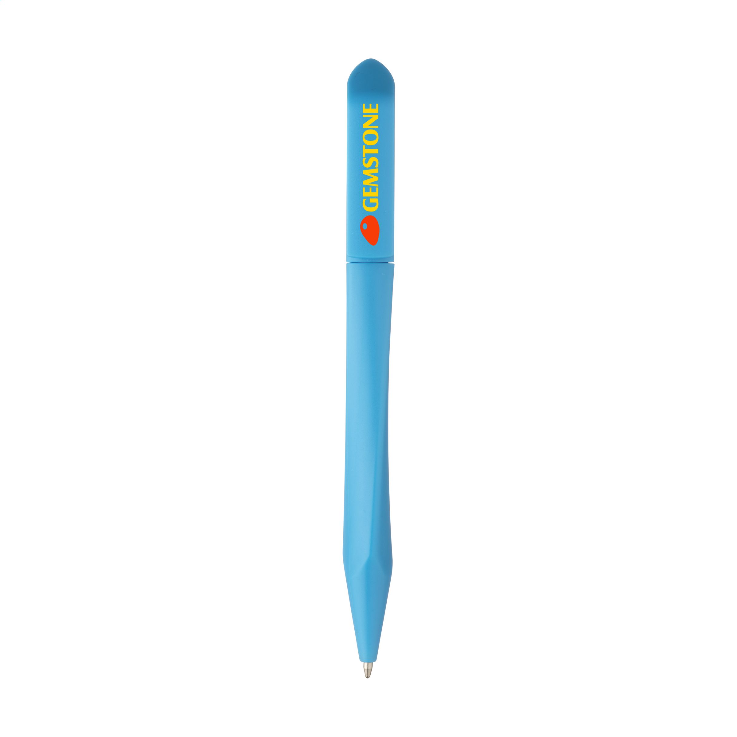 Blue ink writing ballpoint pen with barrel in striking triangle shape with a playful twist, handy twist mechanism and a generous clip.