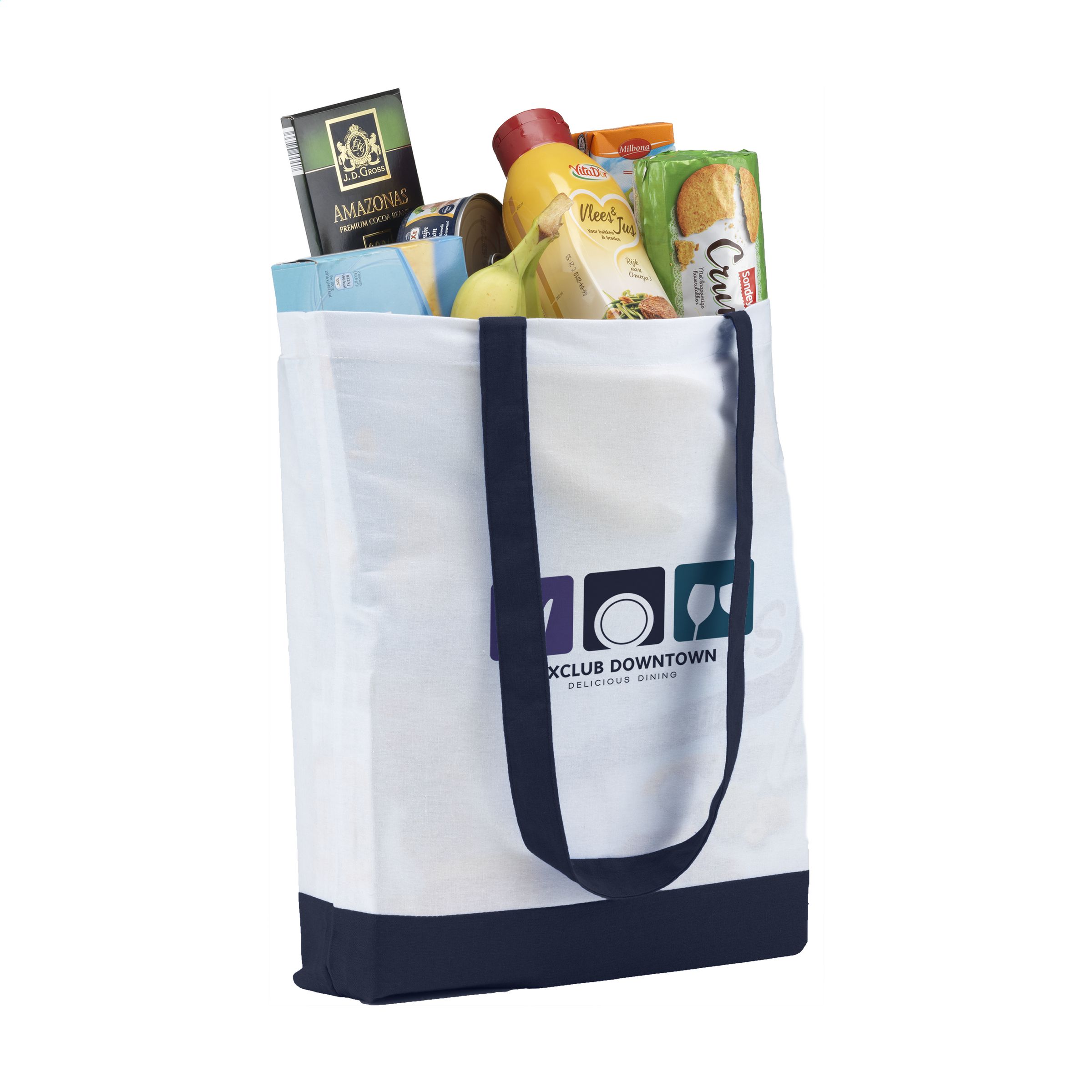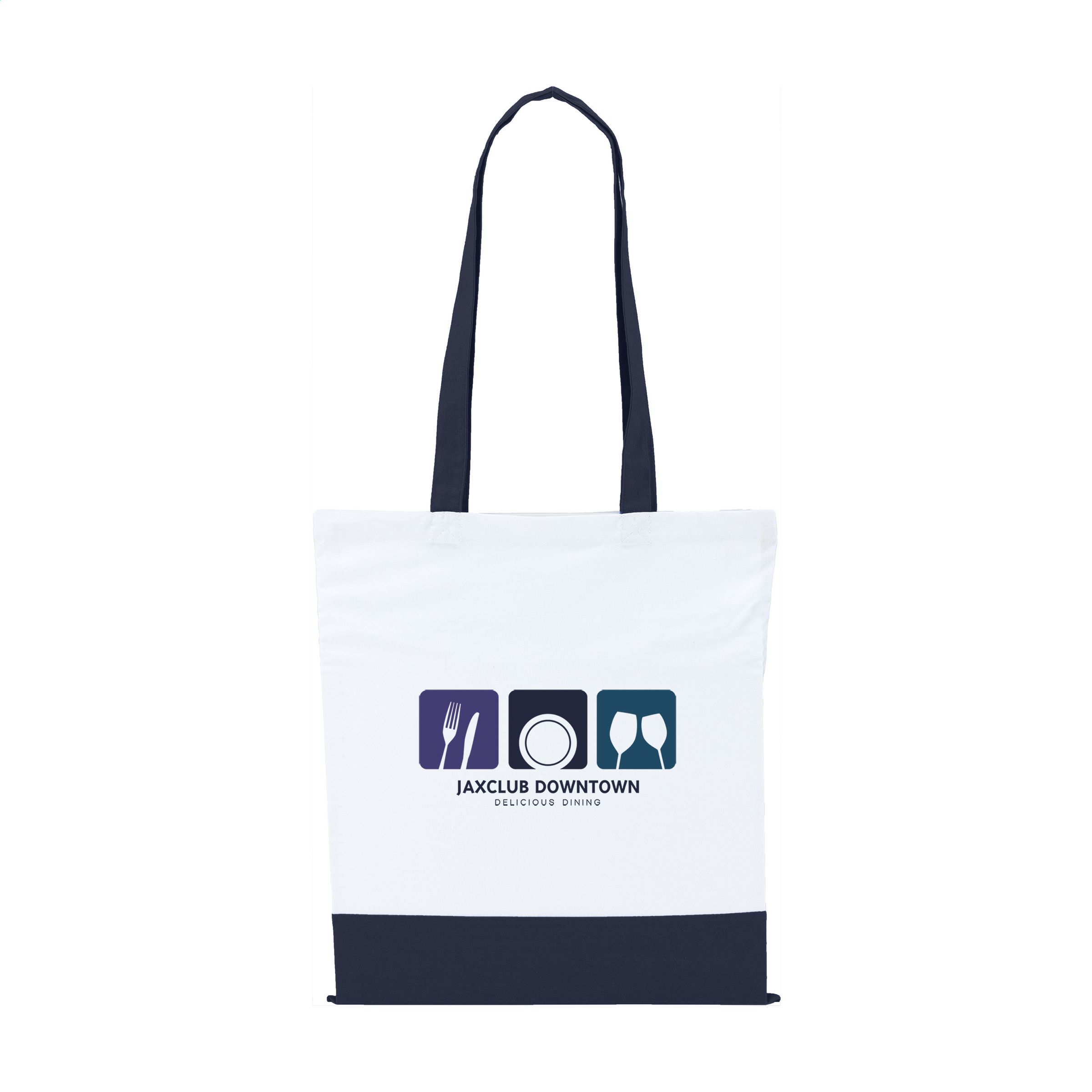White shopper with colour accent. Made of 100% pliant cotton (125 g/m²). With long handles.