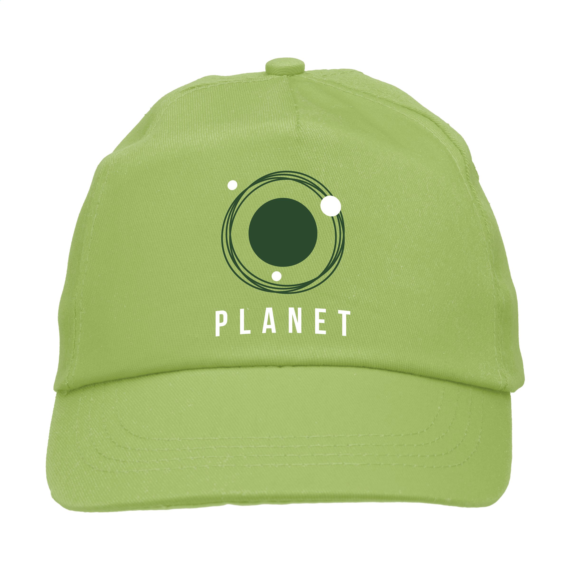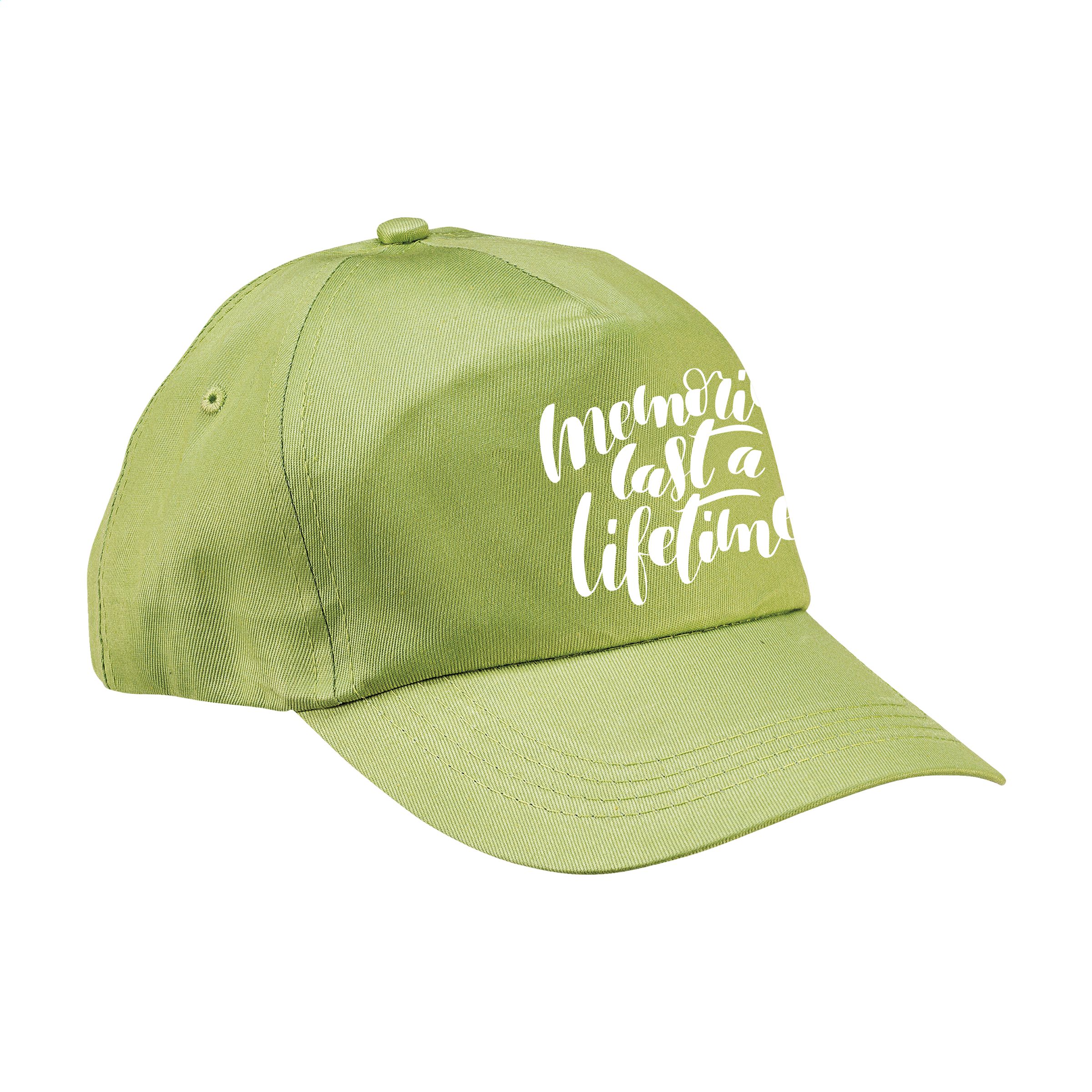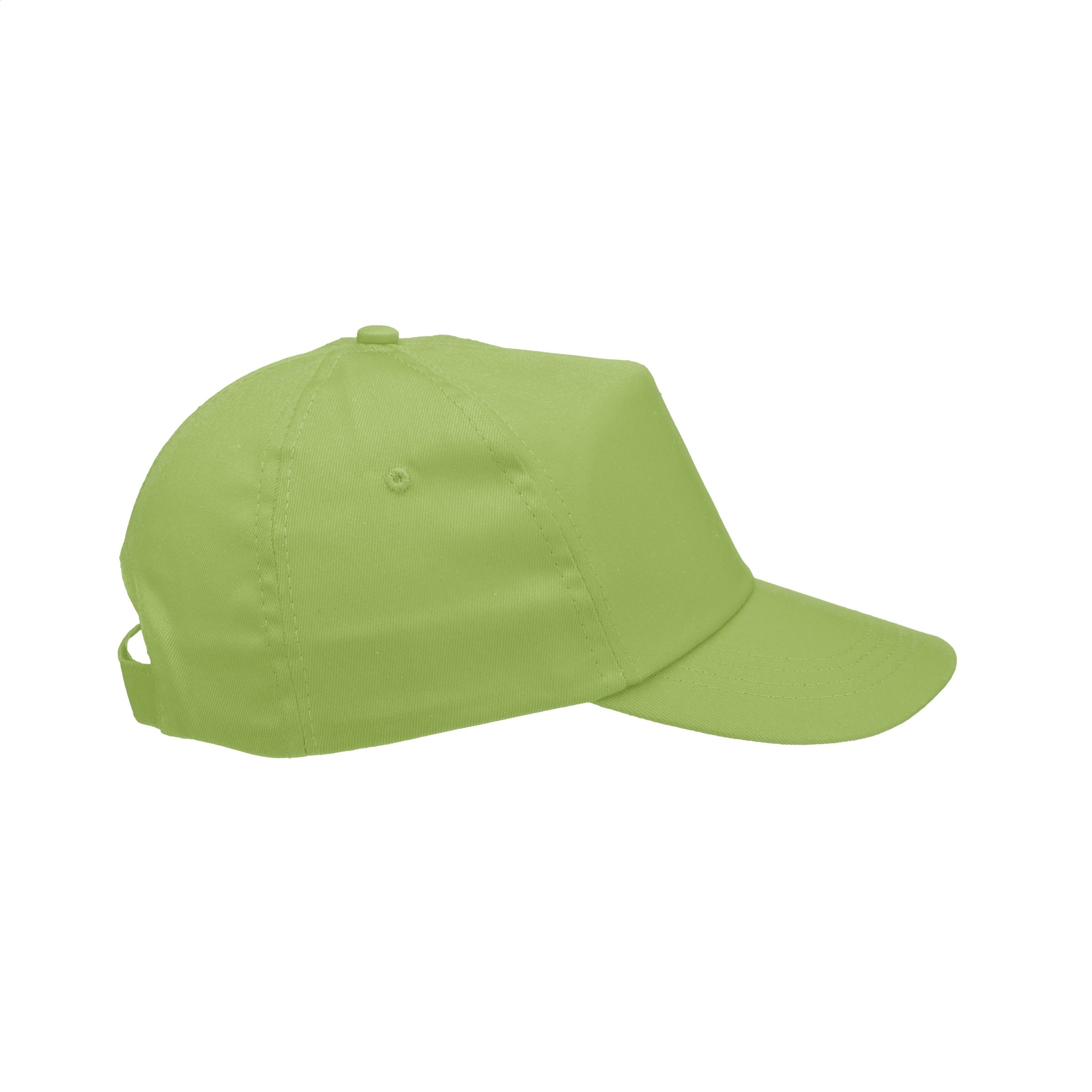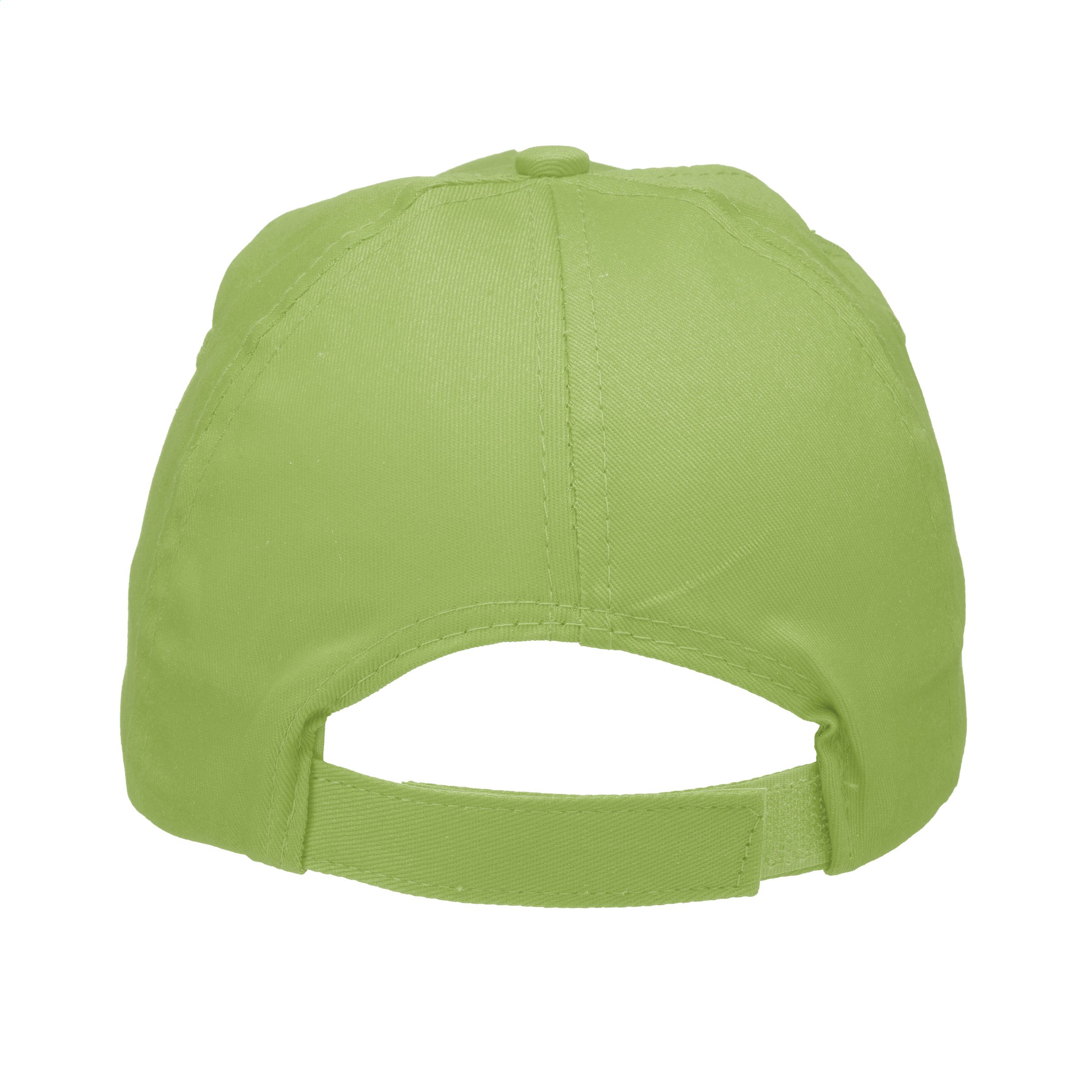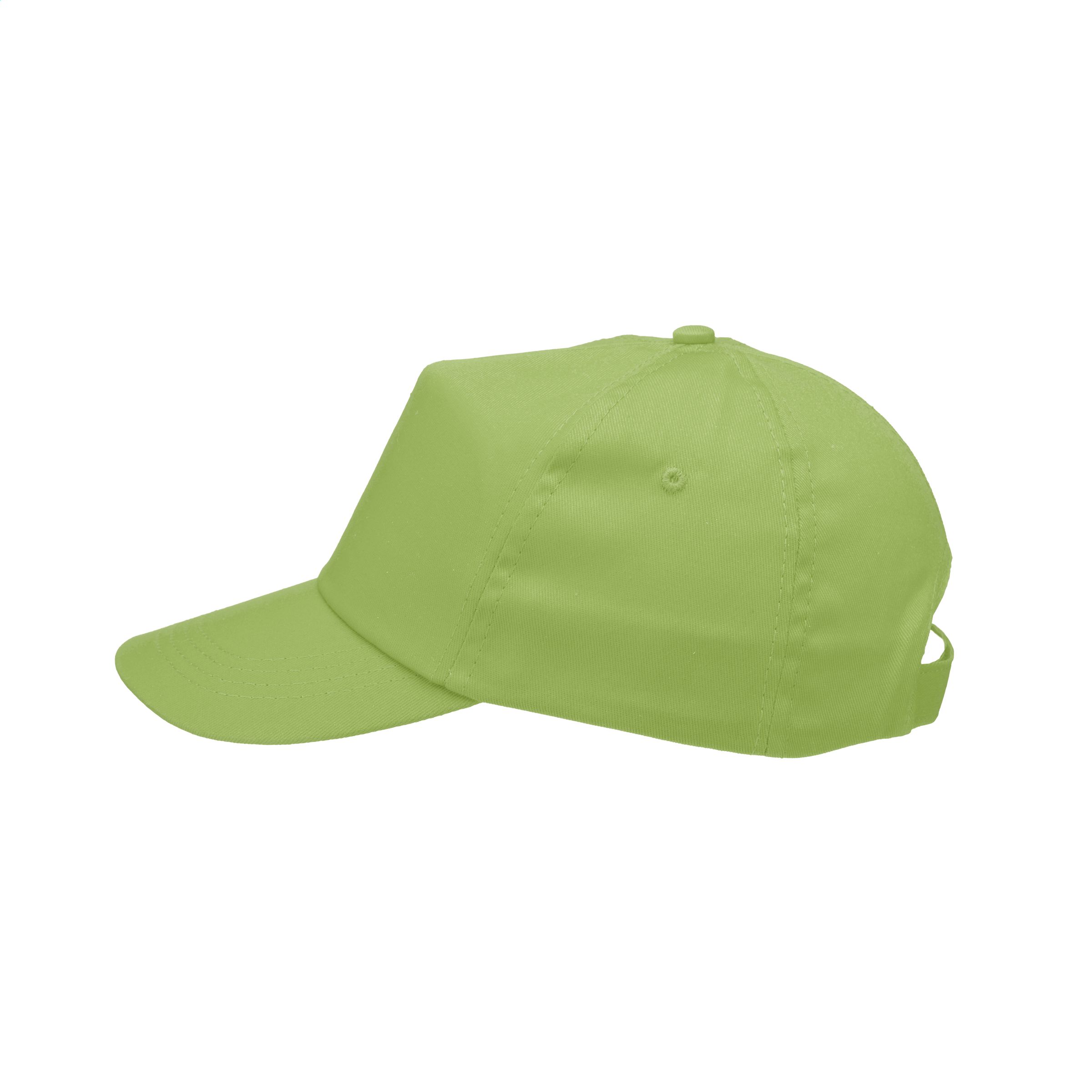 Baseball cap made of 100% cotton with pre-shaped peak and adjustable strap.