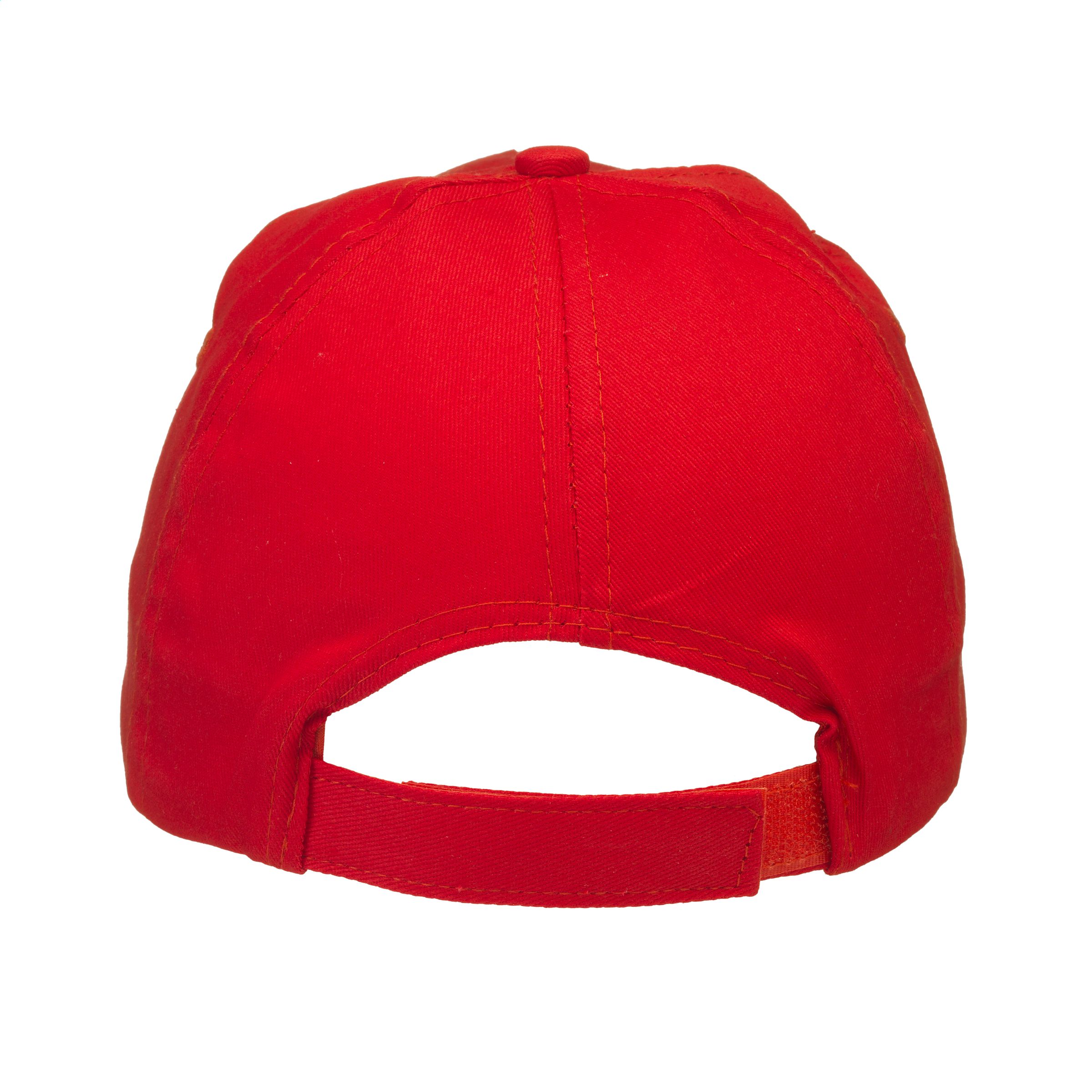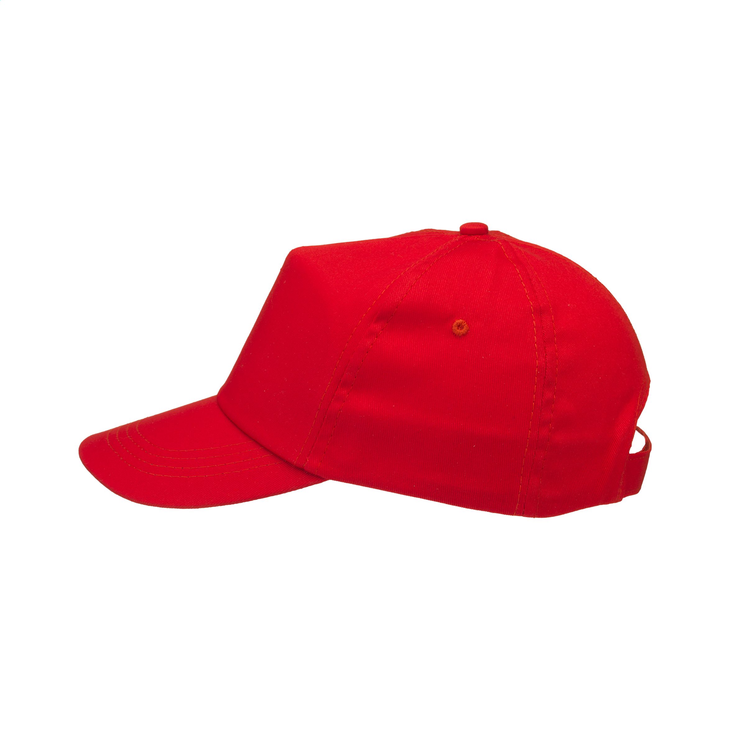 Baseball cap made of 100% cotton with pre-shaped peak and adjustable strap.