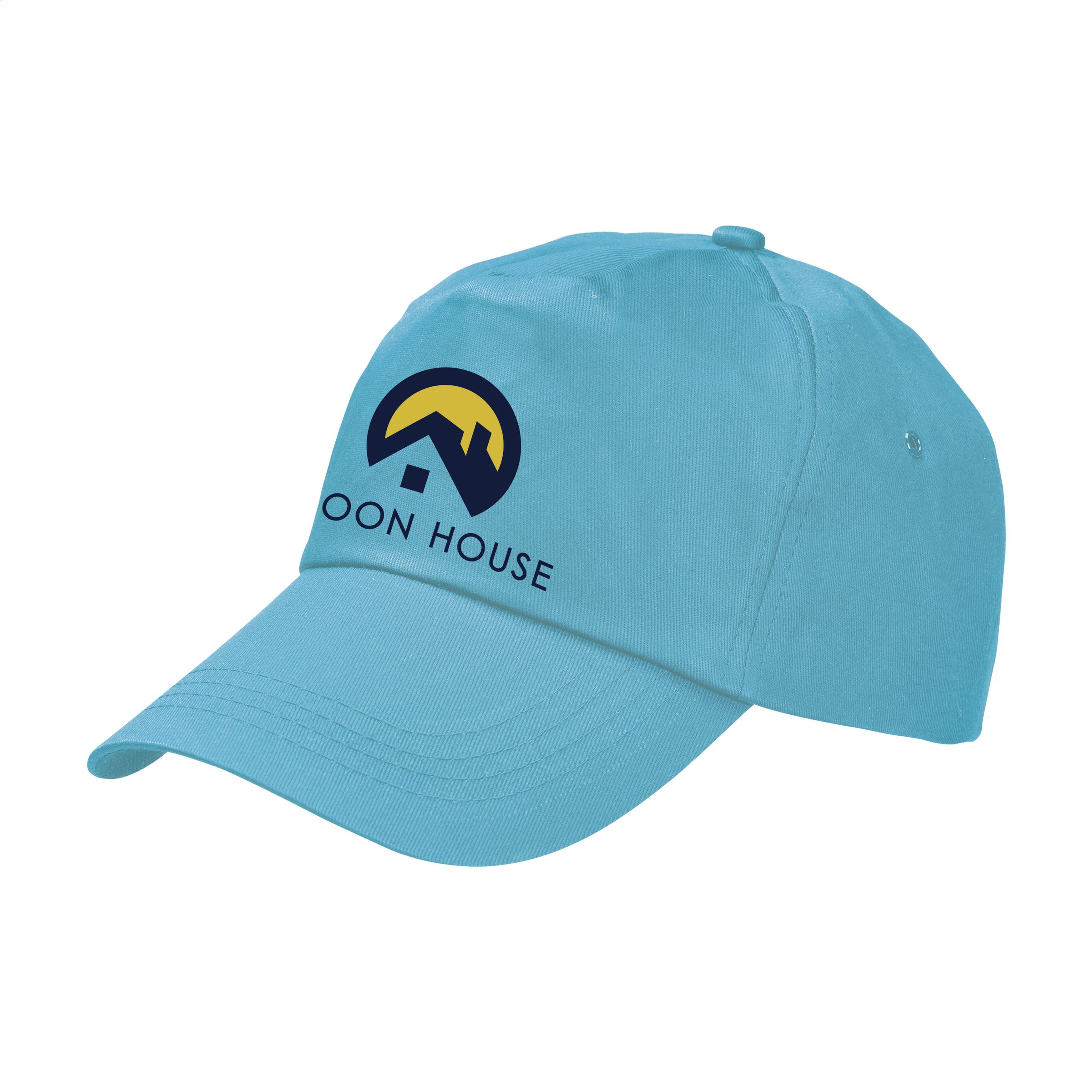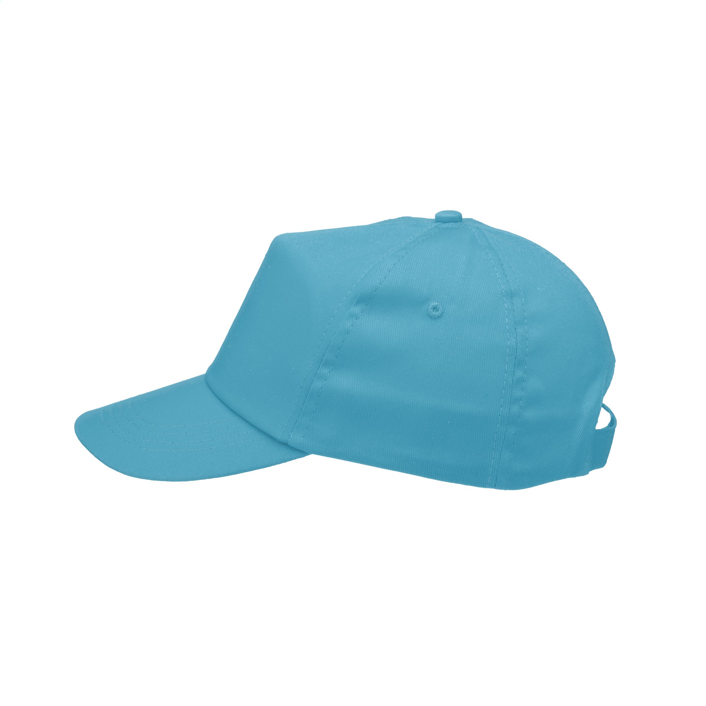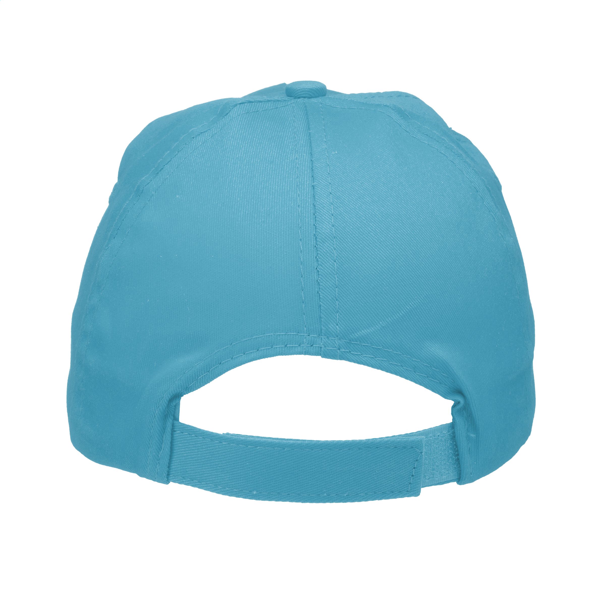 Baseball cap made of 100% cotton with pre-shaped peak and adjustable strap.
