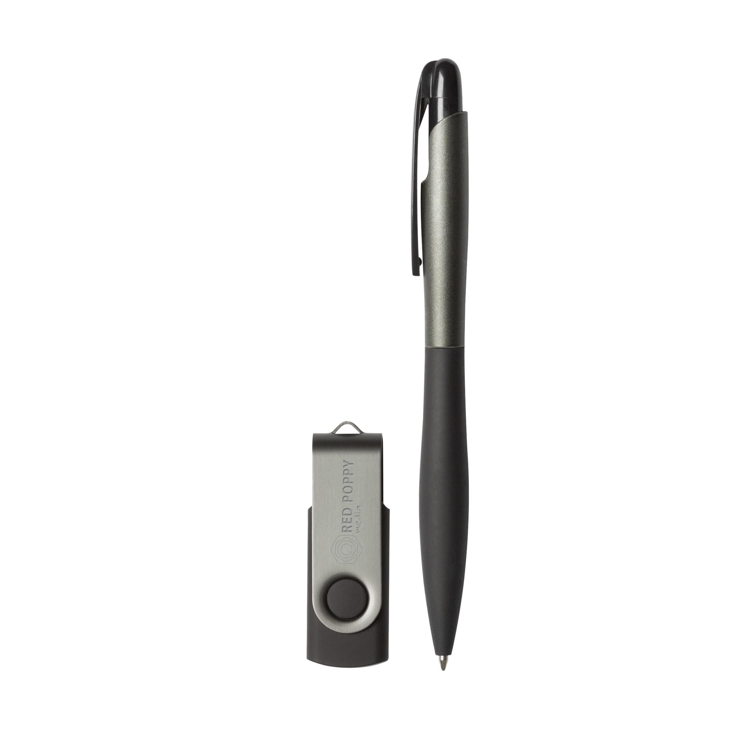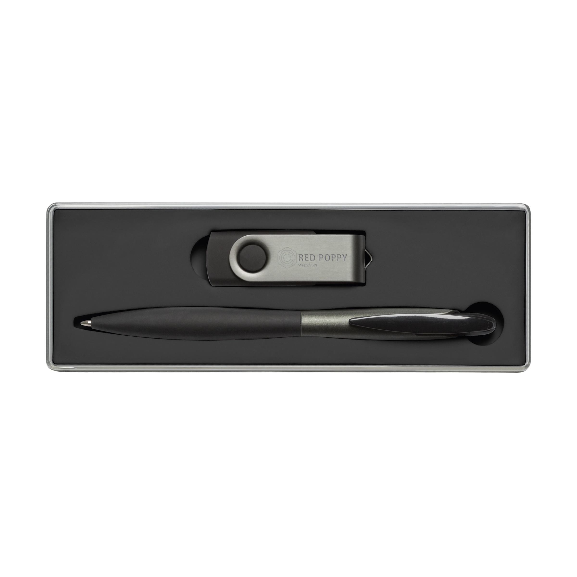 2-piece gift set consisting of a blue ink, sleek ballpoint pen with rubber grip and a convenient USB flash drive with a capacity of 4 GB. Each set in box.