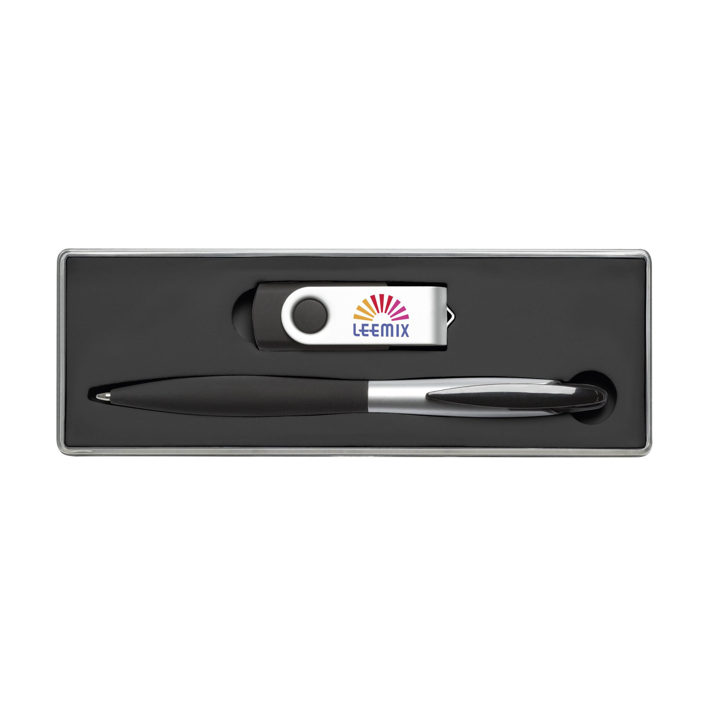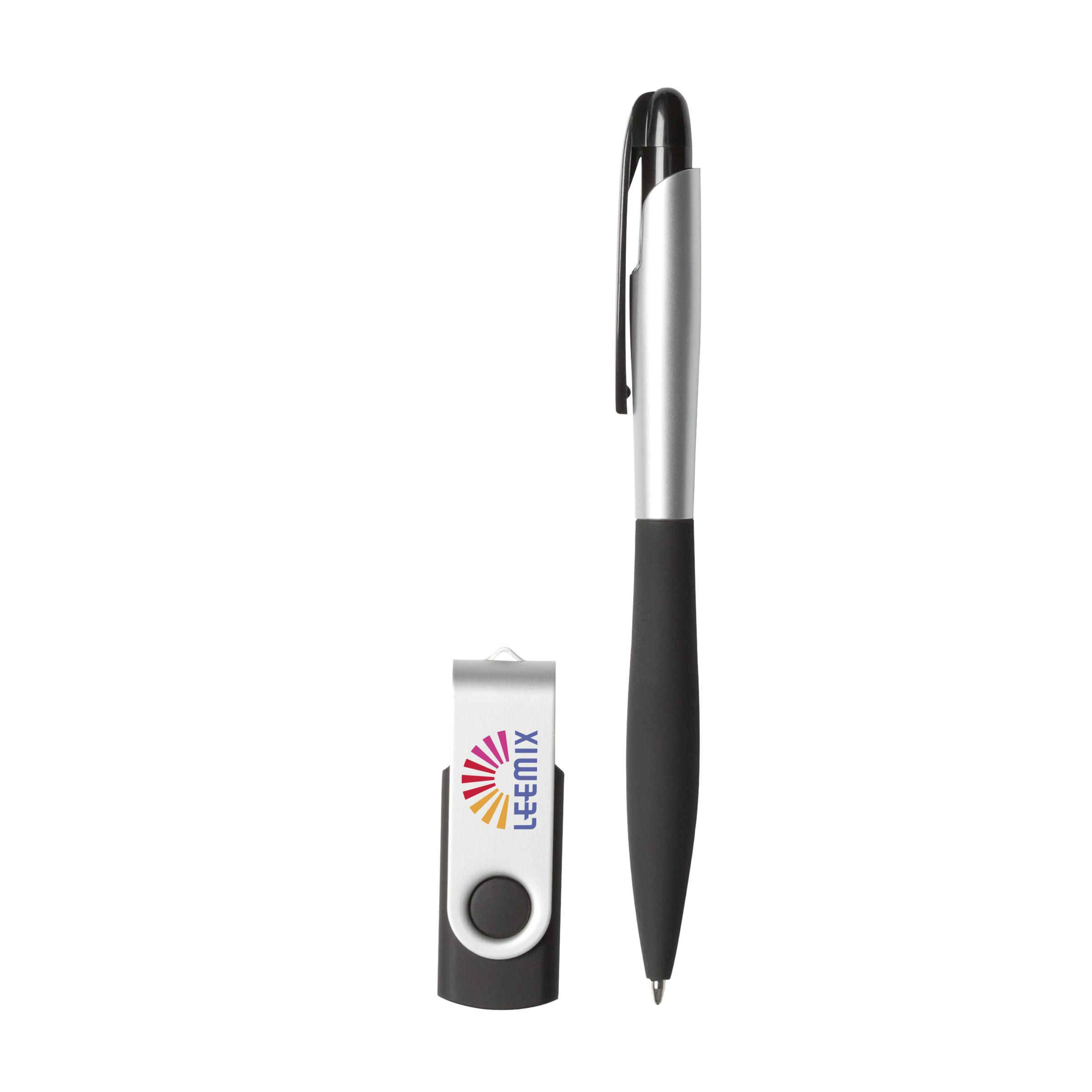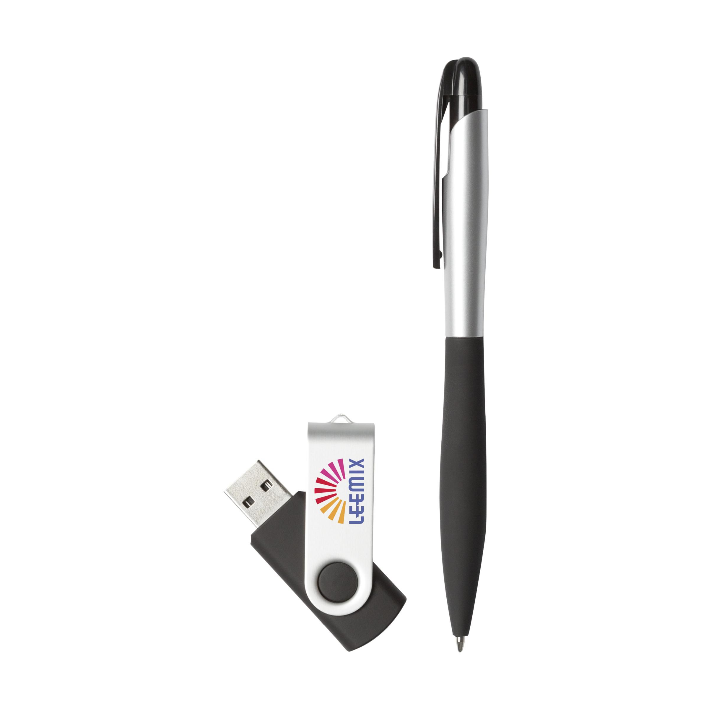 2-piece gift set consisting of a blue ink, sleek ballpoint pen with rubber grip and a convenient USB flash drive with a capacity of 4 GB. Each set in box.