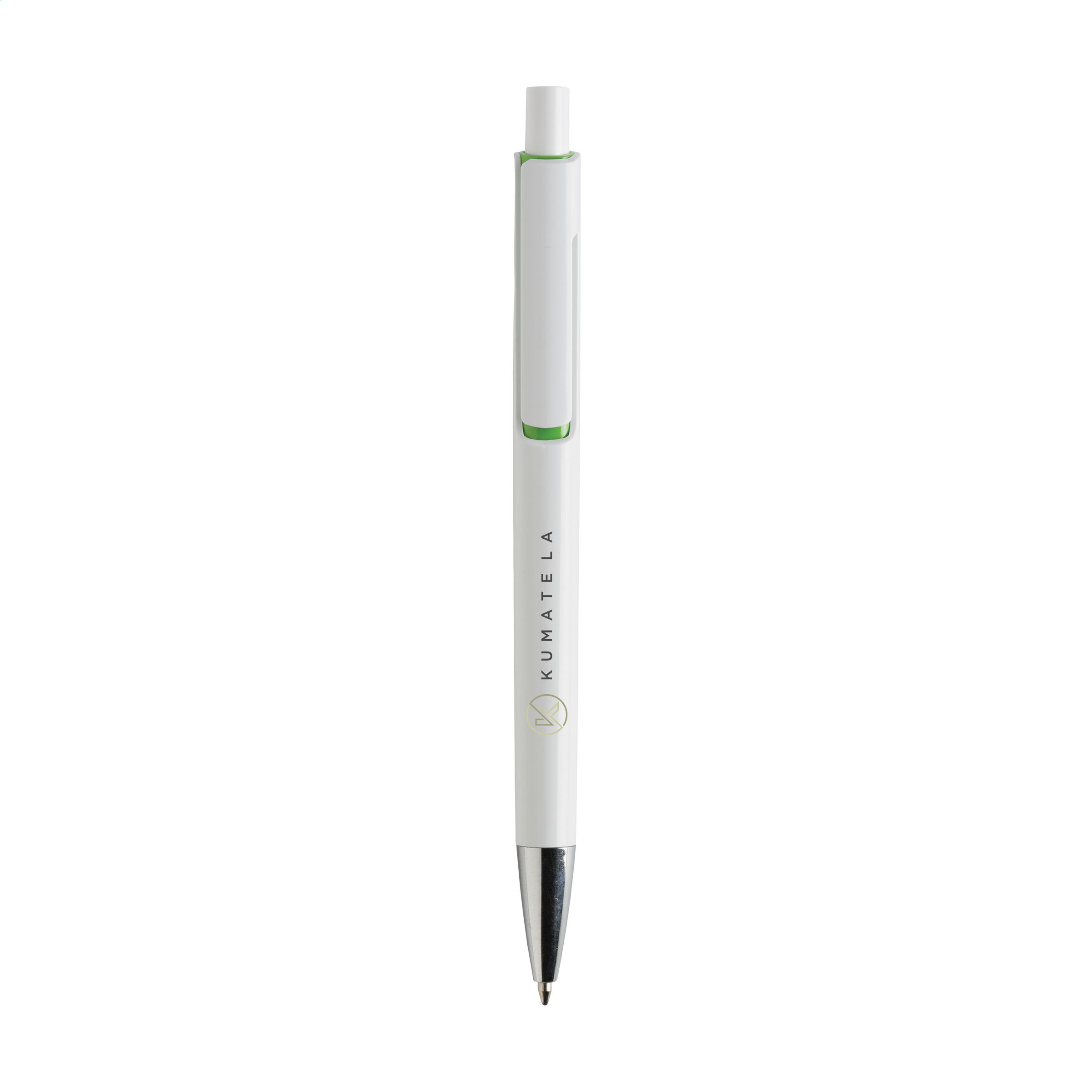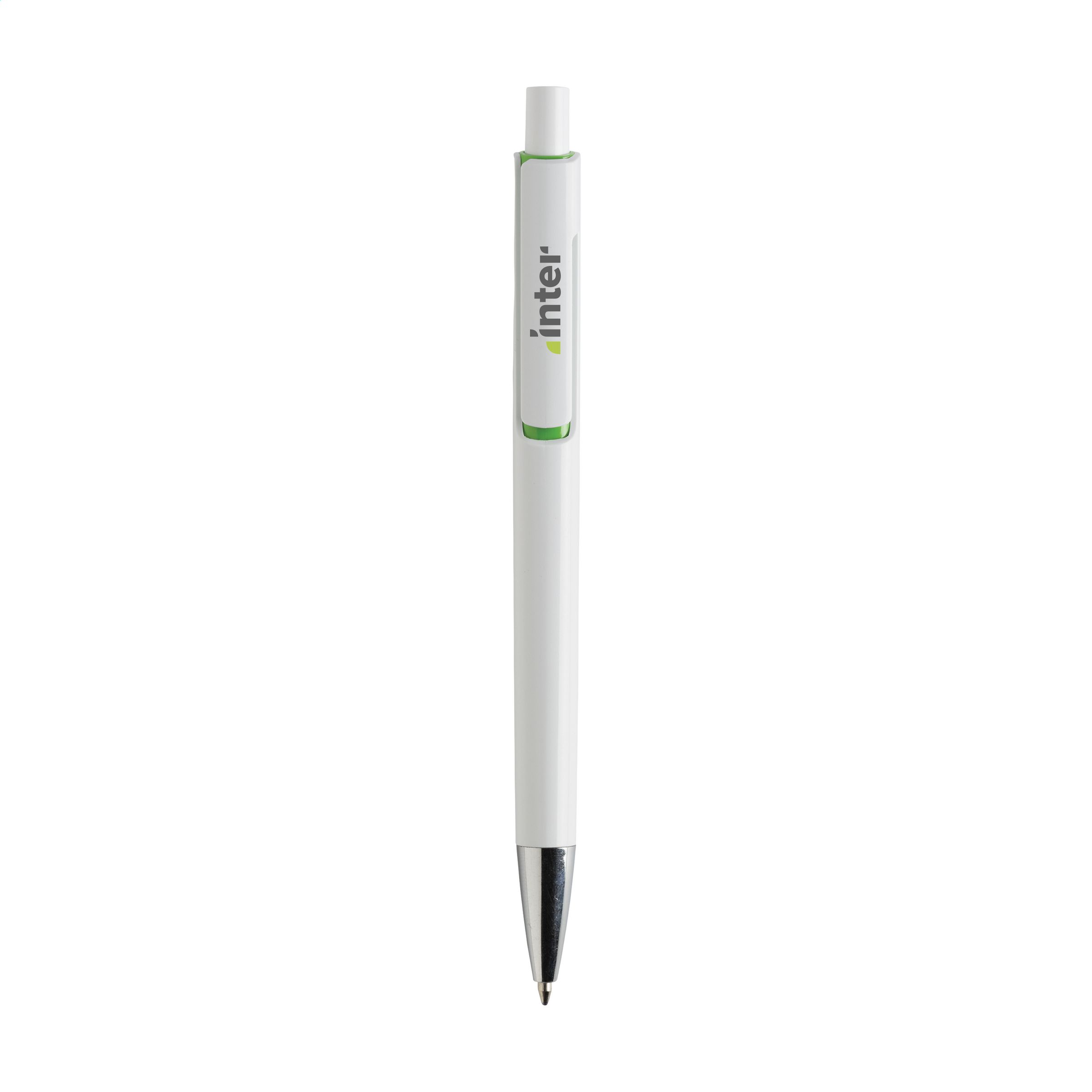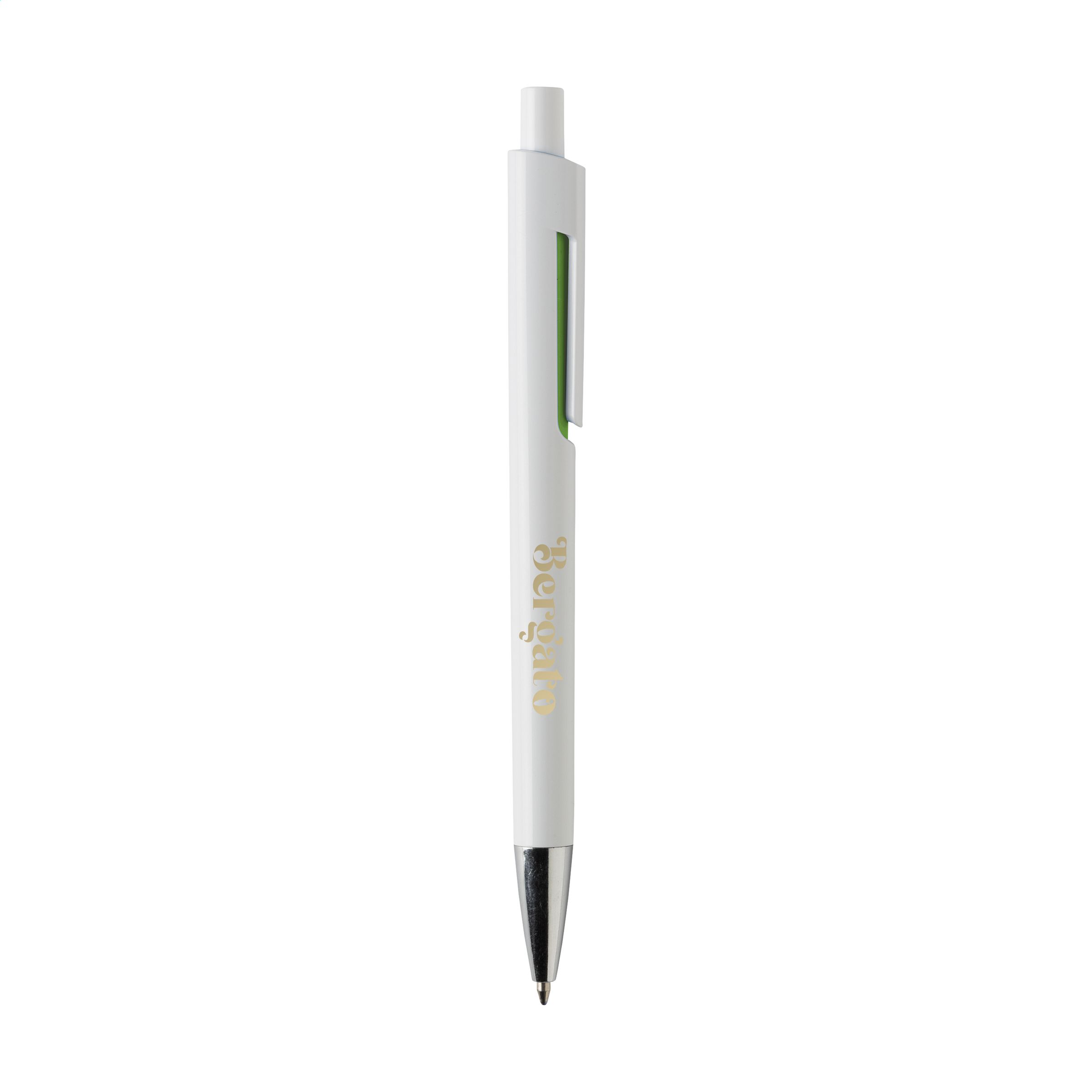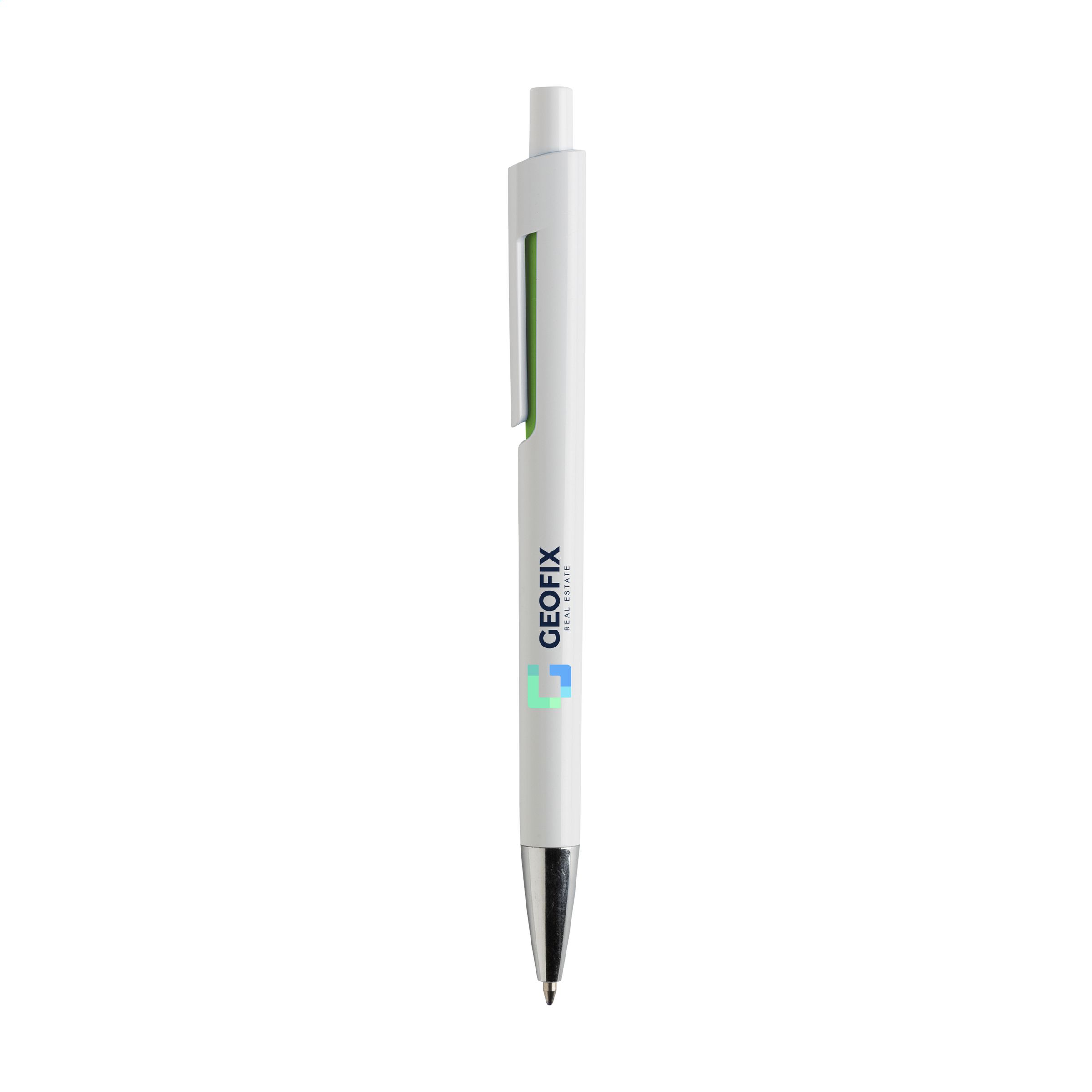 Blue ink ballpoint pen with unique design: the barrel and clip of this pen is designed in one piece. With colourful accent under the optical ‘floating’ clip.
