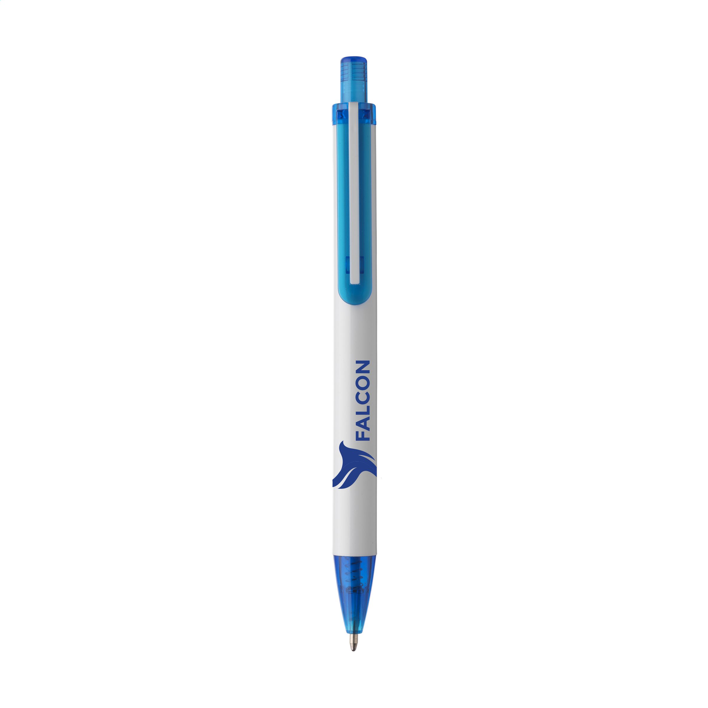 Blue ink ballpoint pen with a transparent coloured button, point and clip with a white stripe as striking detail.