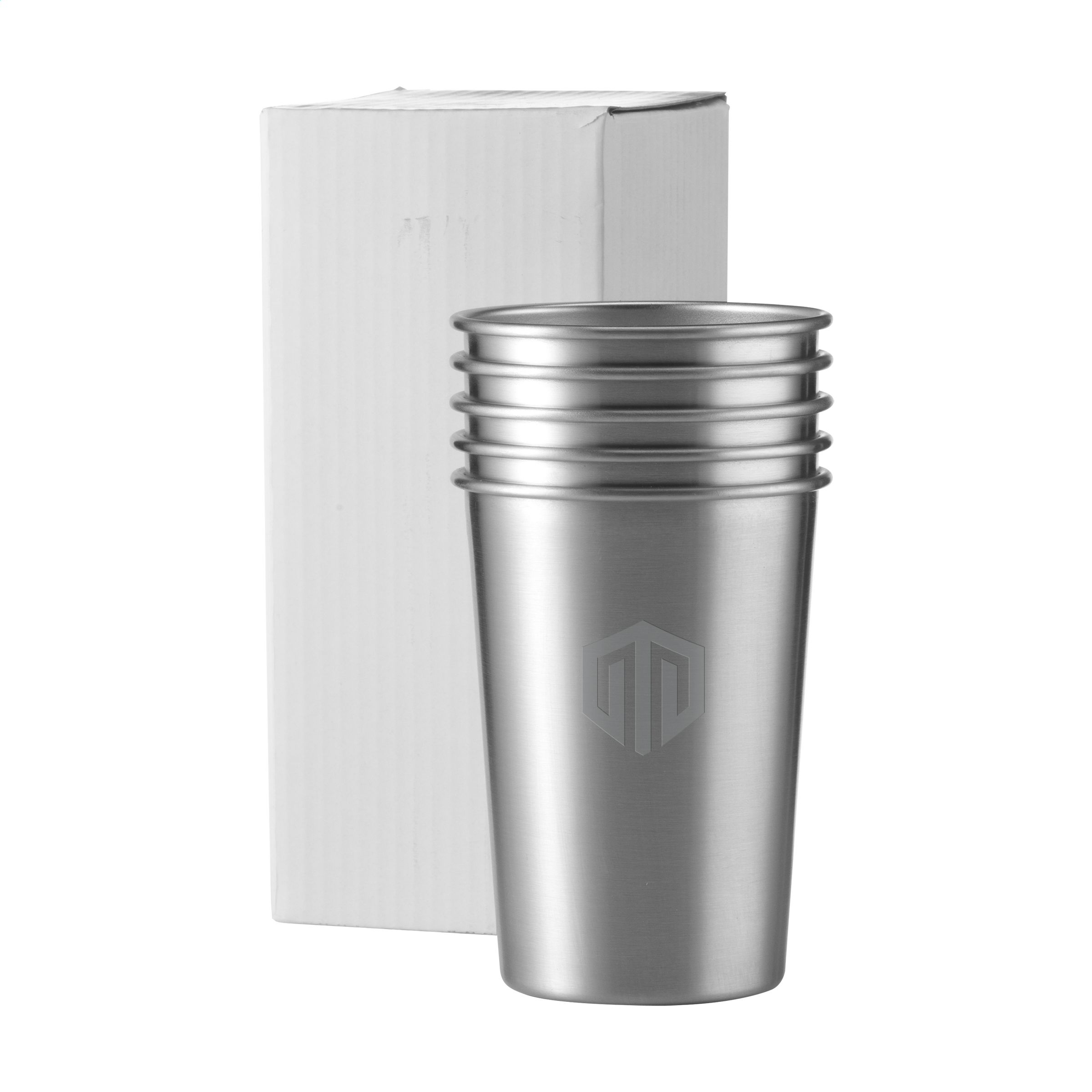 Indestructible, reusable stainless steel drinking cup. Single-walled. Capacity 350 ml. Packed per 5 pieces in a box.
