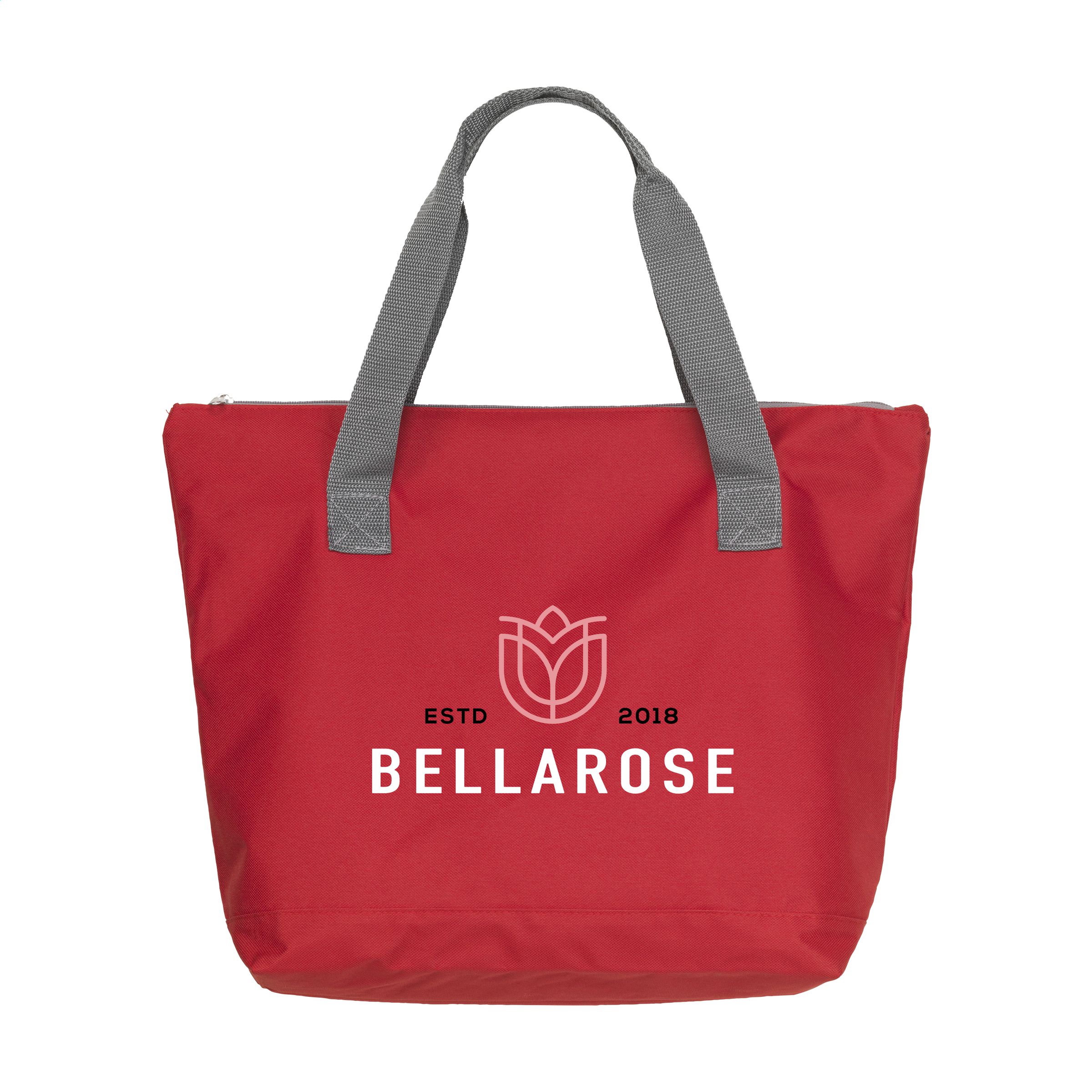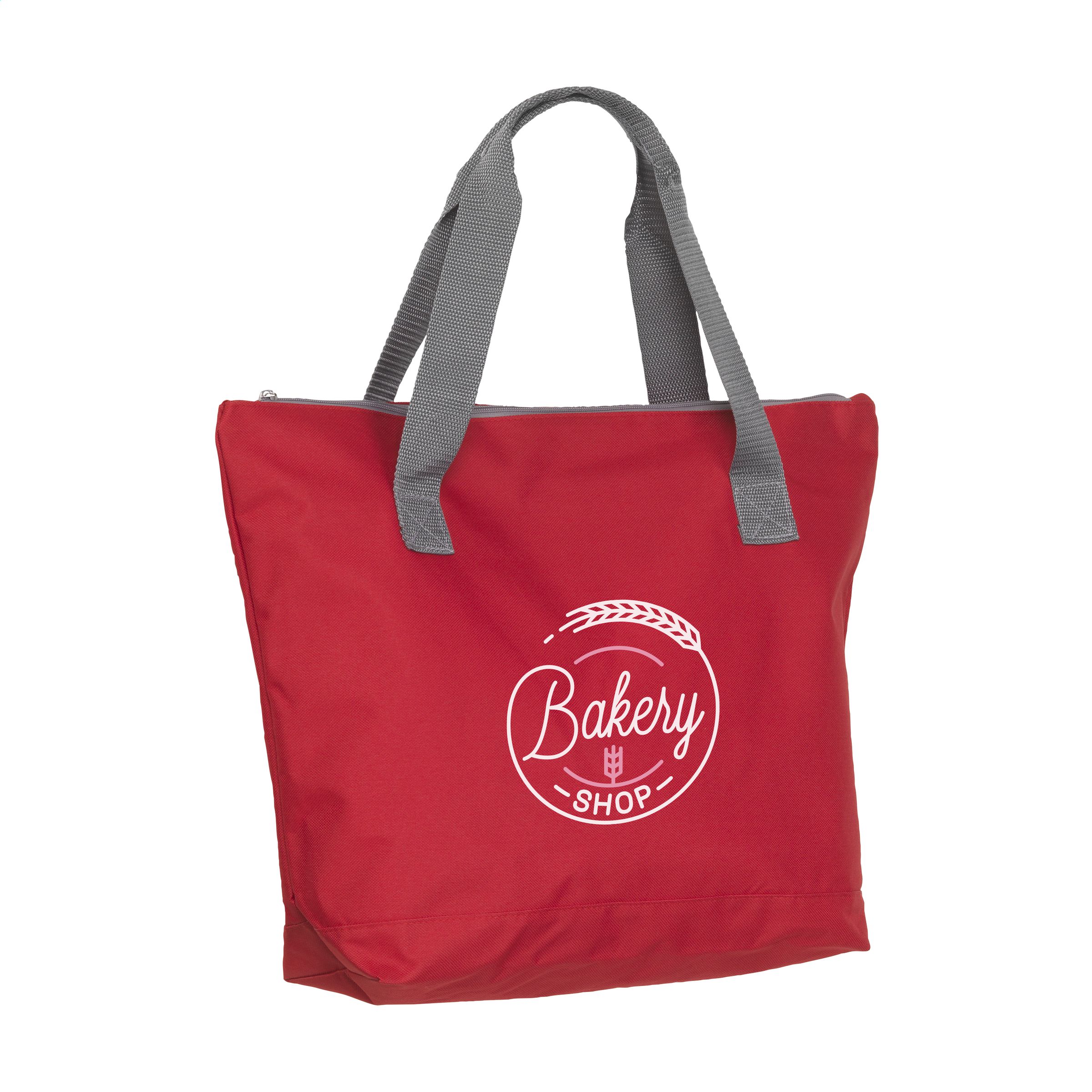 Shopping bag made of 600 D polyester with sturdy handles and zip fastener.