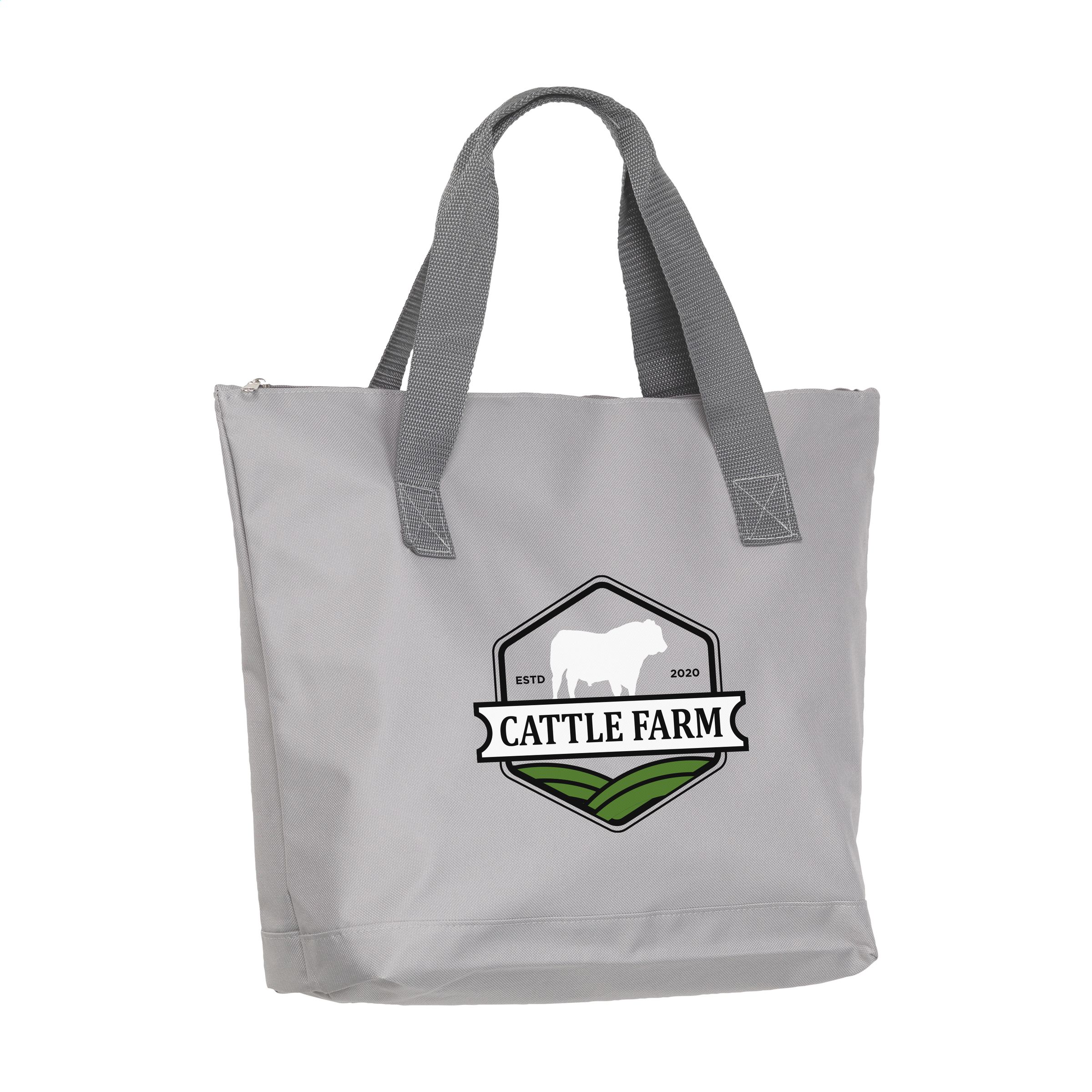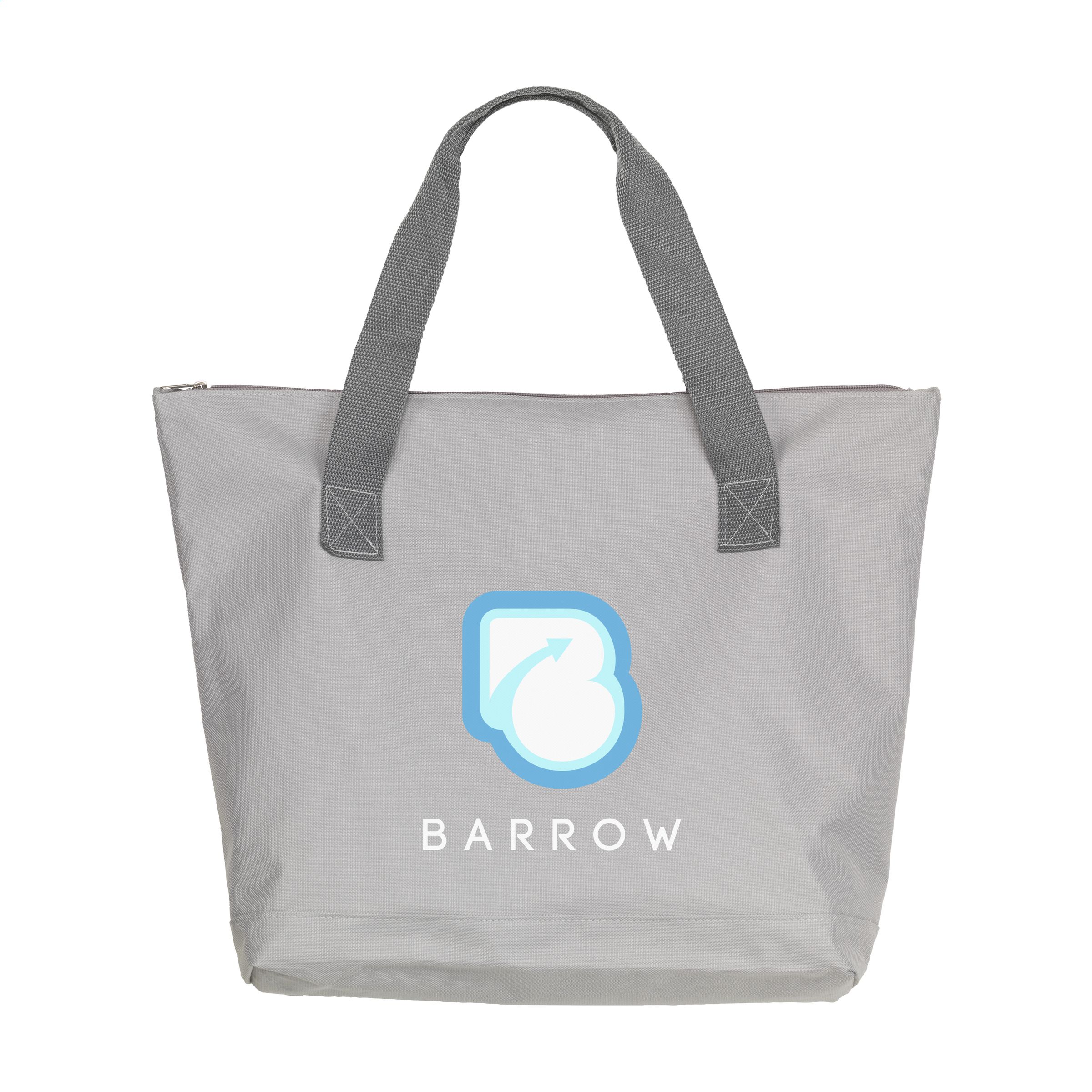 Shopping bag made of 600 D polyester with sturdy handles and zip fastener.